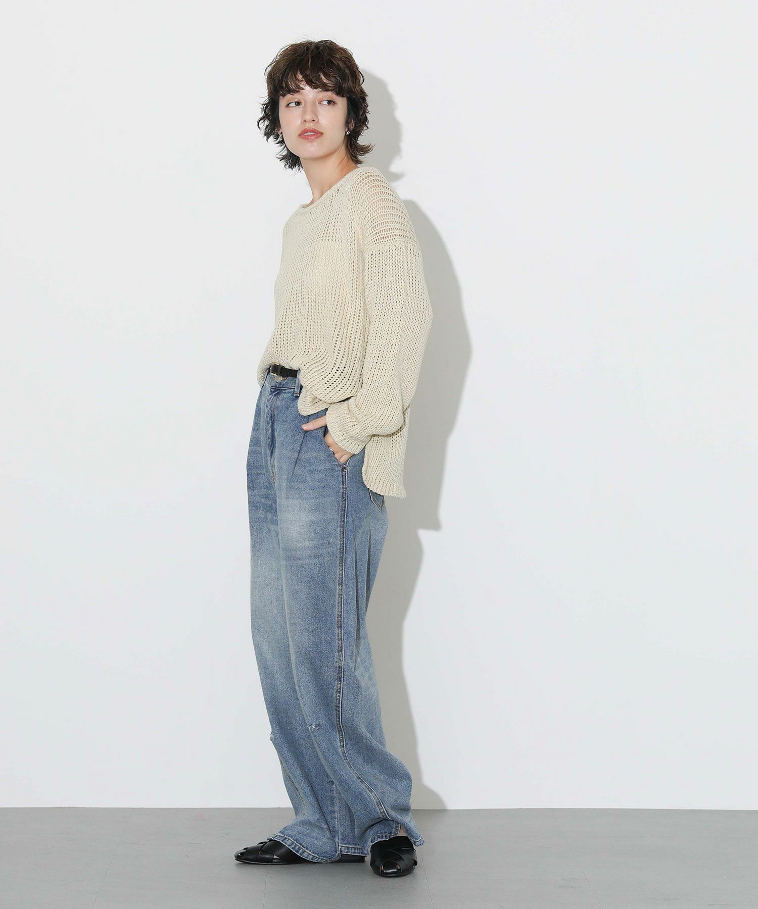 シンプルながらも着こなしのポイントになる1枚です。 手編みならではのざっくり感も魅力。ゆったりとした シルエットと、インでもアウトでも合わせやすい丈感でボトムを選ばず様々なスタイリングにお使い頂けます。 タンクトップやキャミをレイヤードしたヘルシーな肌見せスタイルがおすすめです。 ワイドレッグのボリューム感のあるパンツ合わせも今年らしさが出て◎