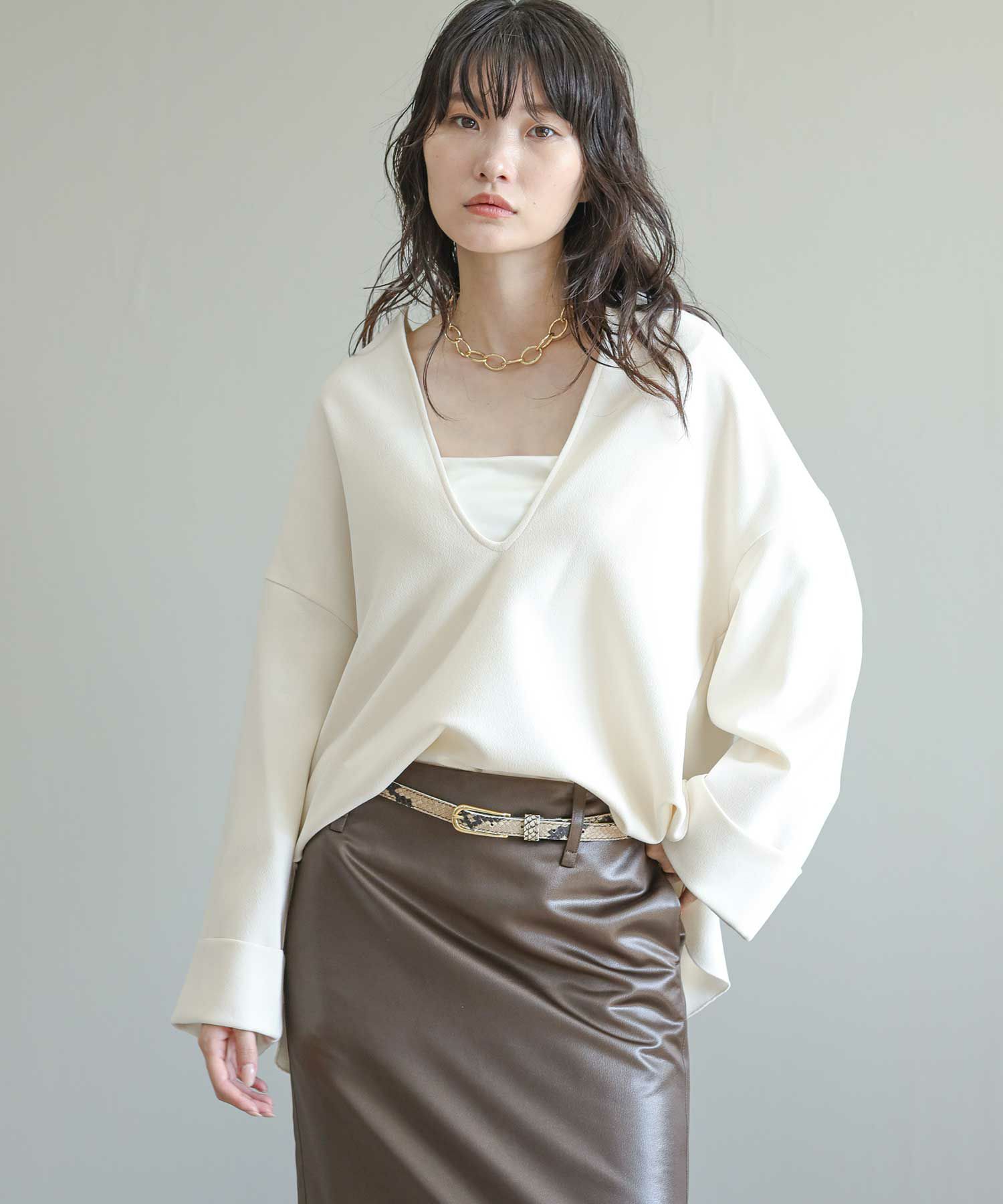滑らかな落ち感のあるアムンゼン素材を使用したスリットブラウス。