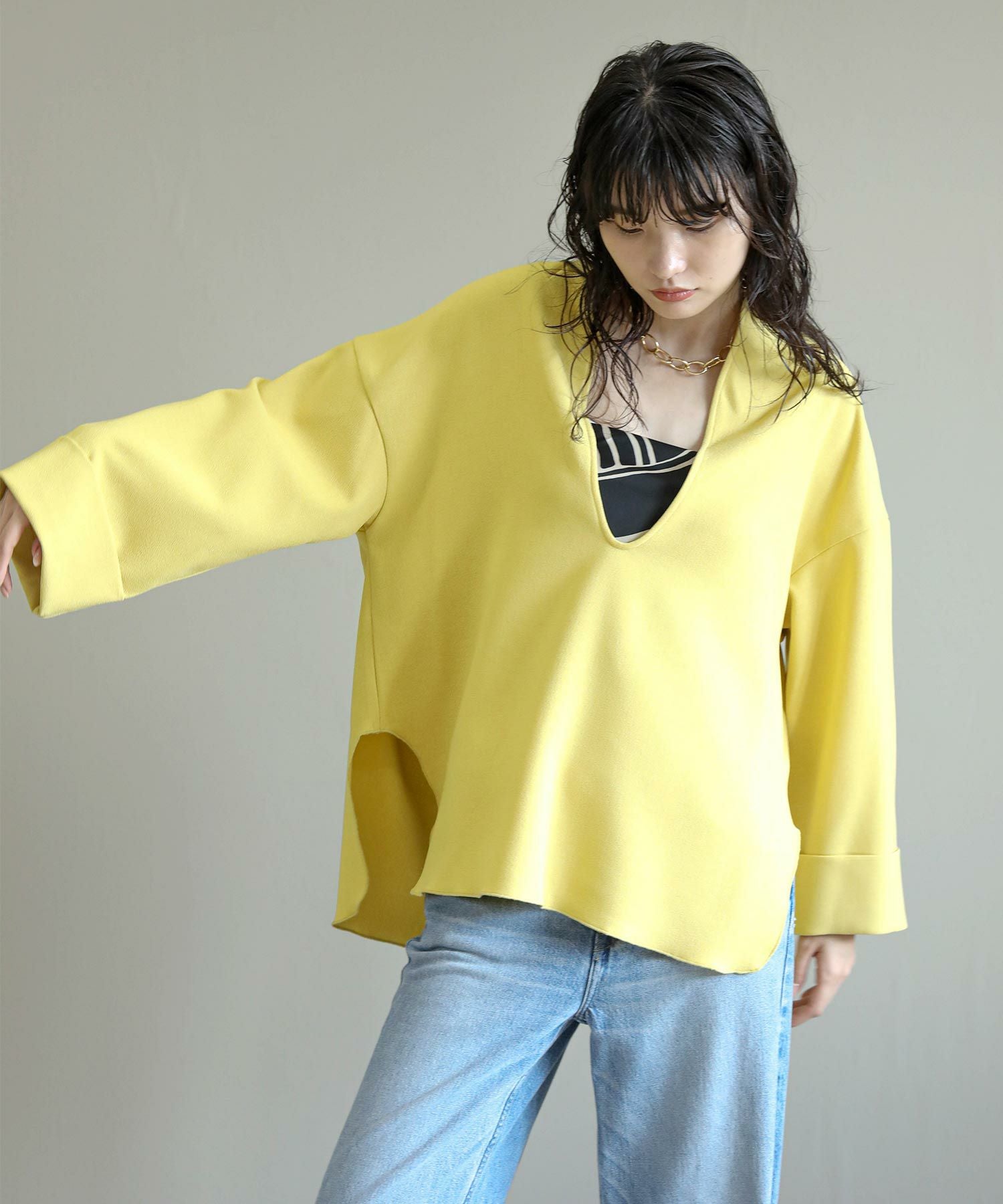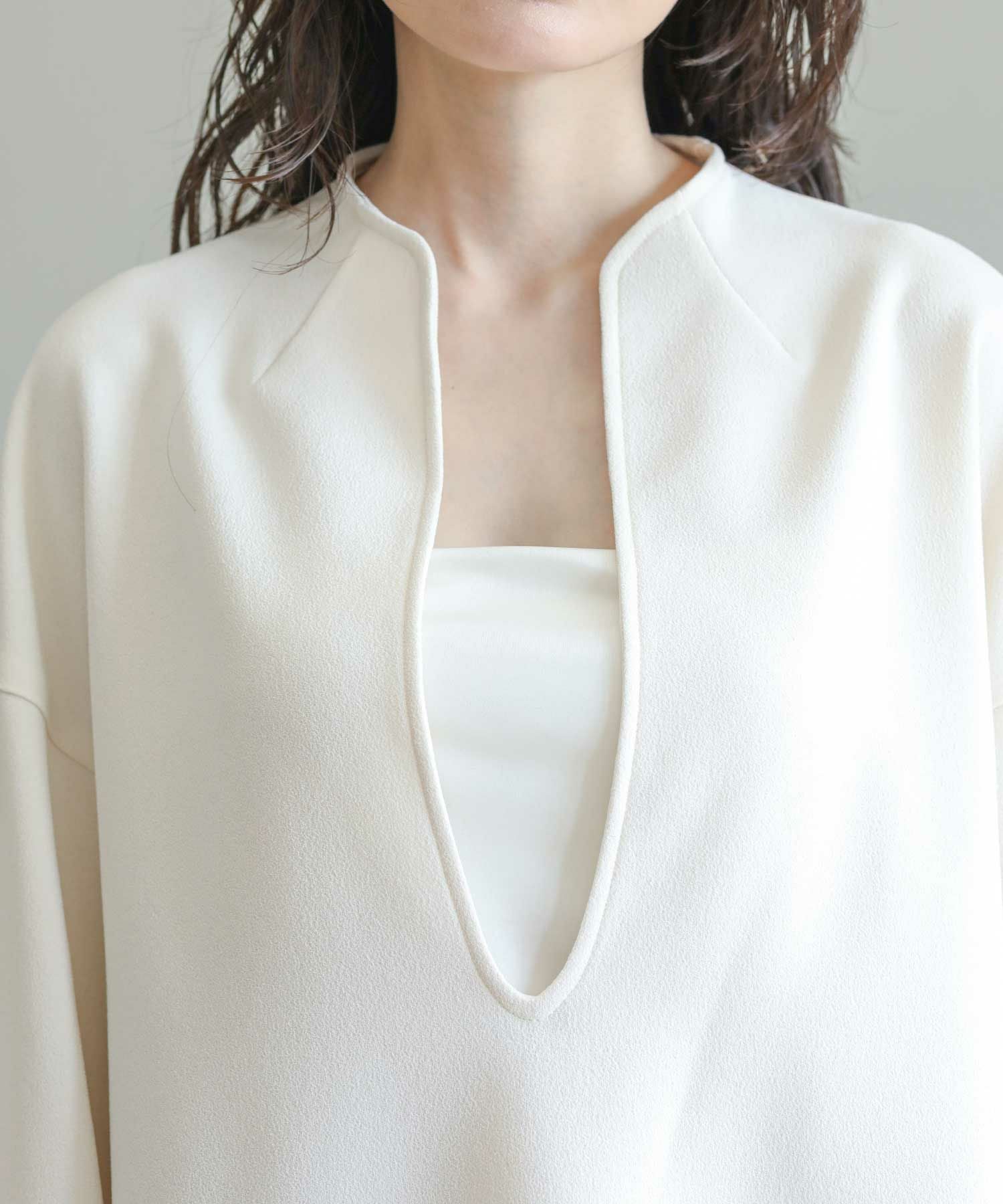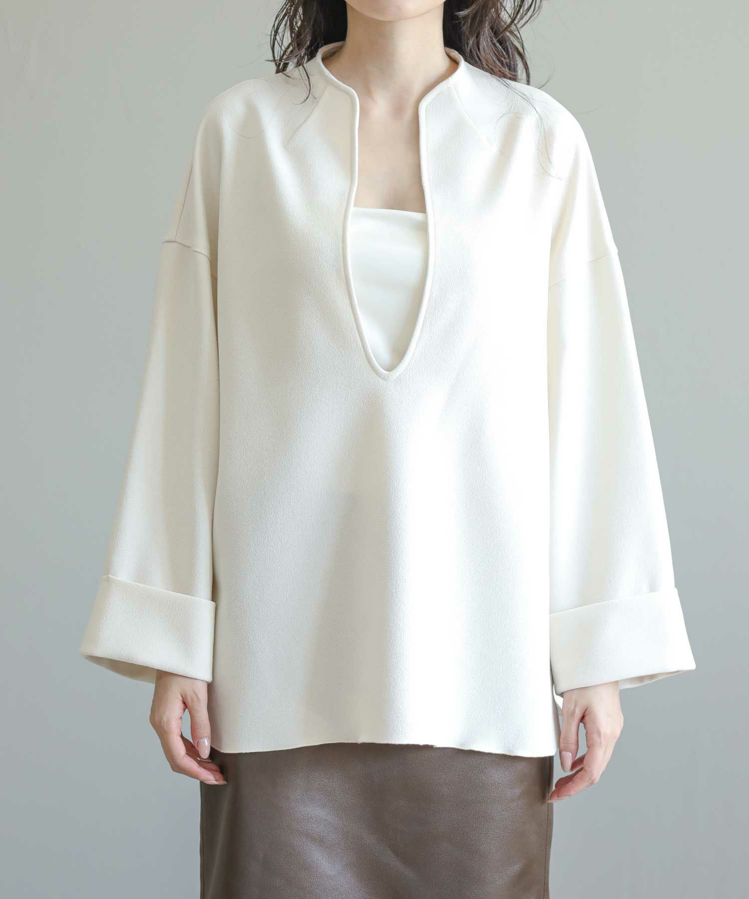 滑らかな落ち感のあるアムンゼン素材を使用したスリットブラウス。