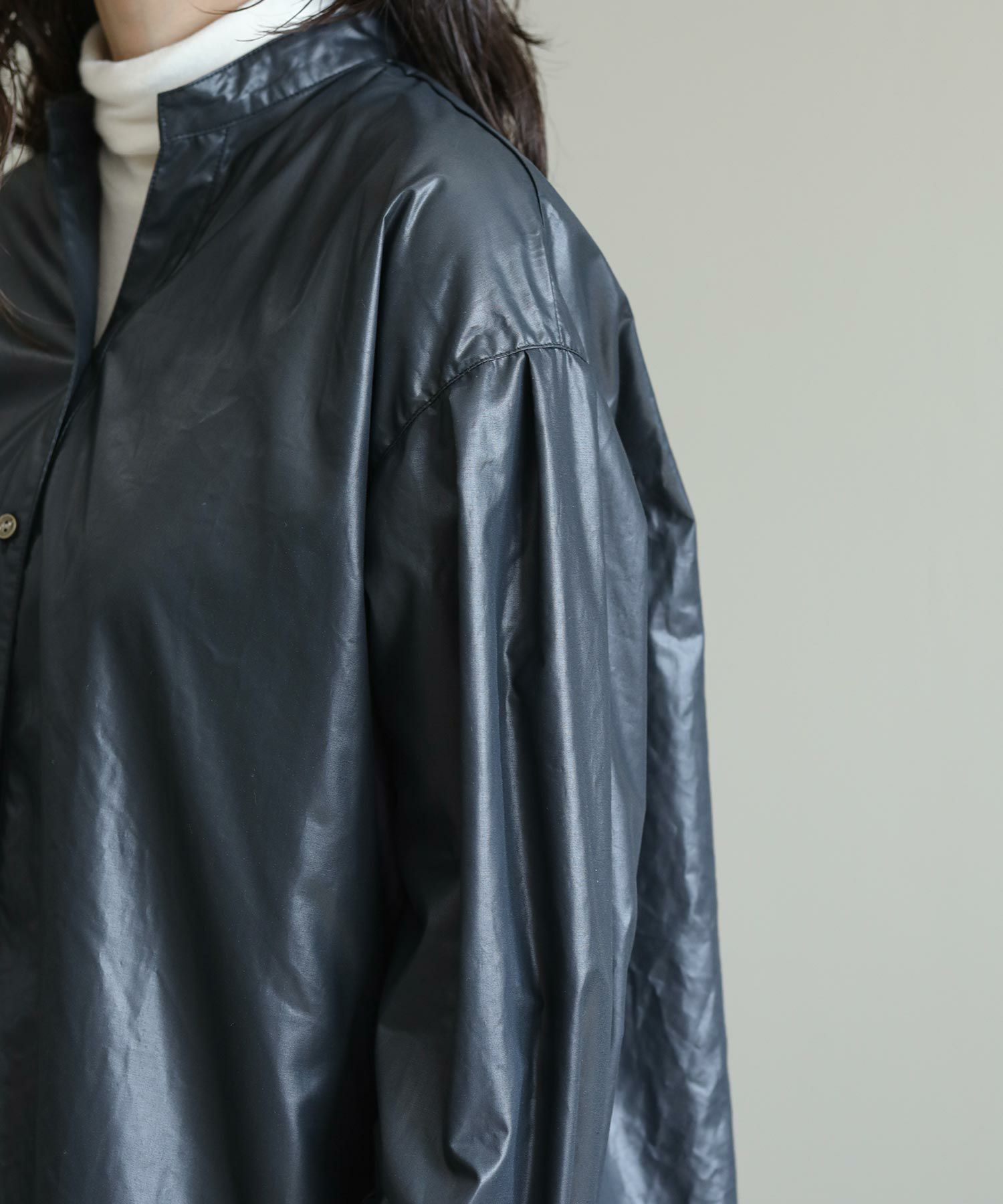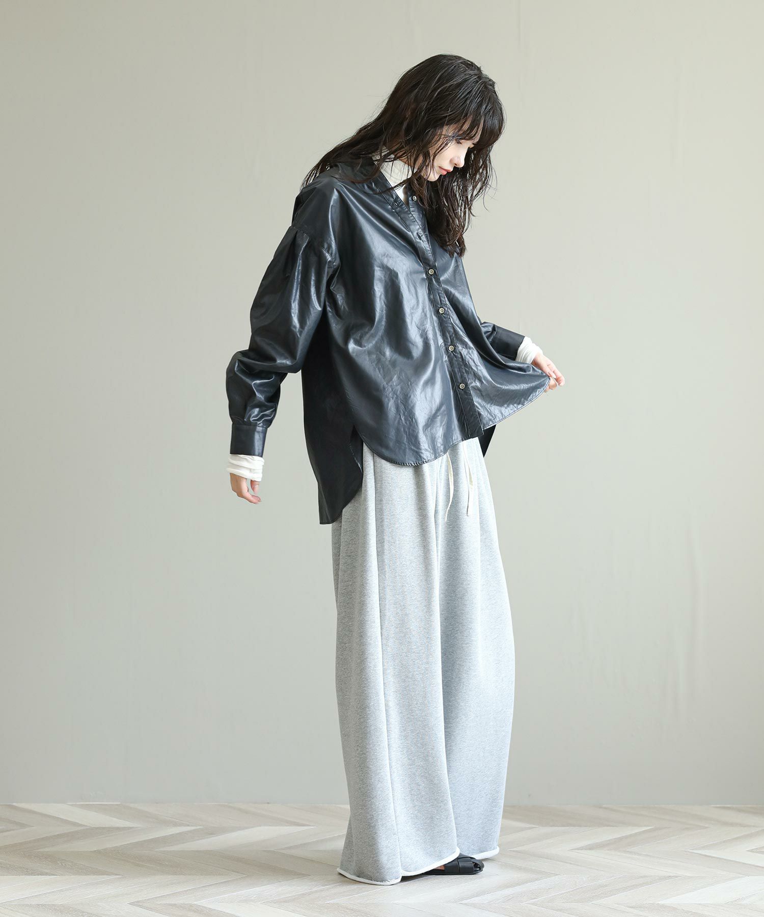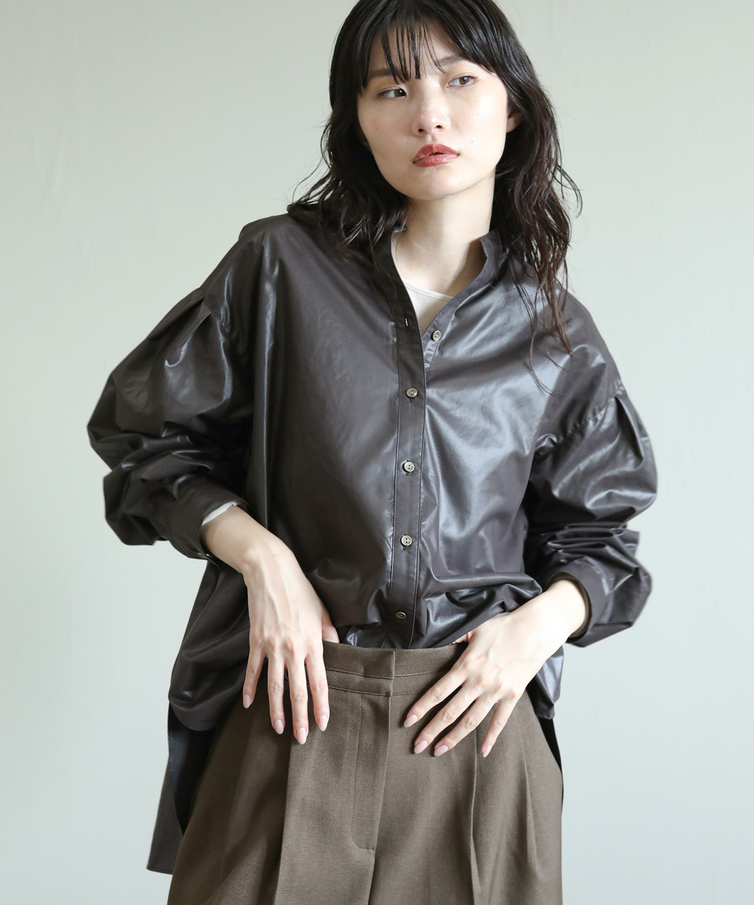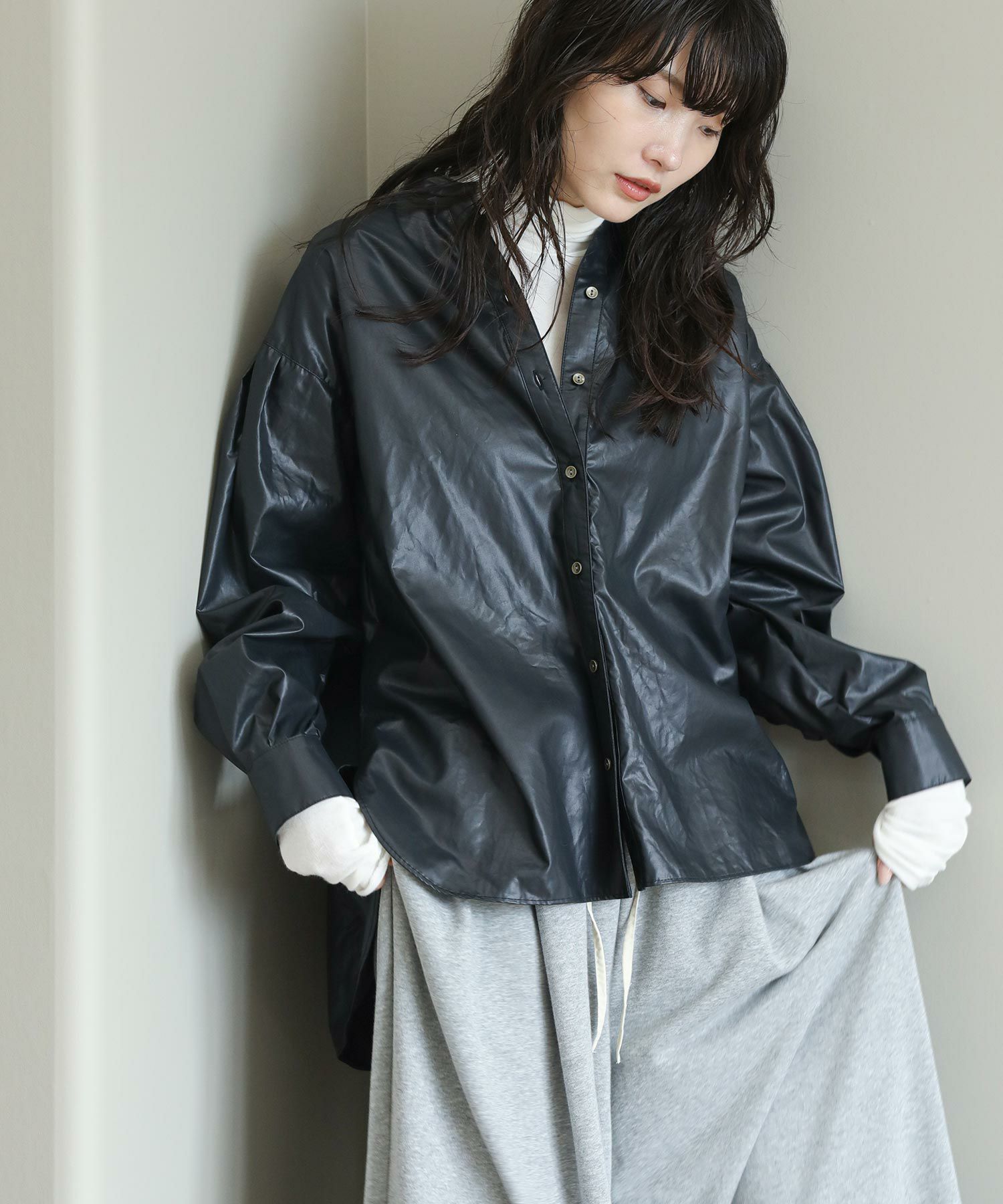 袖にボリュームをもたせることでハードになりがちなレザーアイテムを女性らしく仕上げました。スキッパーデザインを活かしてインナーにタートルやロンT仕込むのもおすすめ。腰回りをカバーしてくれる着丈なのでタイトスカートと好相性。スラックスやワイドパンツとはタックインしてきるとバランスも取りやすいです。