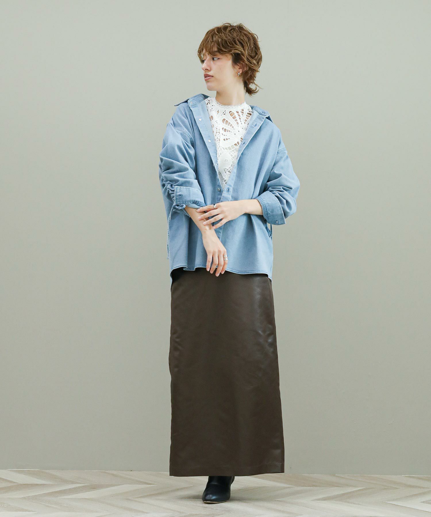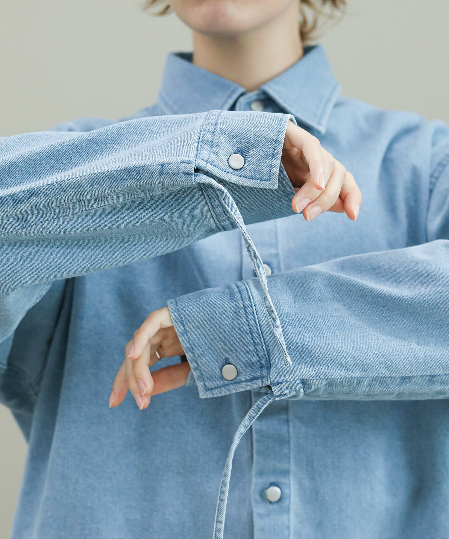 袖のドローコードでシャーリングを作り、袖のフォルムをアレンジできます。程よい肉厚のデニム生地がジャケット代わりにも。デニムはブリーチとボールバイオ加工でヴィンテージライクな風合いに仕上がっています。