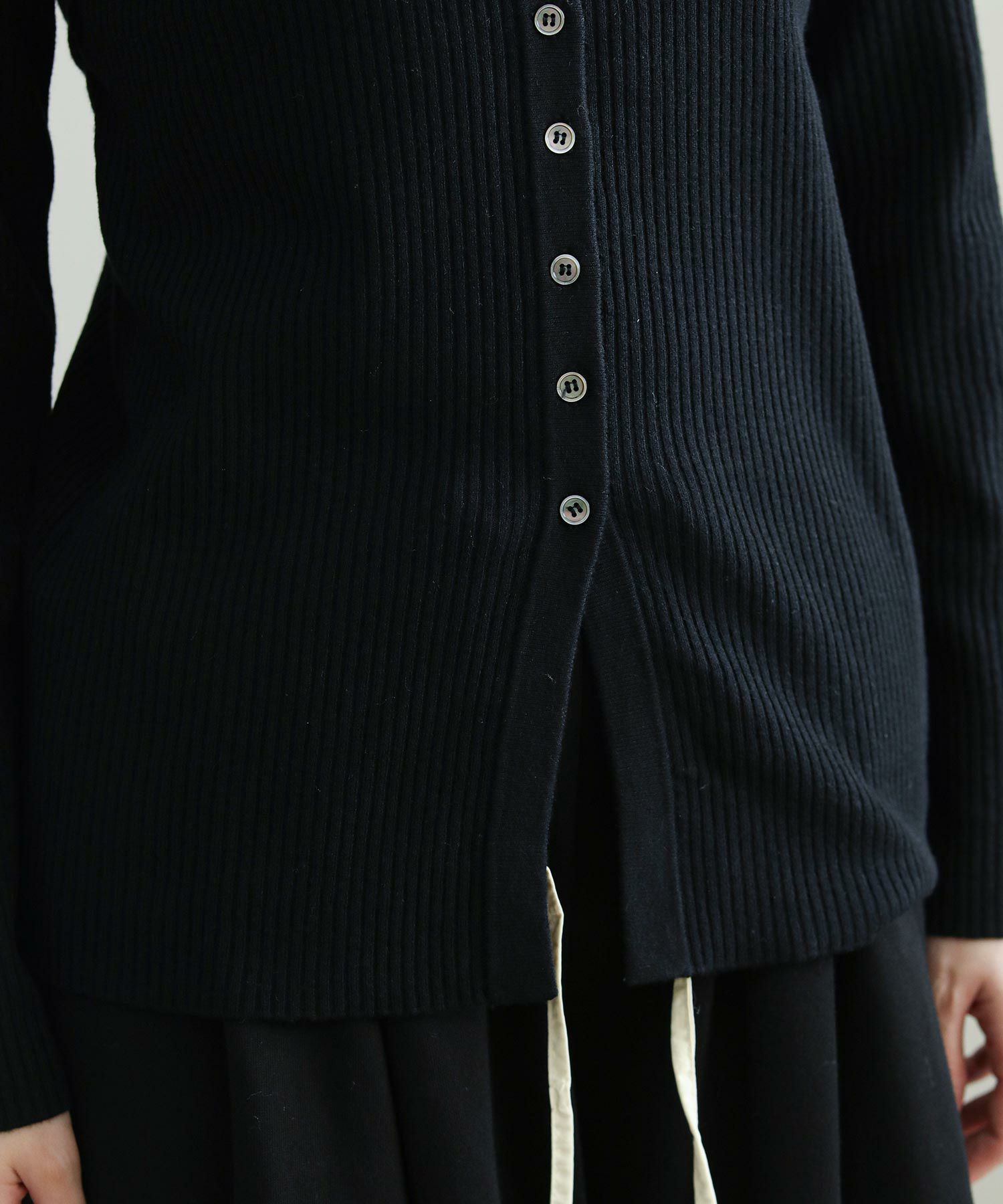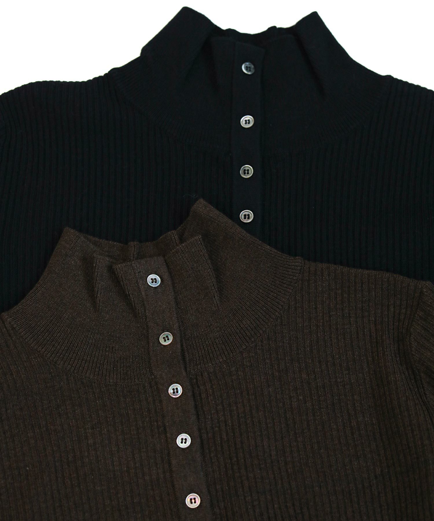 衿の釦を開けてシャツのような着こなしも出来る、マルチウェイニットです。前後を逆にして普通のタートルとして着て頂くことも可能です。身頃はボディラインが出にくい、リブ見えする編地で作られており、一枚でもシルエットを気にすることなく着ていただけます。