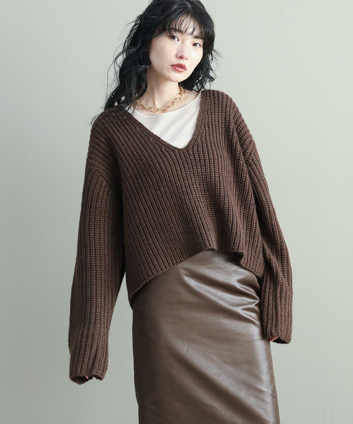 深いVネックデザインがポイントのプルオーバーニット。