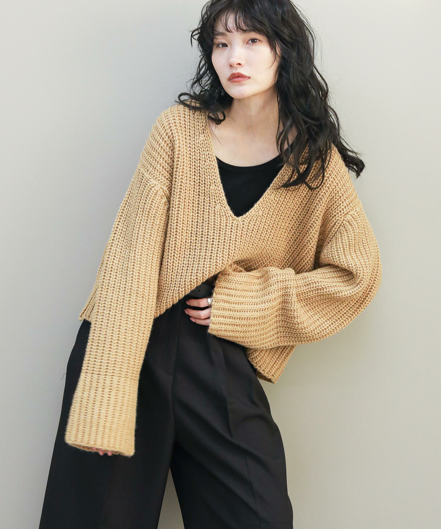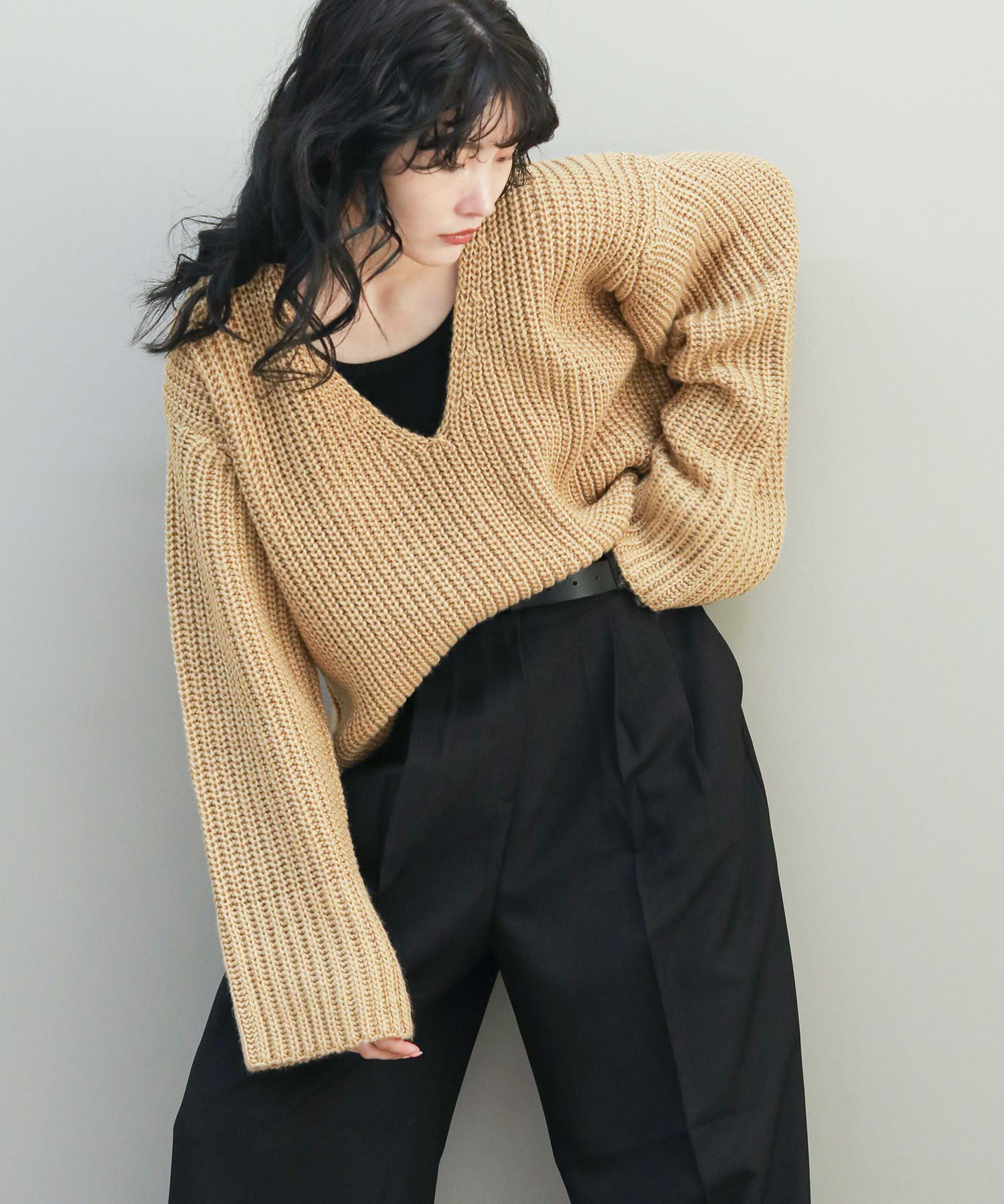 ベーシックな畦ニットですが、幅広の袖やネックラインでトレンド感を出しています。タートルネックやシャツとのレイヤードはもちろん、シンプルにロンTに重ねるだけでもサマになります。