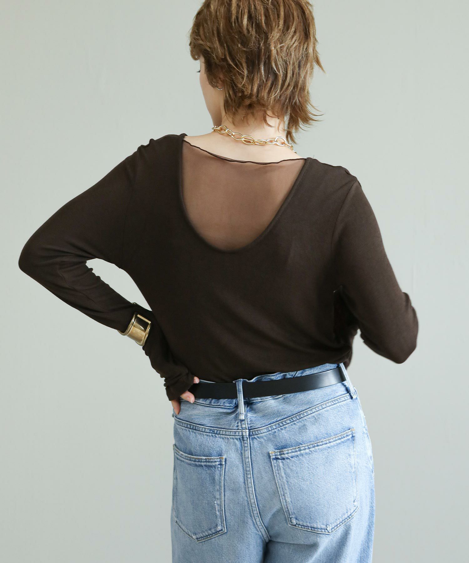 重くなりがちなベロアトップスもシアー感のあるチュールと組み合わせることで軽やかな着こなしが可能に。デニムなどカジュアルなボトムと合わせて女性らしいカジュアルスタイルを楽しめます。