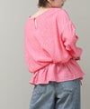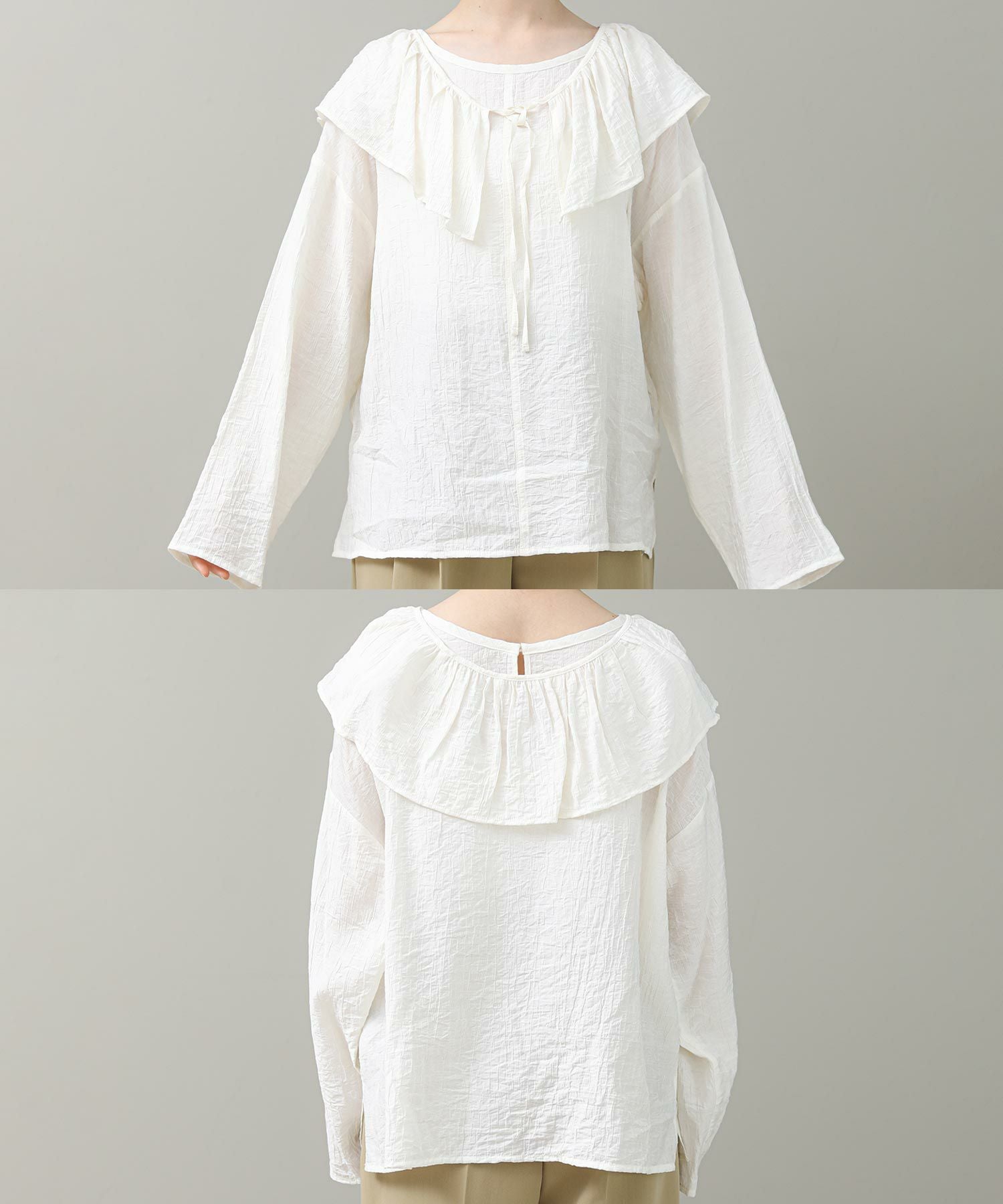 大きなフリル衿は着脱が可能でマルチWAYで使用できます。肩に垂らしてラッフルカラー風にしたり、腰の位置で巻けばペプラムデザインのブラウスにも。ブラウスだけで着るとTシャツ感覚で着られてジャケットやカーディガンのインナーにも重宝します。目を惹くビビットなピンクが春の気分を高めてくれる1枚です。