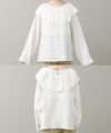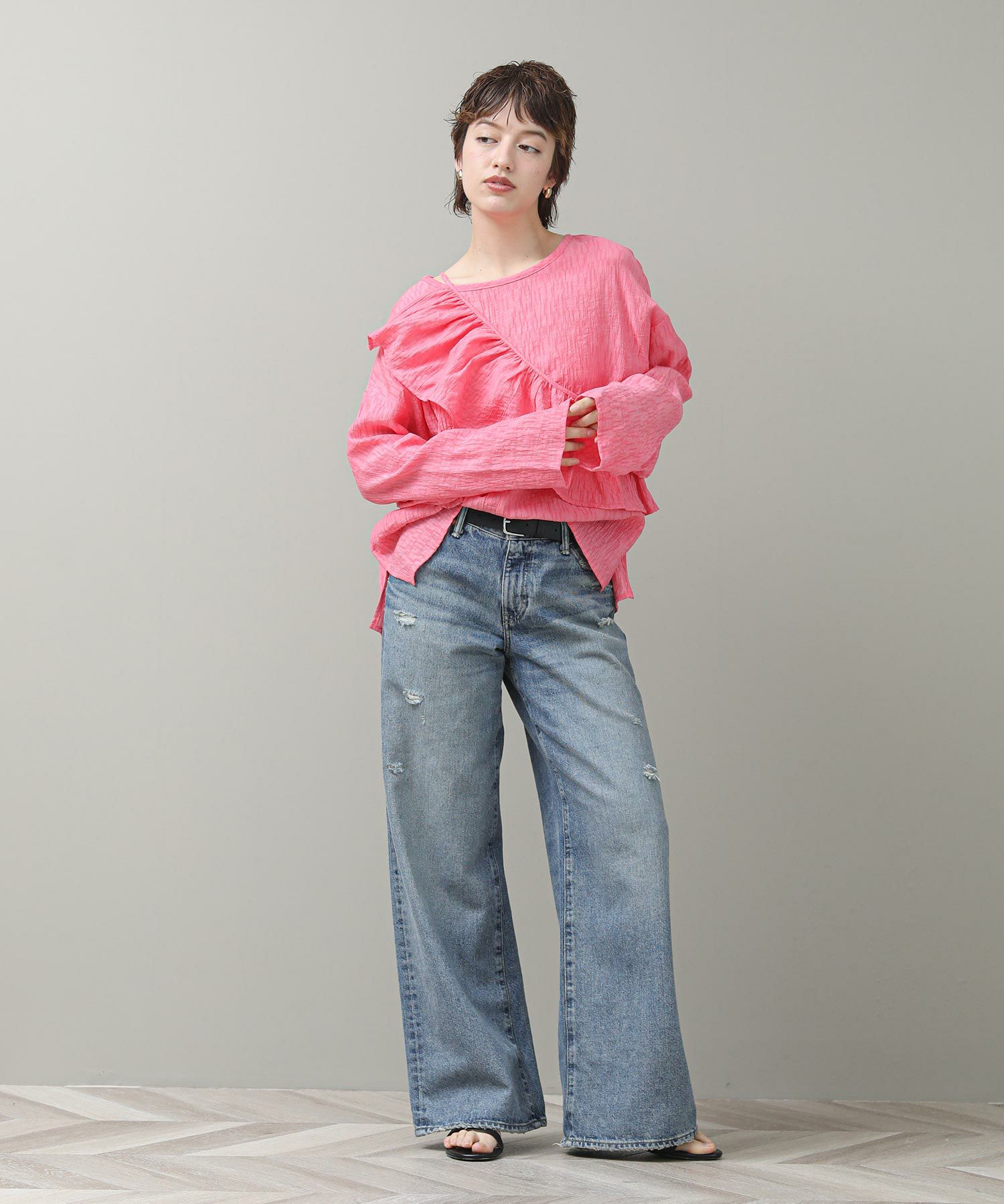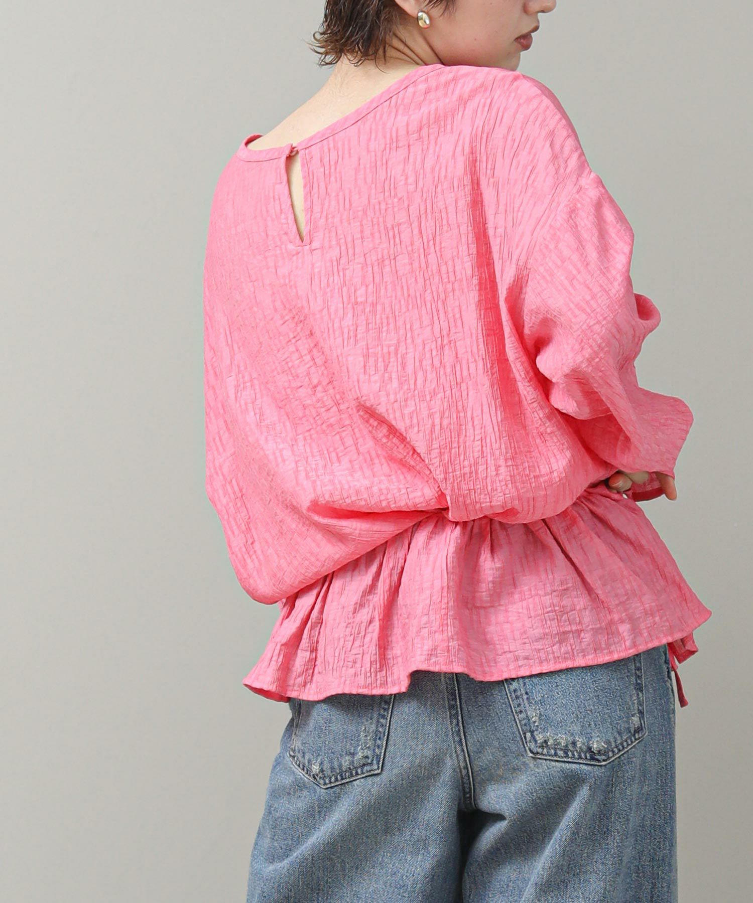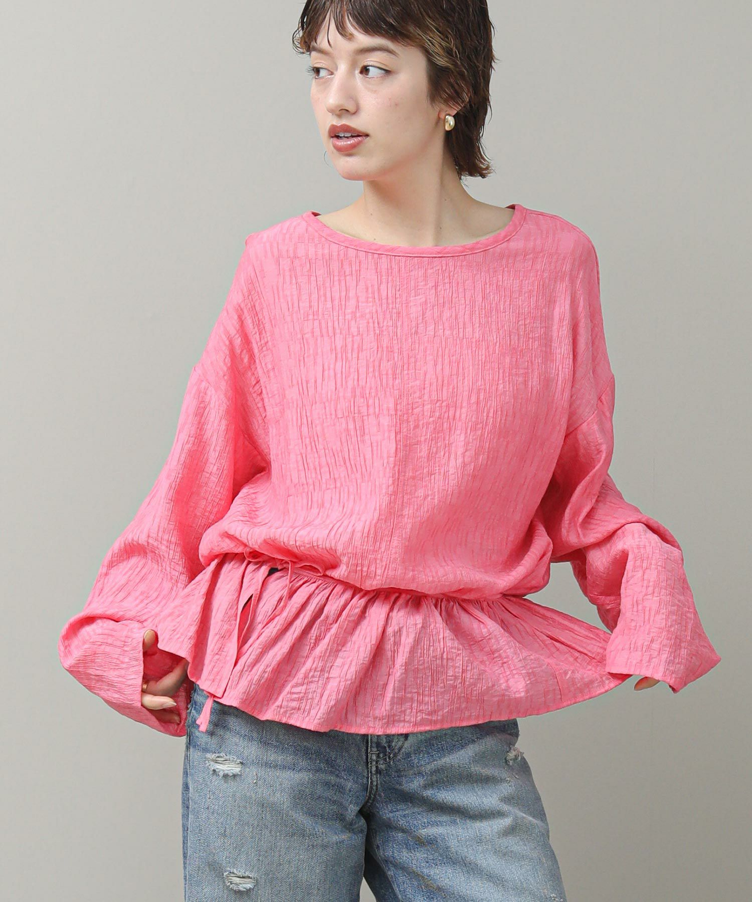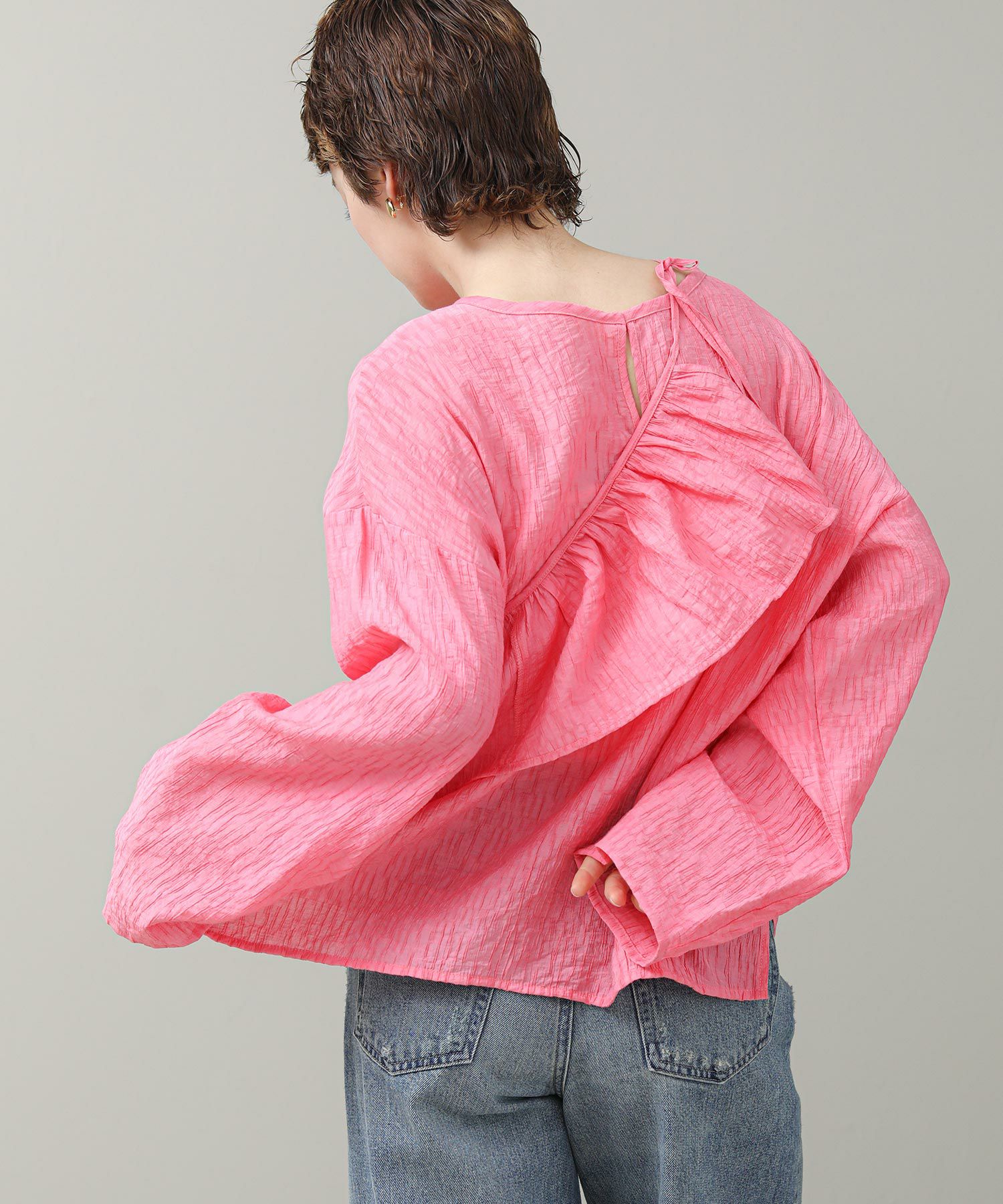 大きなフリル衿は着脱が可能でマルチWAYで使用できます。肩に垂らしてラッフルカラー風にしたり、腰の位置で巻けばペプラムデザインのブラウスにも。ブラウスだけで着るとTシャツ感覚で着られてジャケットやカーディガンのインナーにも重宝します。目を惹くビビットなピンクが春の気分を高めてくれる1枚です。