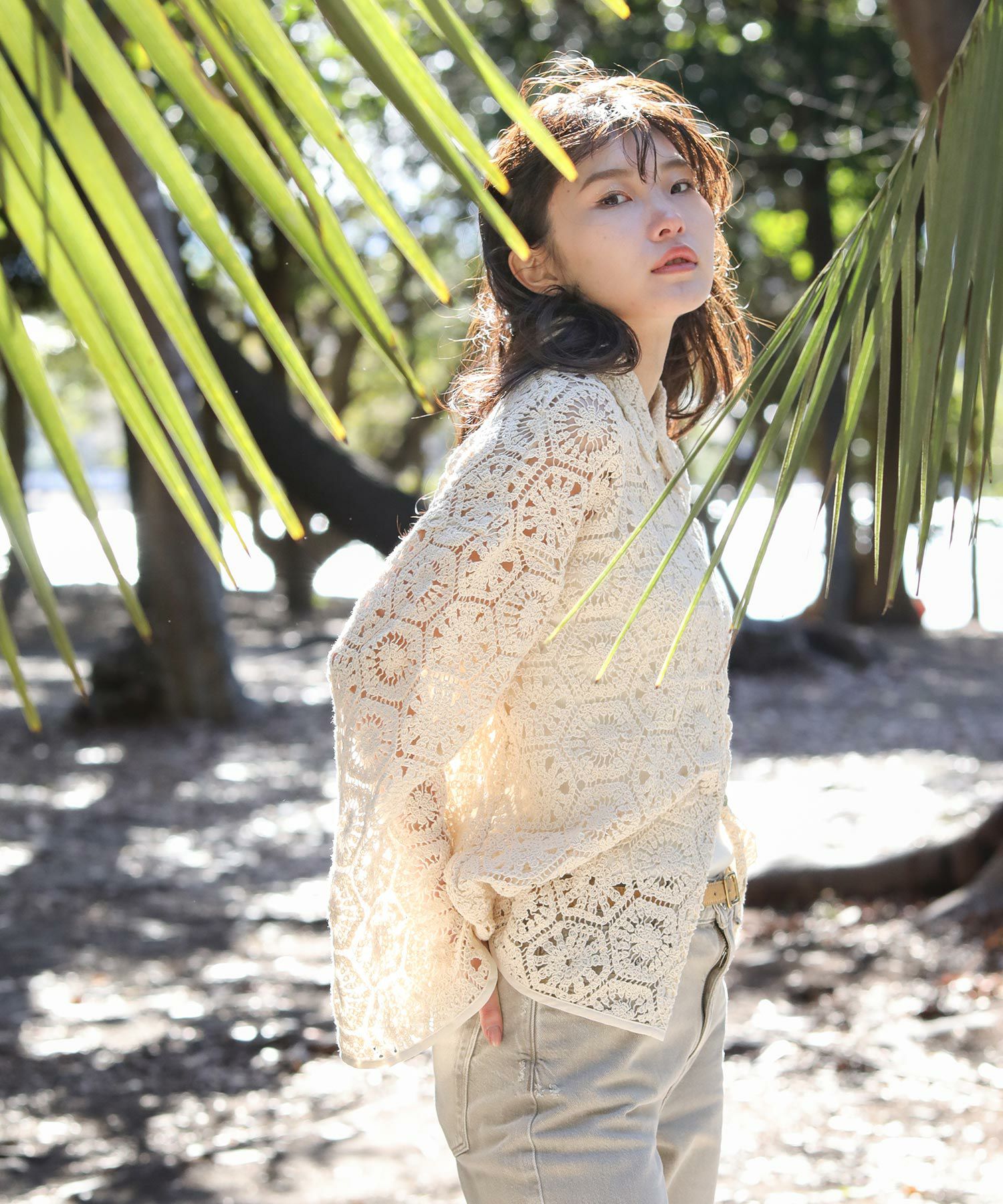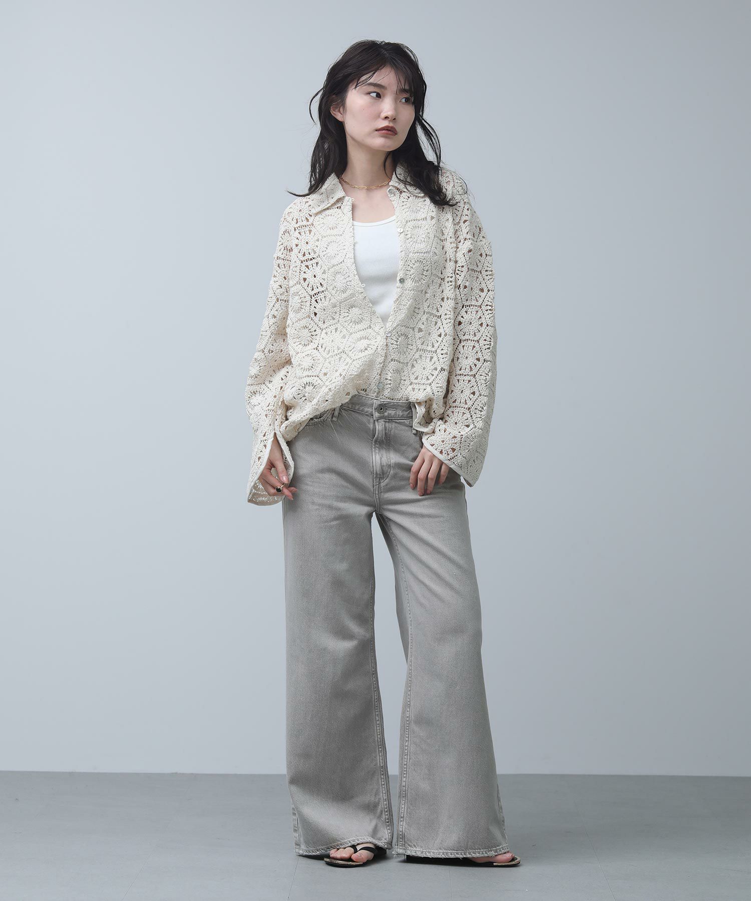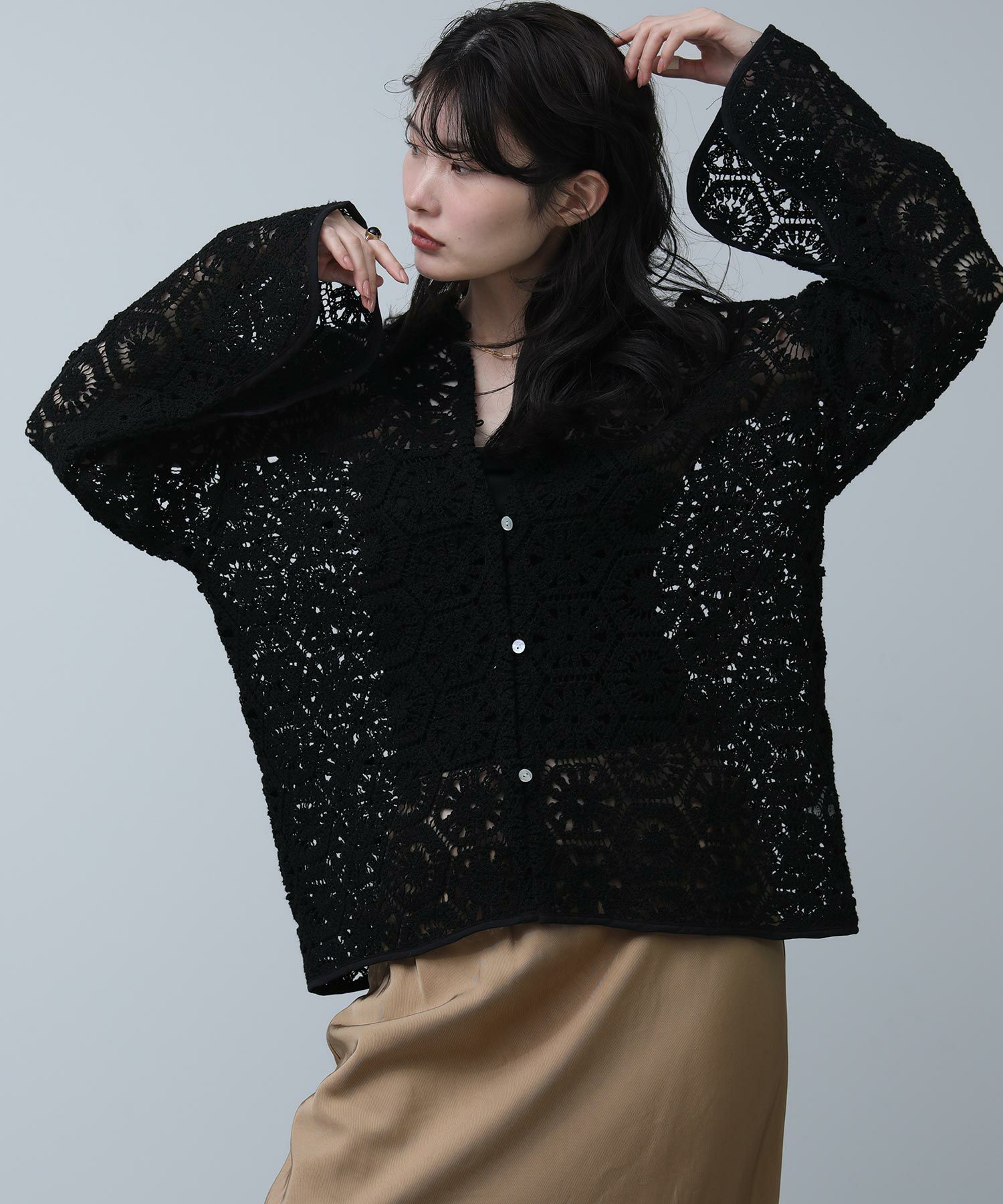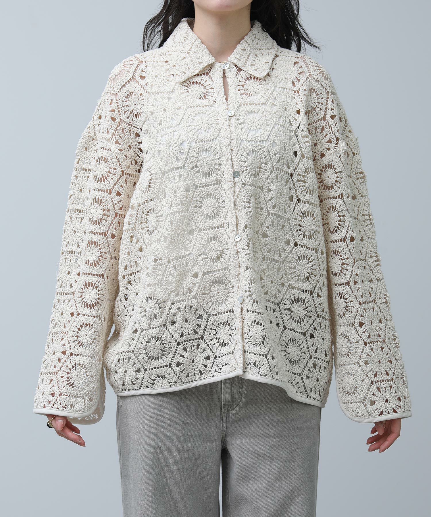 繊細なレースで旬な着こなしが叶います。程よくゆとりのあるサイジングなので、ラフに羽織ってもバランス良く着ていただけます。まだ肌寒い時期やロンTなどの上に羽織としてもおすすめ。季節が進めば、キャミやタンクをインナ―に大人の肌見せスタイルをお楽しみいただけます。