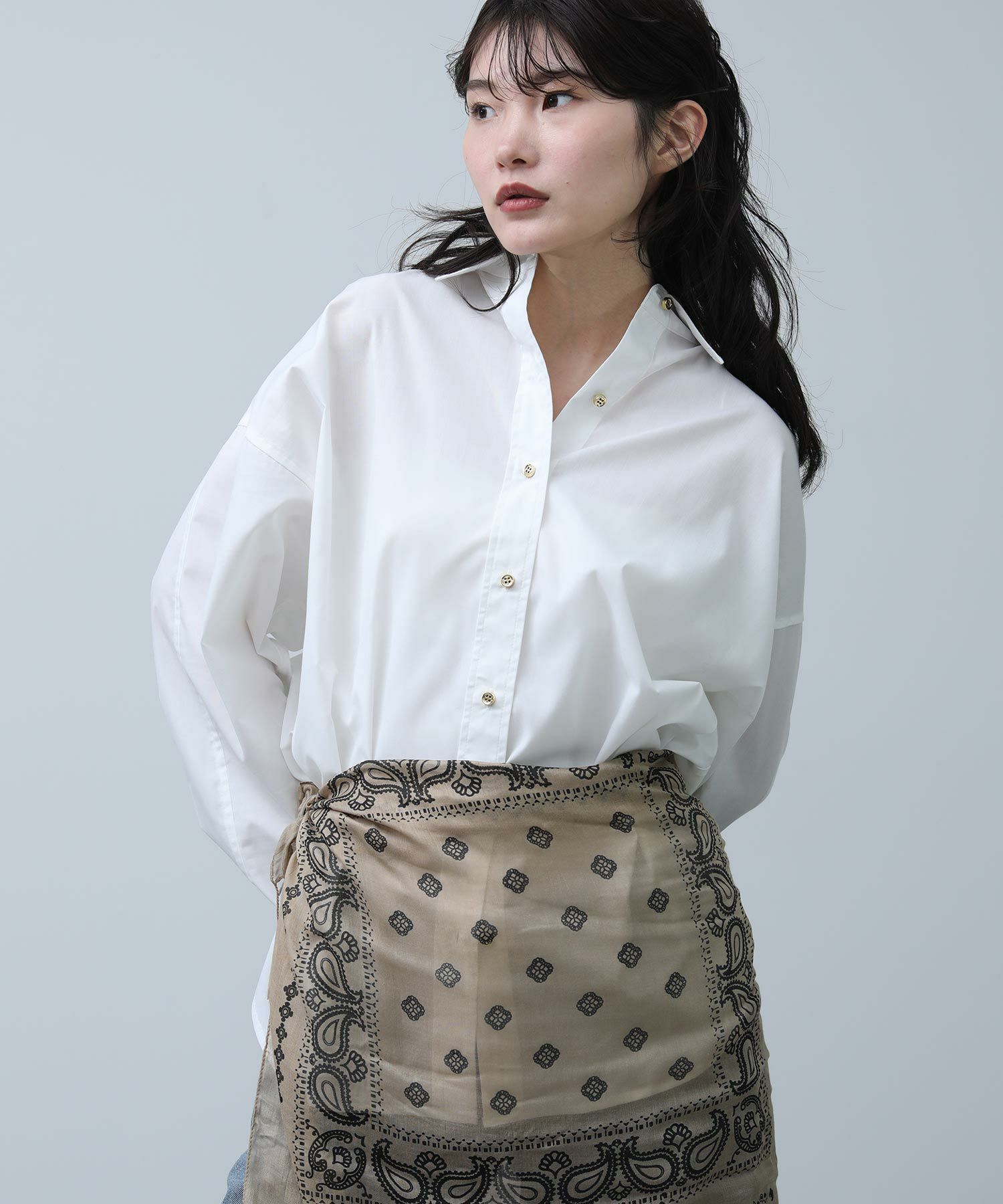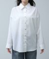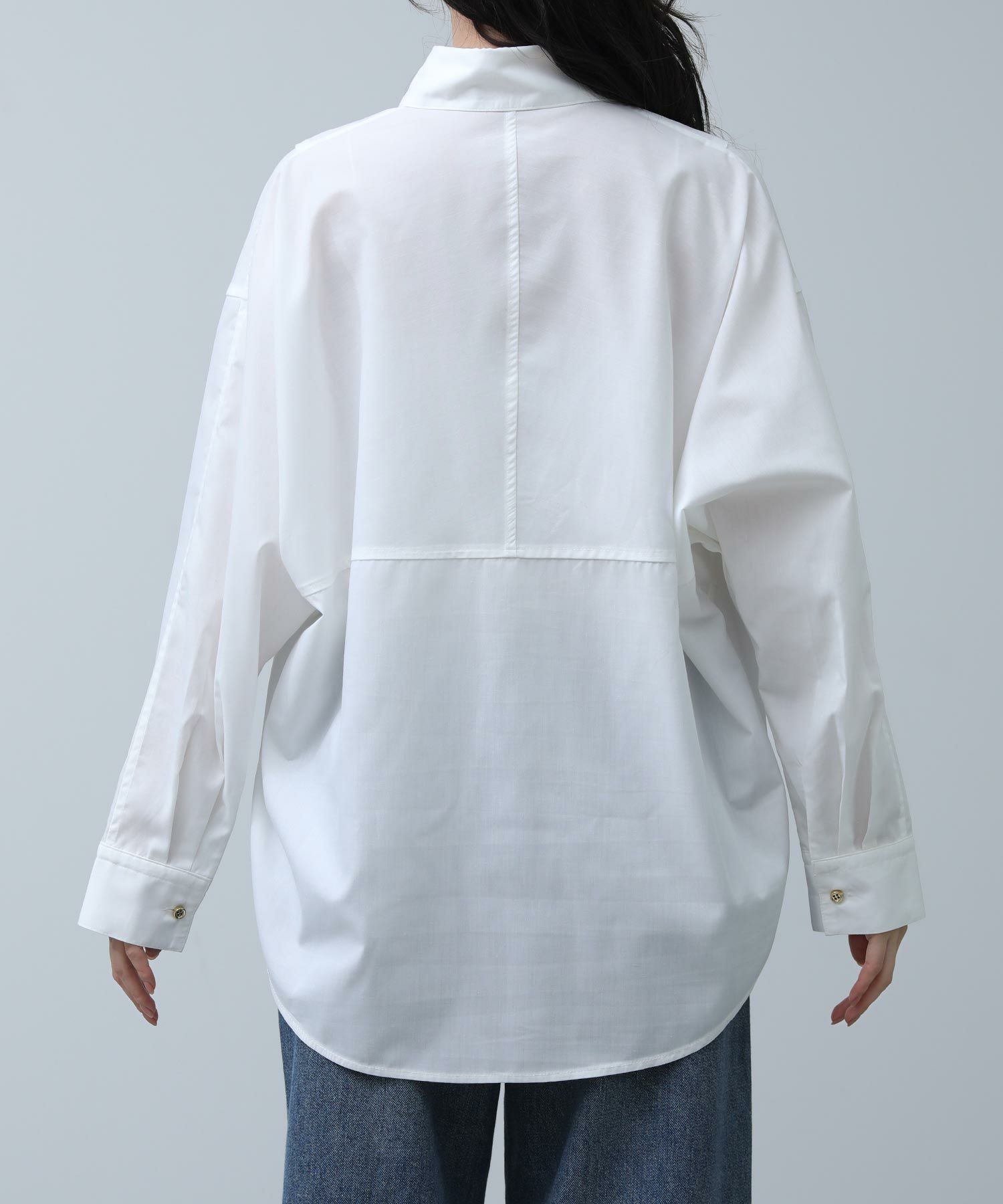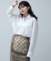クリーンな白シャツで登場です。ベーシックアイテムも華やかな釦がアクセントになり、1枚でも着映えします。肩にタックを取ることで、衿を抜いてきたときのシルエットが綺麗に決まります。シワが気にならず、お手入れも簡単なのでお仕事着にもおすすめです。