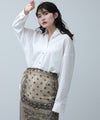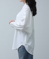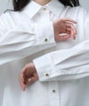 クリーンな白シャツで登場です。ベーシックアイテムも華やかな釦がアクセントになり、1枚でも着映えします。肩にタックを取ることで、衿を抜いてきたときのシルエットが綺麗に決まります。シワが気にならず、お手入れも簡単なのでお仕事着にもおすすめです。