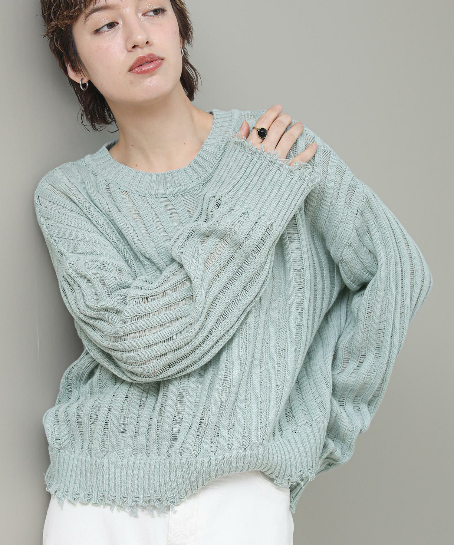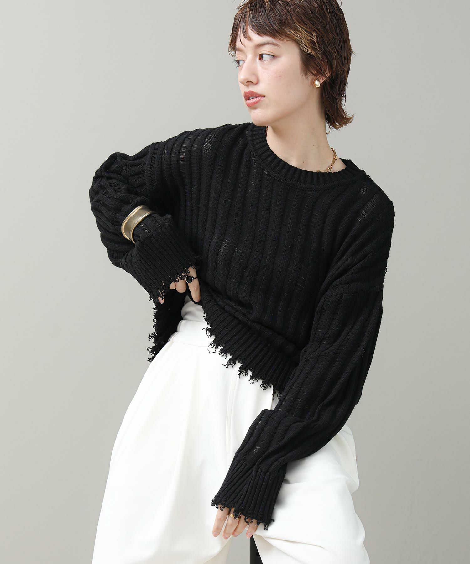 袖や裾のダメージデザインがポイントのプルオーバーニット。