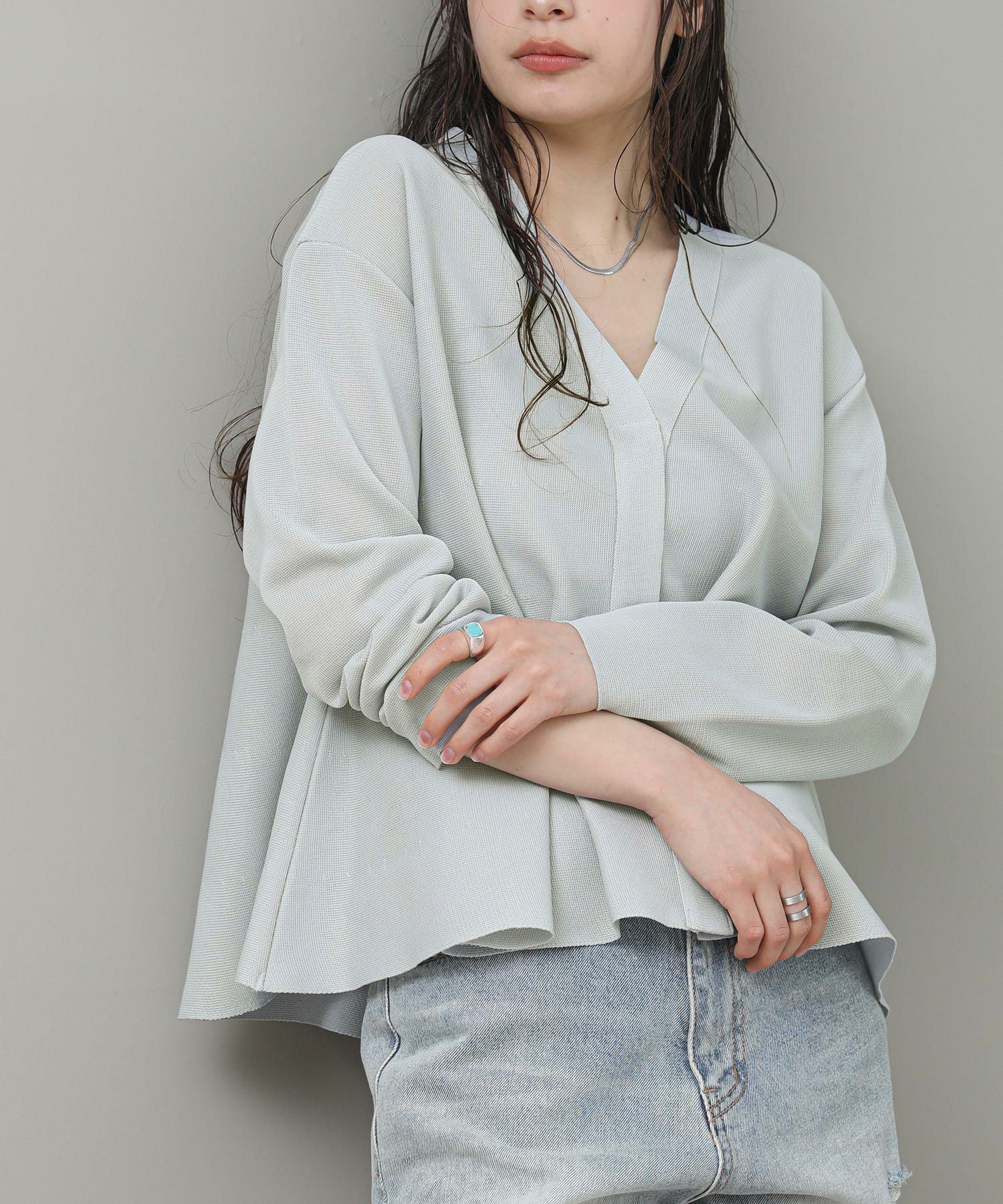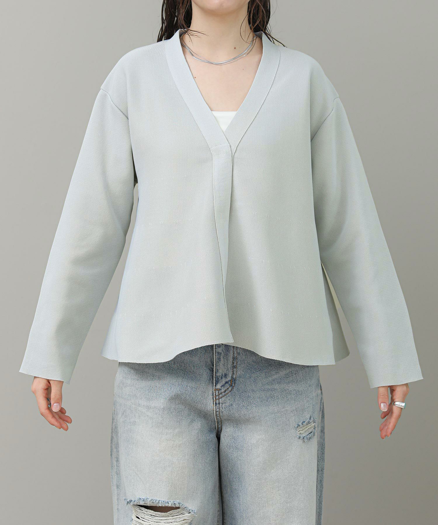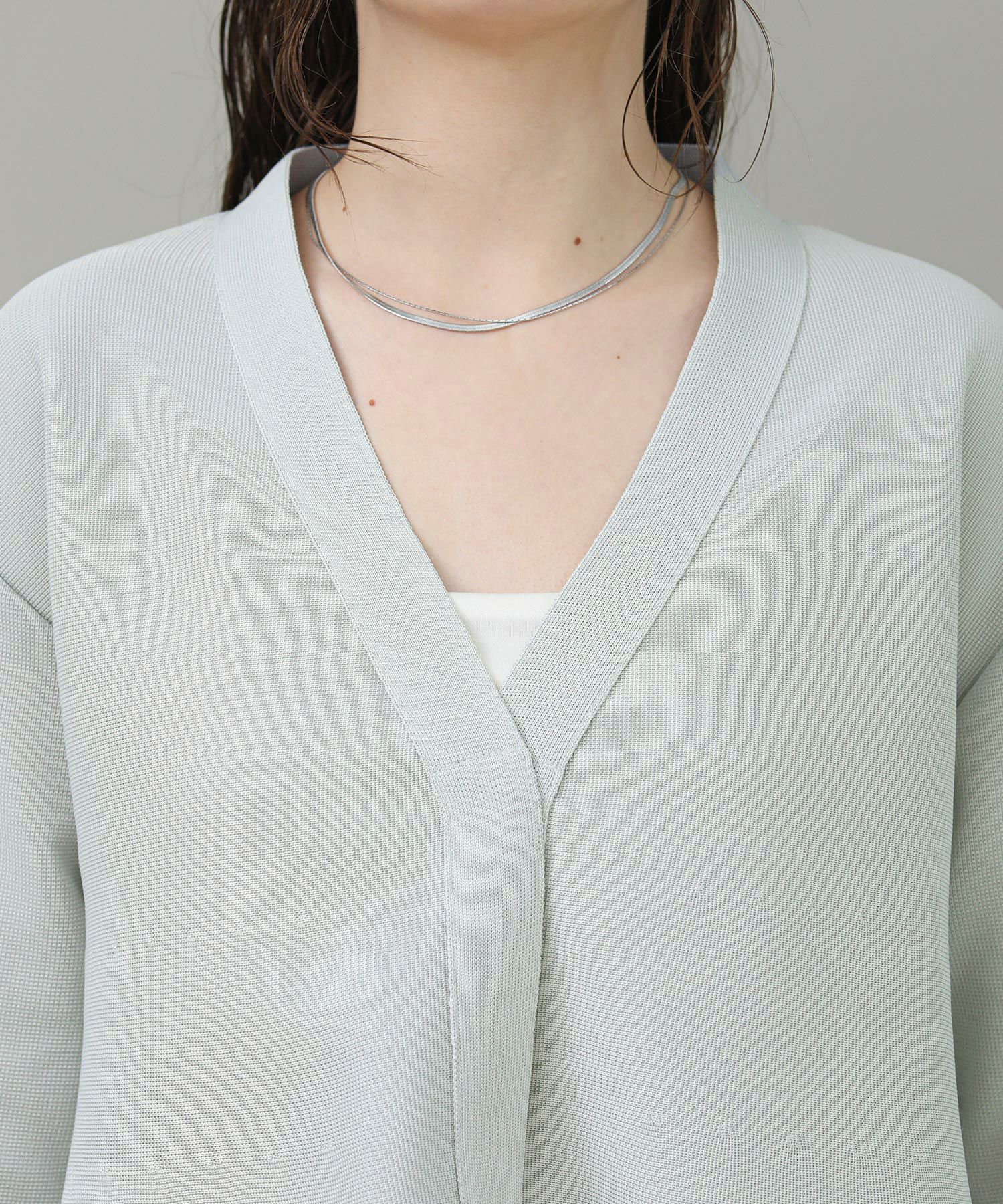 光沢のある糸が上品な印象です。程よいハリ感があり肌離れも良く快適な着心地です。デコルテが綺麗に見えるVネックもポイント。スナップ釦なので前を留めてきるとすっきりと着ていただけます。