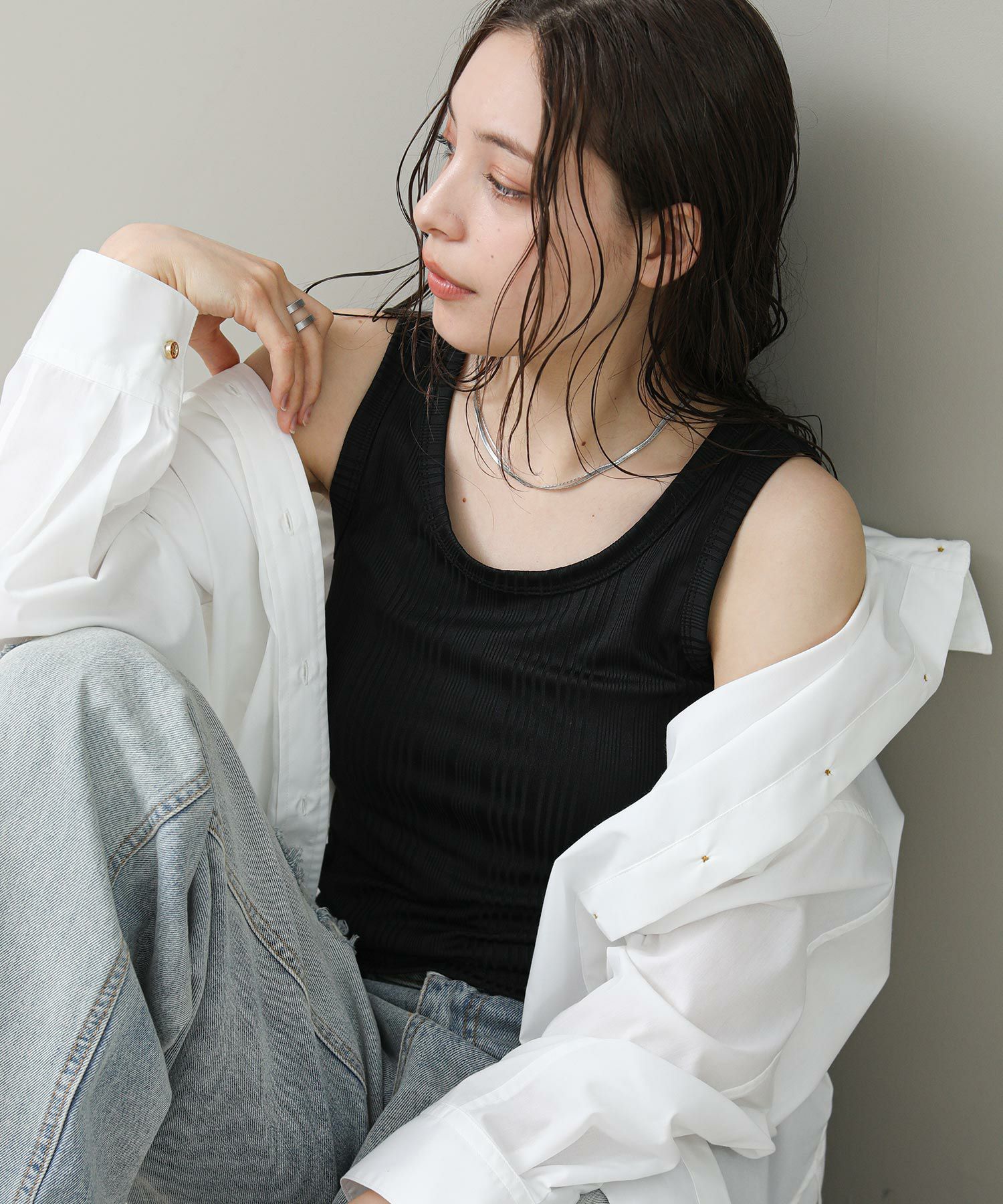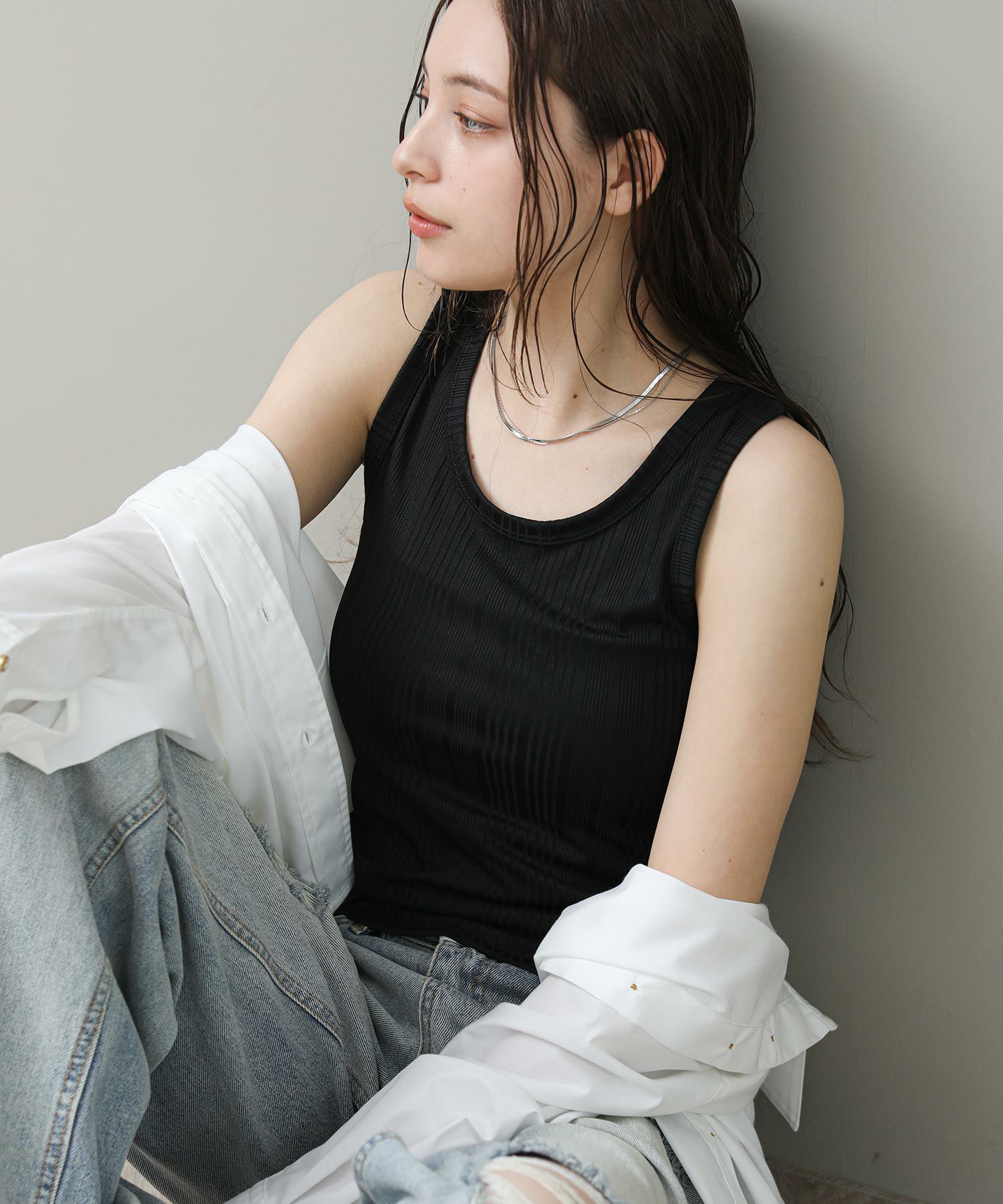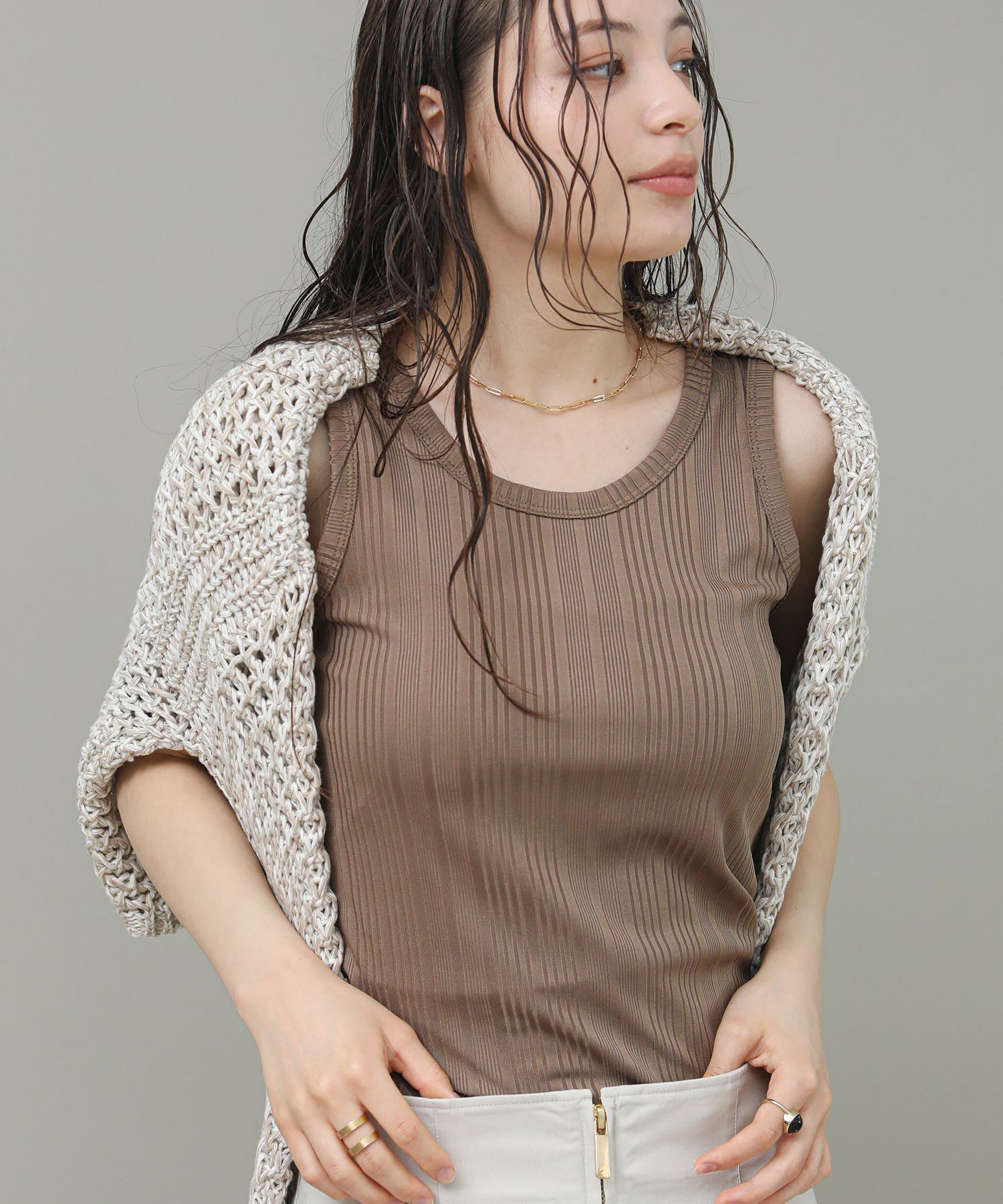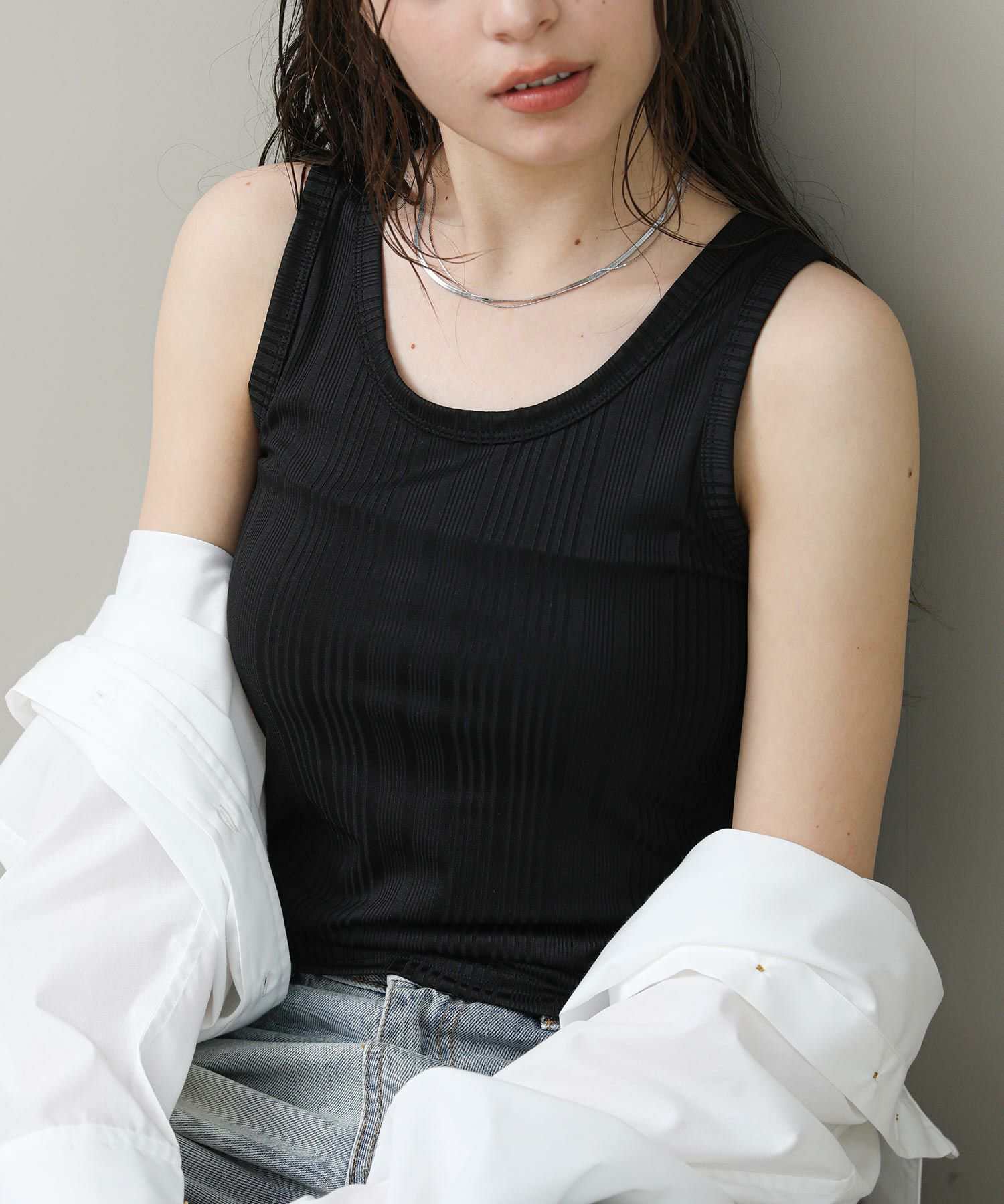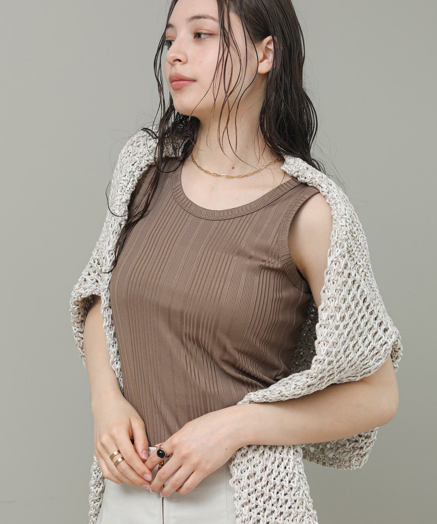 程よく光沢のある素材感とランダムなテレコでツヤがあり、大人な雰囲気です。これからのシーズンシャツやジャケットのインナーに重宝します。さりげなく、アメスリになっているので、1枚でヘルシーな肌見せも◎