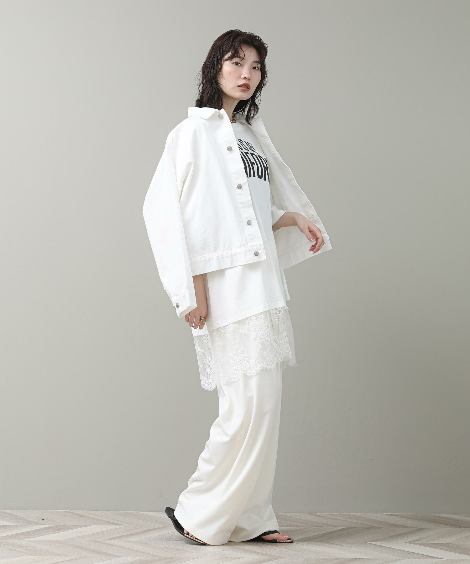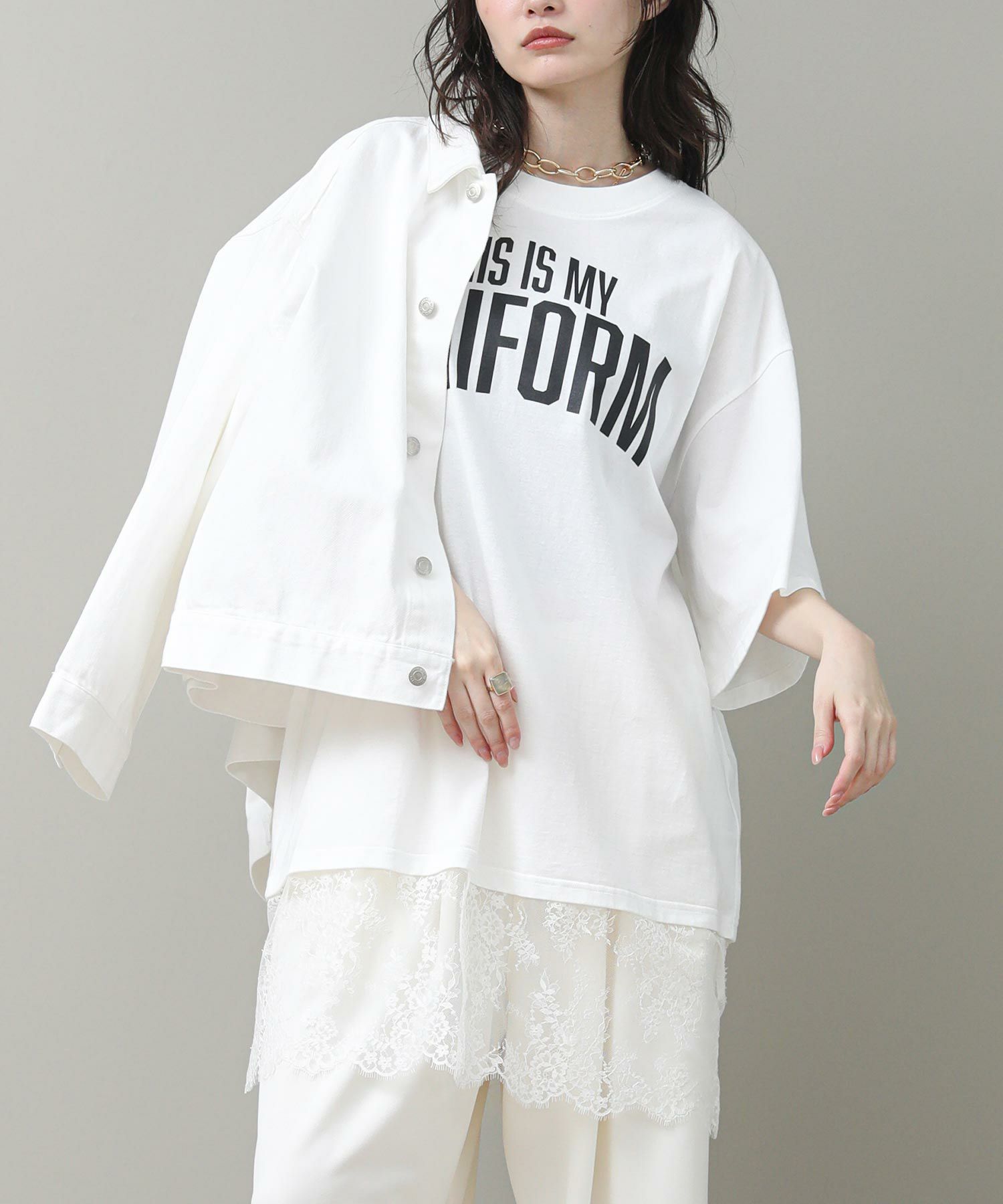 す。甘くなりがちなレースを大人の女性が着てもかっこよく着られるアイテムです。前後のロゴでバックスタイルも決まります。