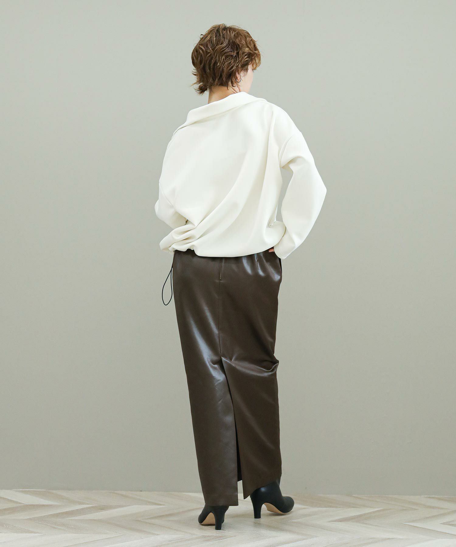 首回りをすっきりと見せてくれる高めの衿は衿付きコートを合わせた時のバランスを考え設計。インナーとしても存在感のあるデザインです。裾のドローコードが丸みのあるフォルムをつくるのでタイトスカートなど女性らしいアイテムと合わせると◎軽くや柔らかいもちっとしたダンボール素材の風合いも魅力。刺繍は小説家ジェイ・マキナニーのニューヨークを舞台にした作品「Bright Lights, Big City」から着想を得ました。