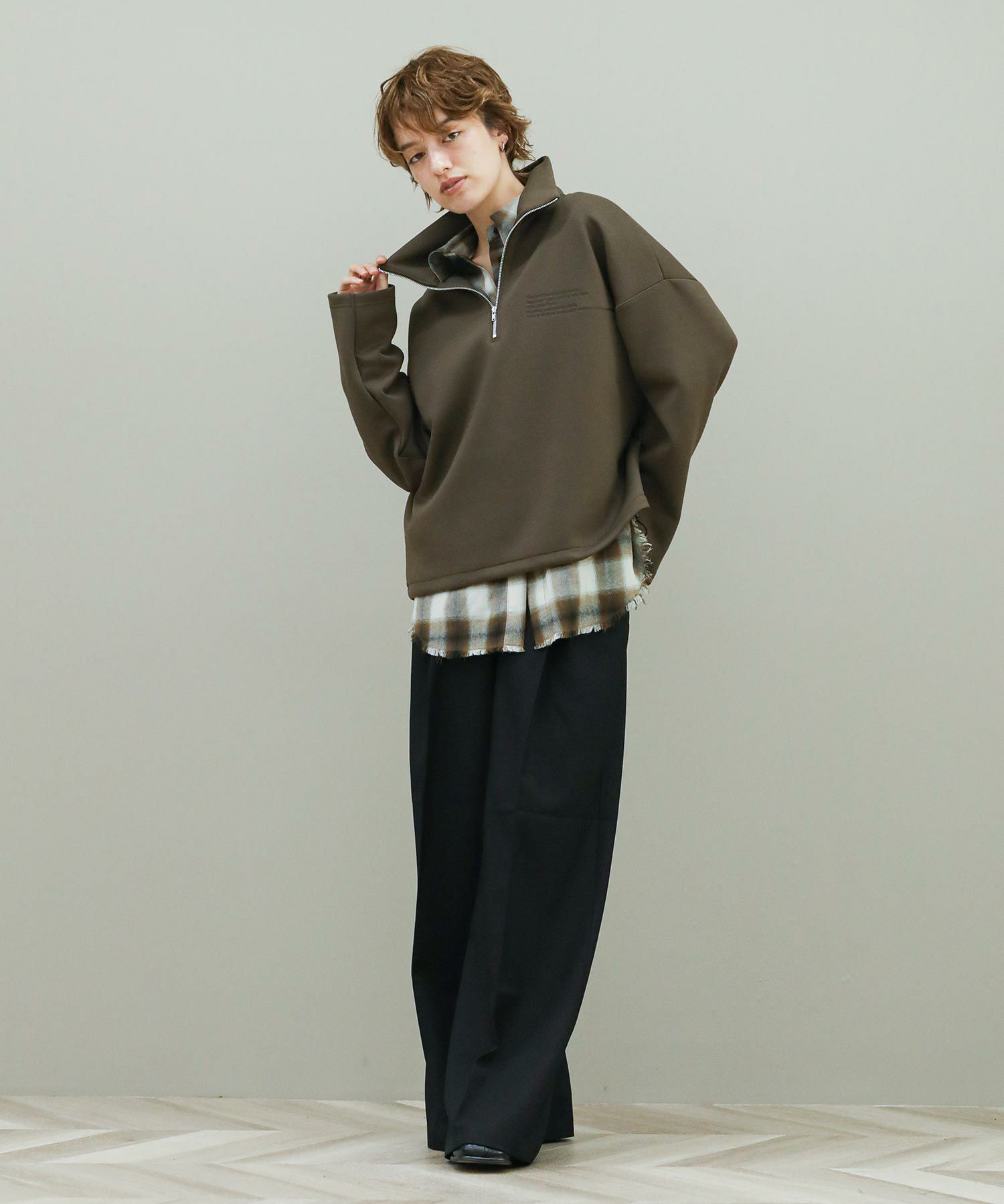 メンズライクなハーフジップに今っぽさと女性らしさをプラス。