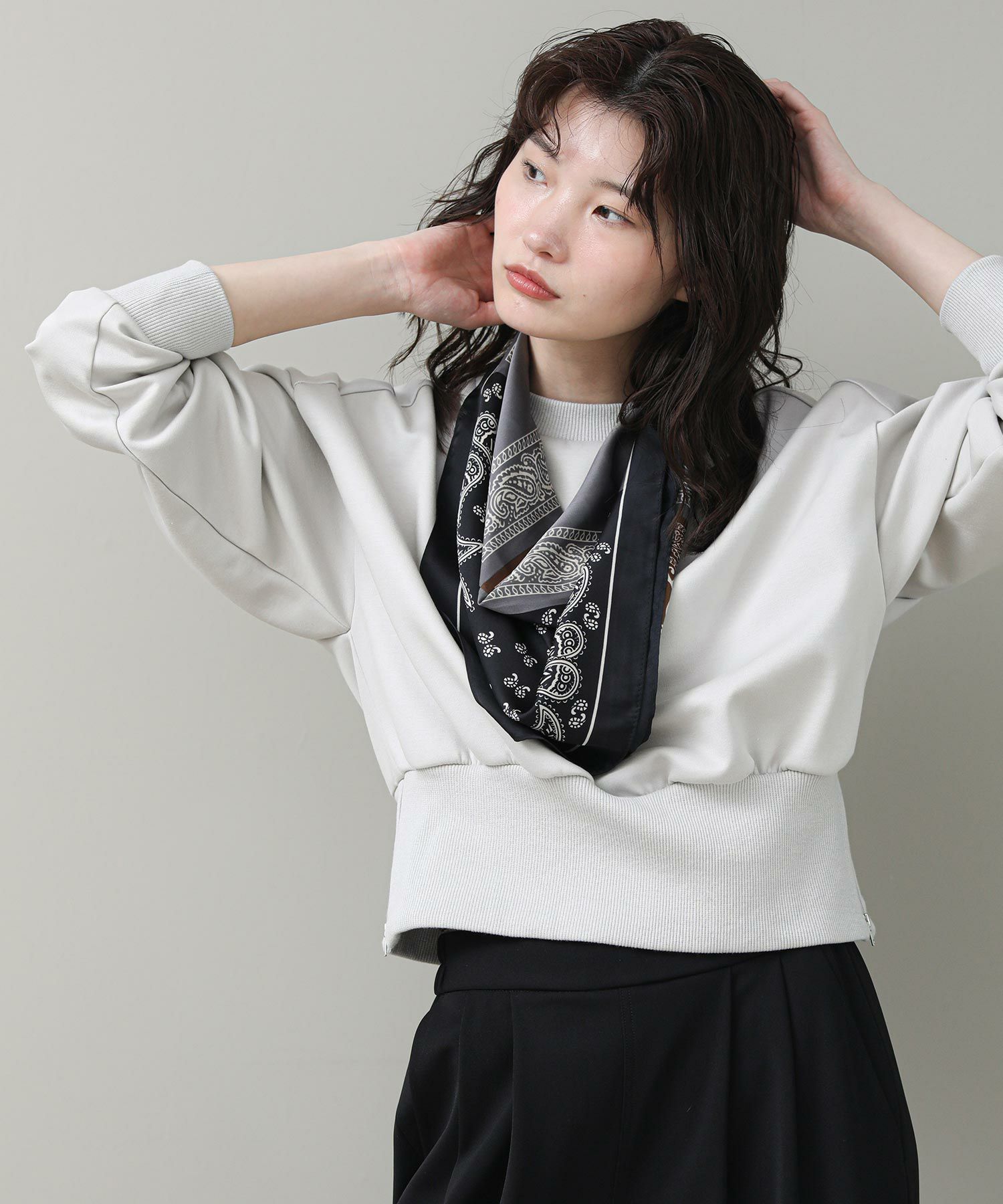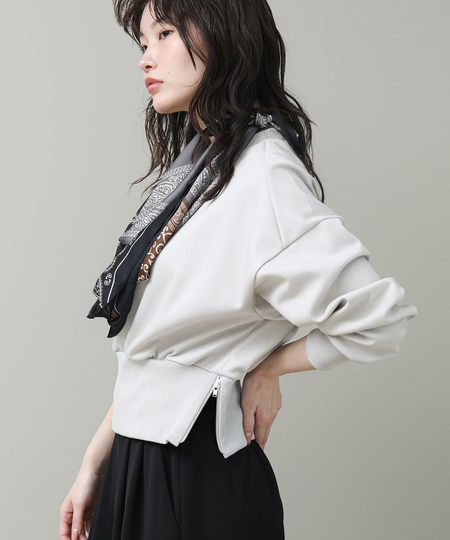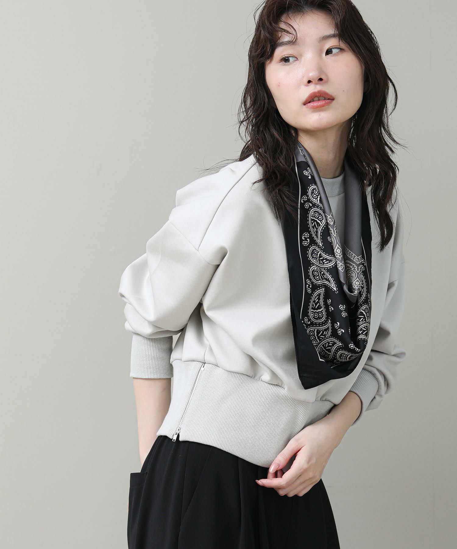 ワイドパンツやフレアスカートとも相性の良いコンパクトなサイジングです。身頃にふんわりとしたシルエットがでるよ、裾リブのバランスにこだわりました。衿や袖のリブを長めに設定し、1枚でもサマになるようモードな印象に仕上げています。