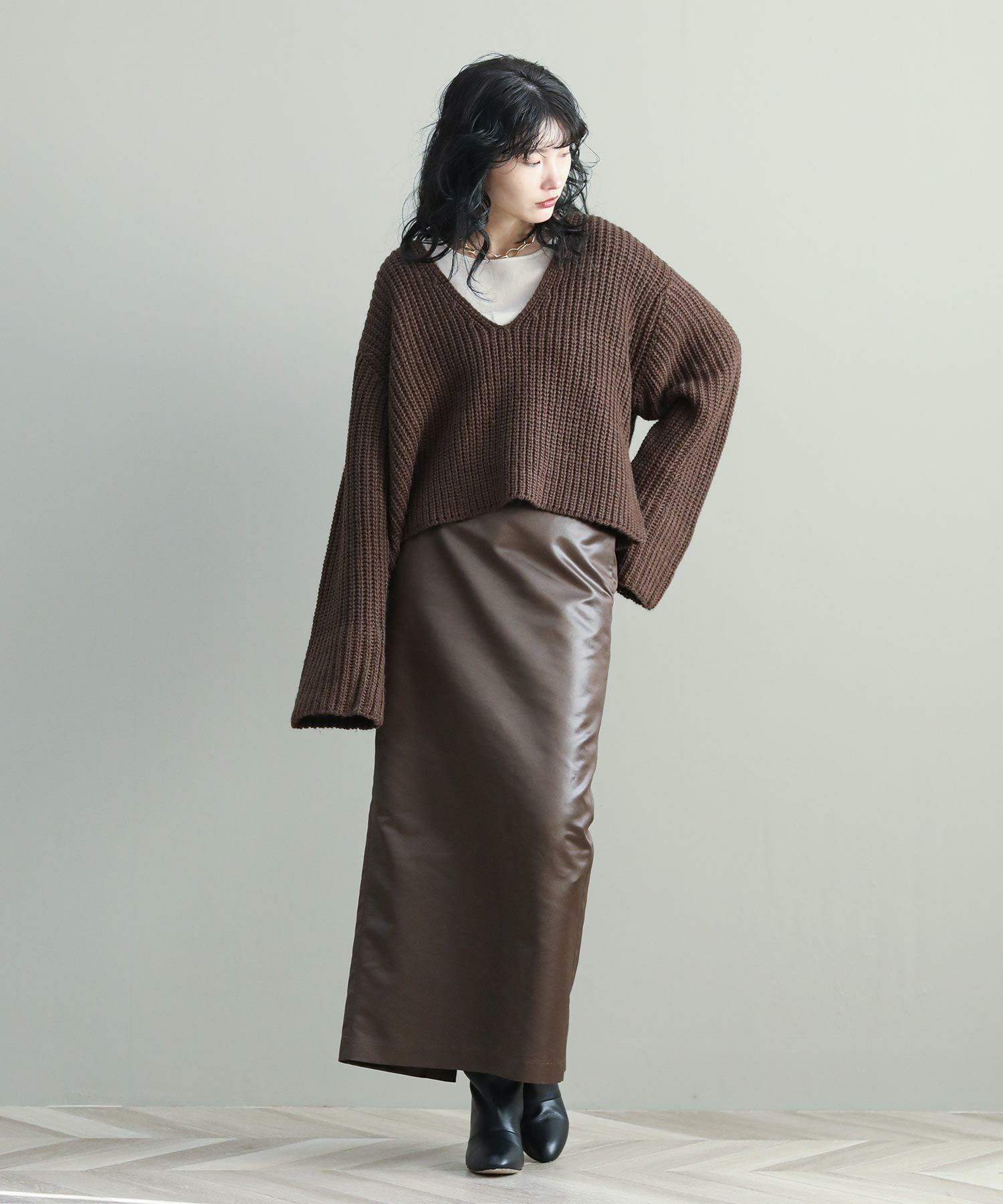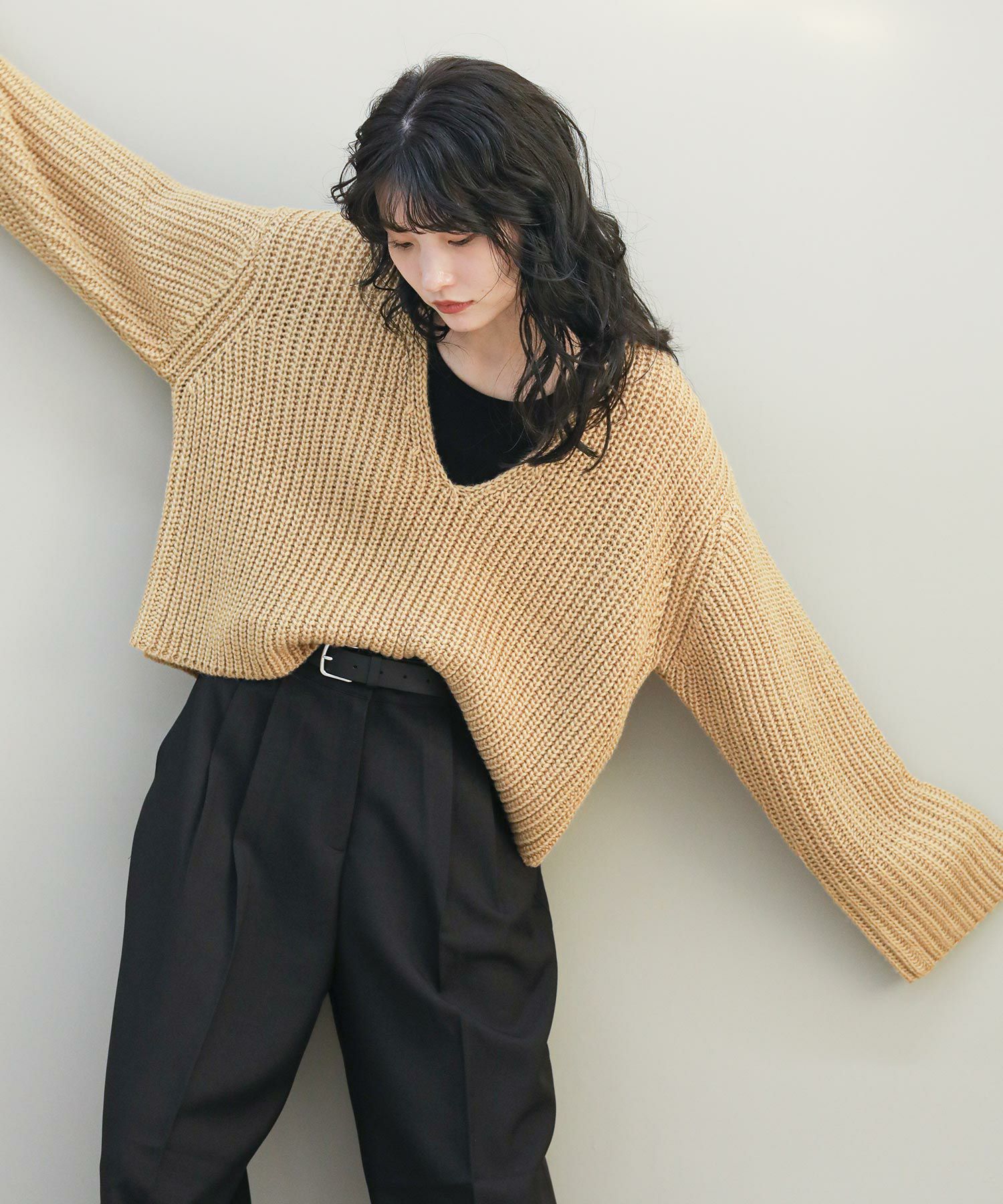 ベーシックな畦ニットですが、幅広の袖やネックラインでトレンド感を出しています。タートルネックやシャツとのレイヤードはもちろん、シンプルにロンTに重ねるだけでもサマになります。