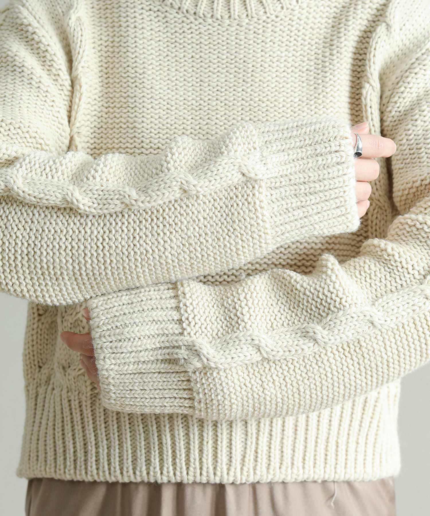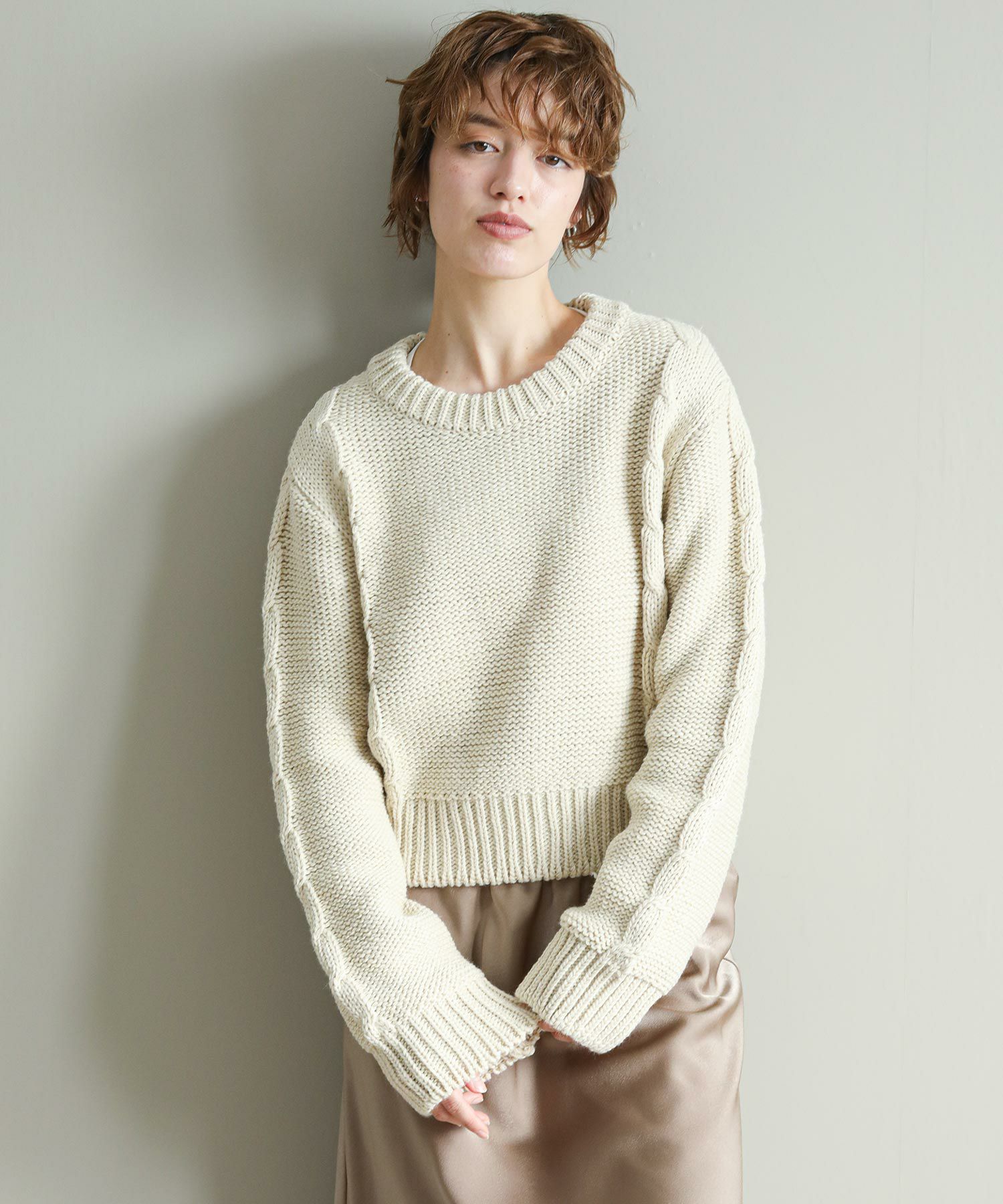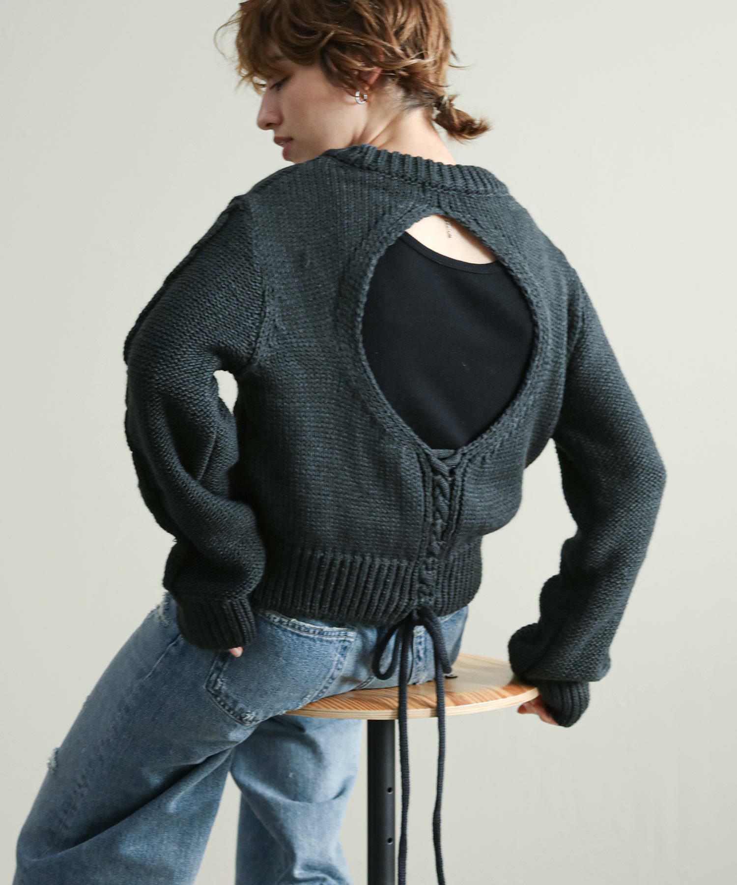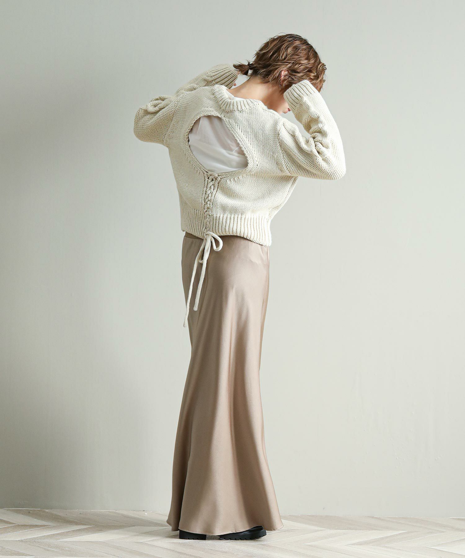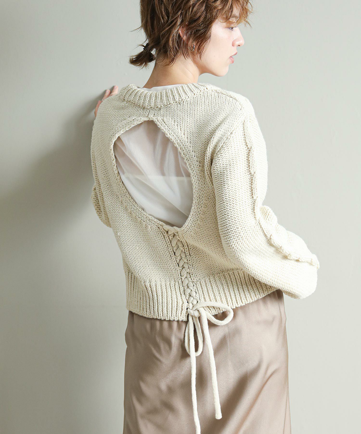 背中の開きとレースアップのリボンがポイントに。シンプルなボトムと合わせてもサマになります。袖のケーブルのさりげないアクセントに。タートネックやシャツはもちろん、シアーのインナーをレイヤードするのもおしゃれ感アップ◎