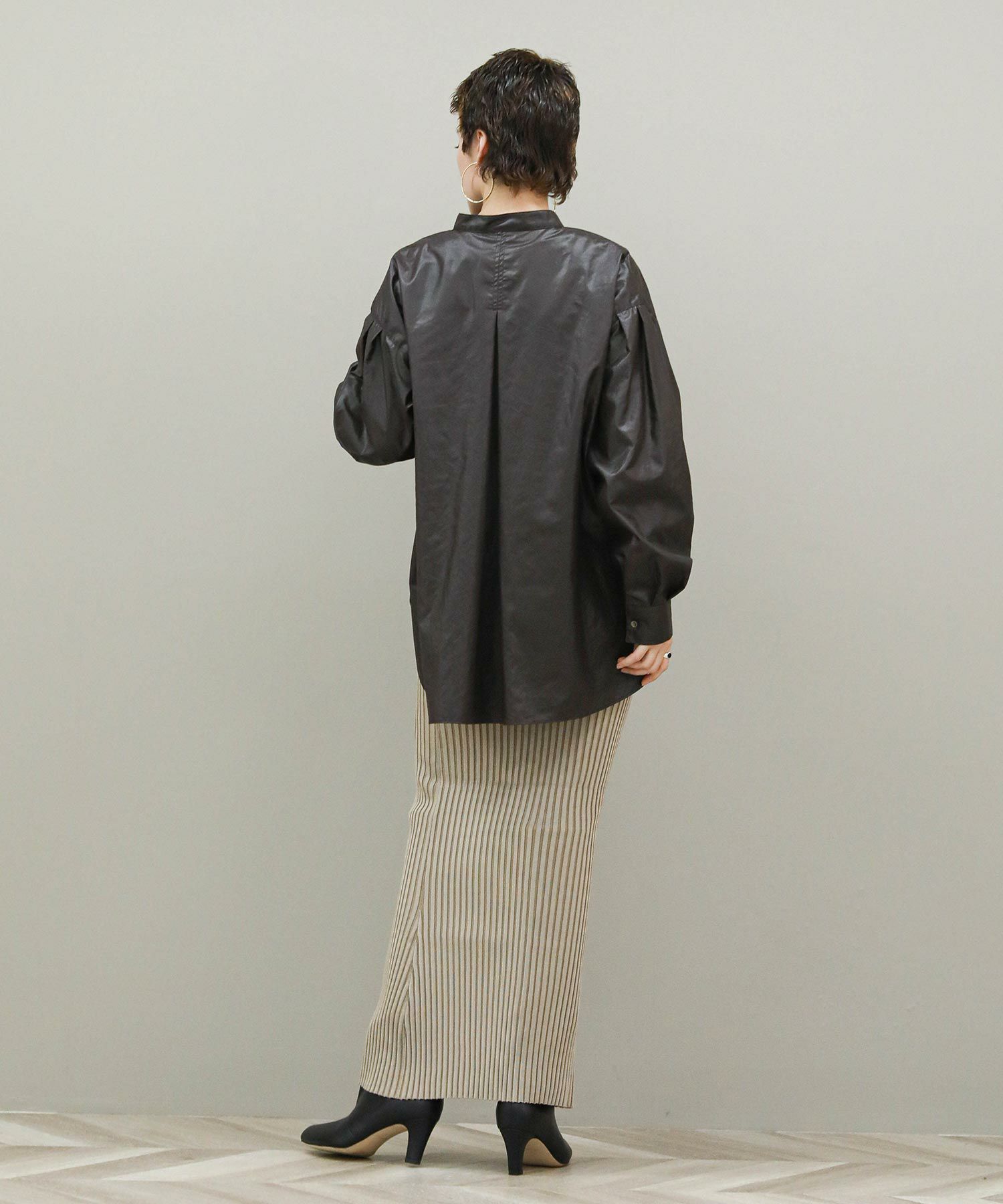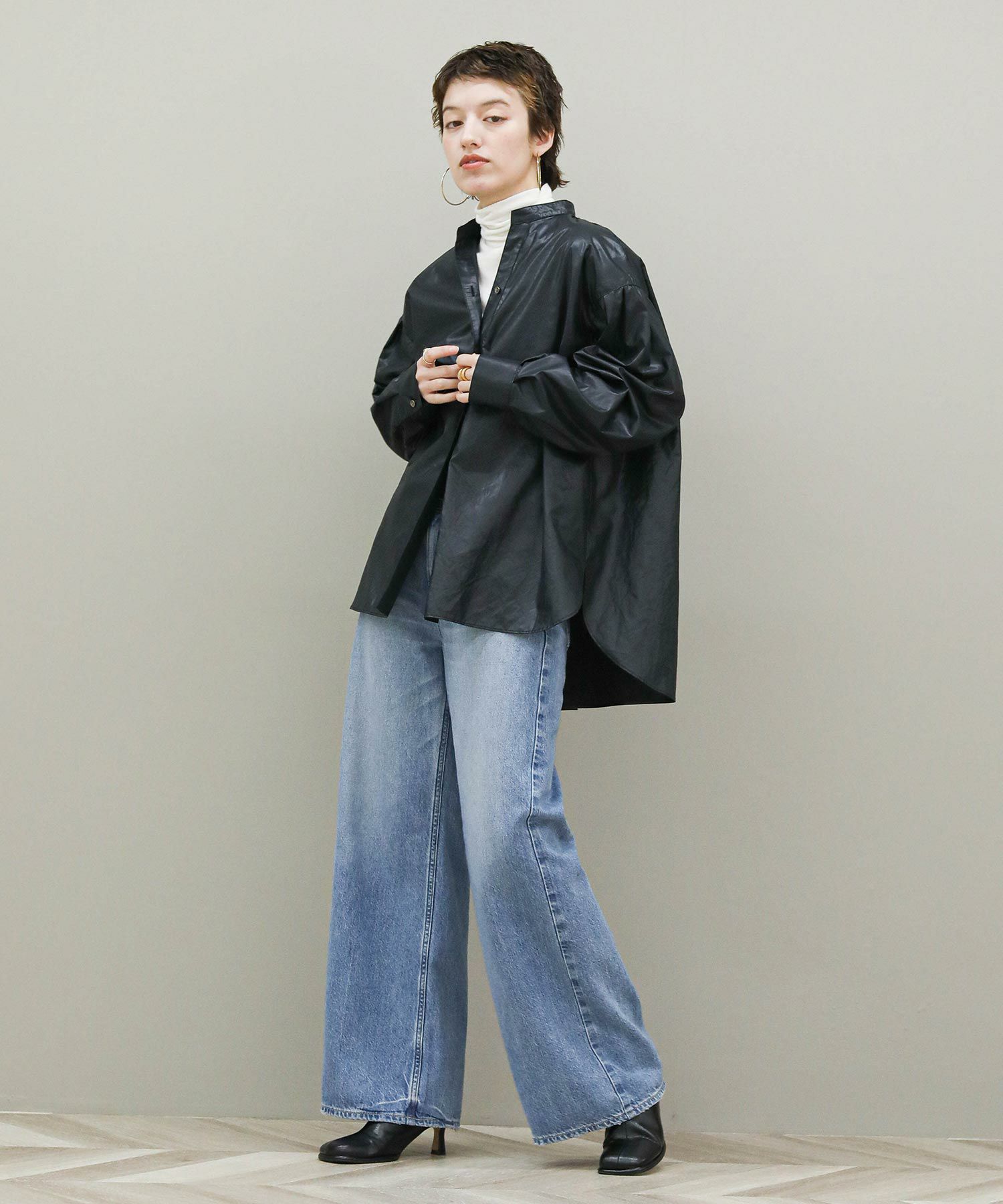 袖にボリュームをもたせることでハードになりがちなレザーアイテムを女性らしく仕上げました。スキッパーデザインを活かしてインナーにタートルやロンT仕込むのもおすすめ。腰回りをカバーしてくれる着丈なのでタイトスカートと好相性。スラックスやワイドパンツとはタックインしてきるとバランスも取りやすいです。