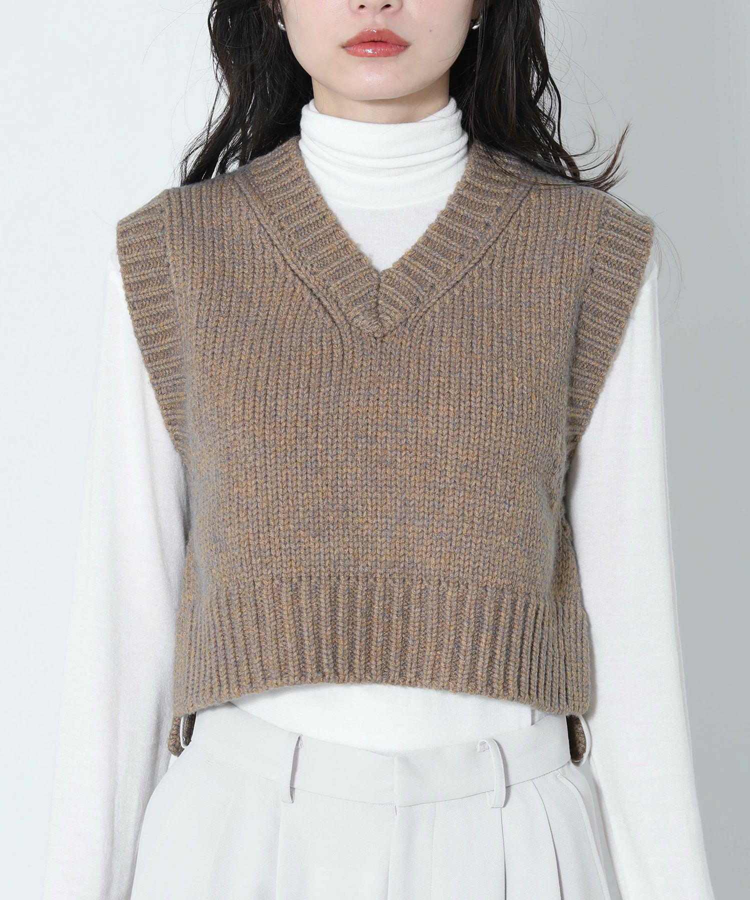 メランジの糸を使用して編んだニットベスト。