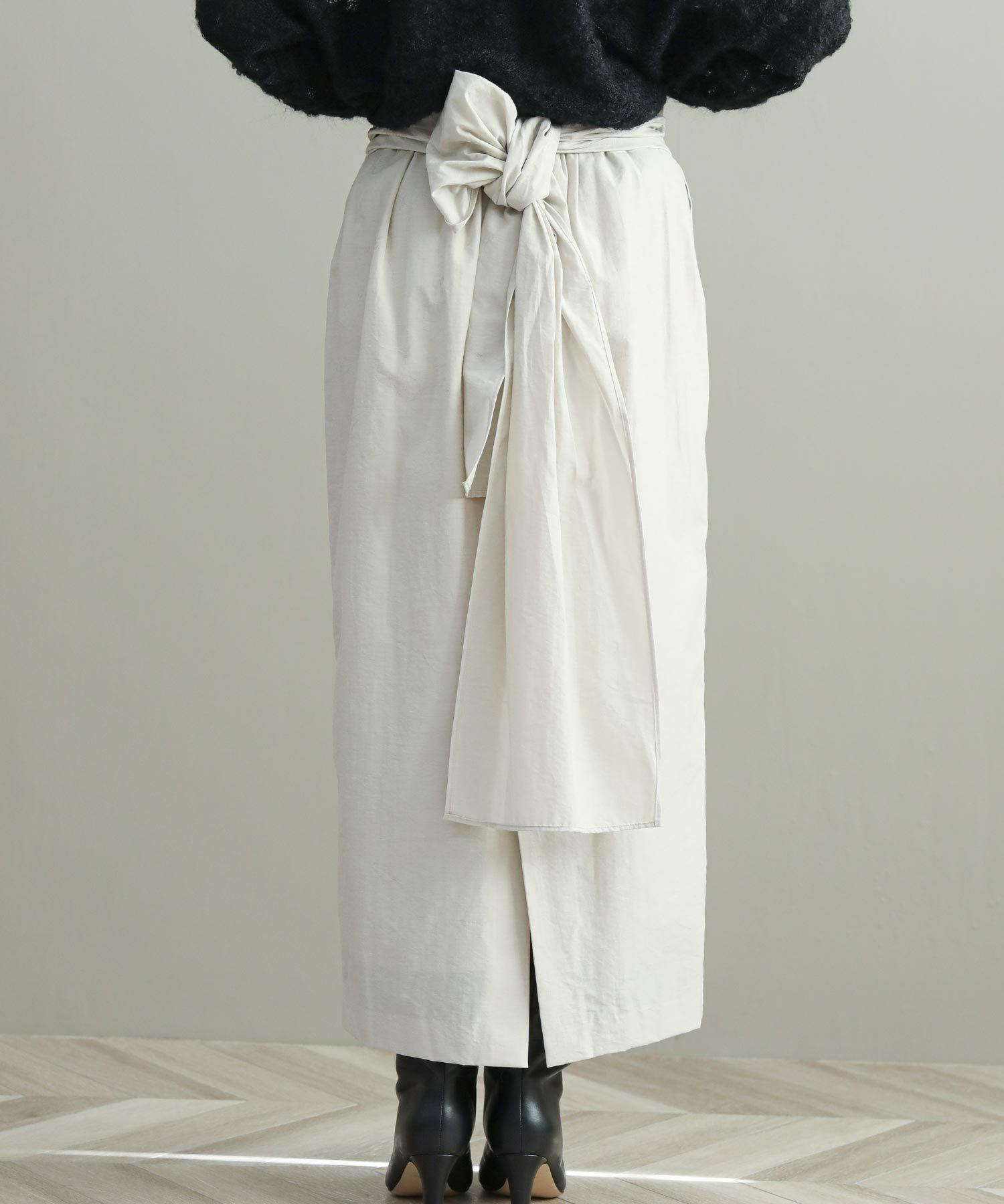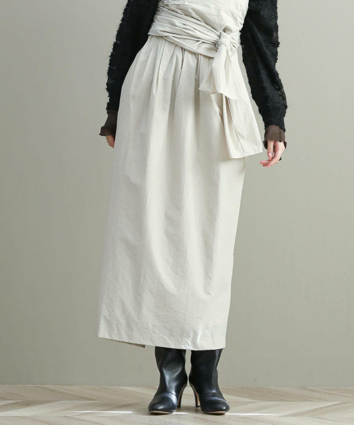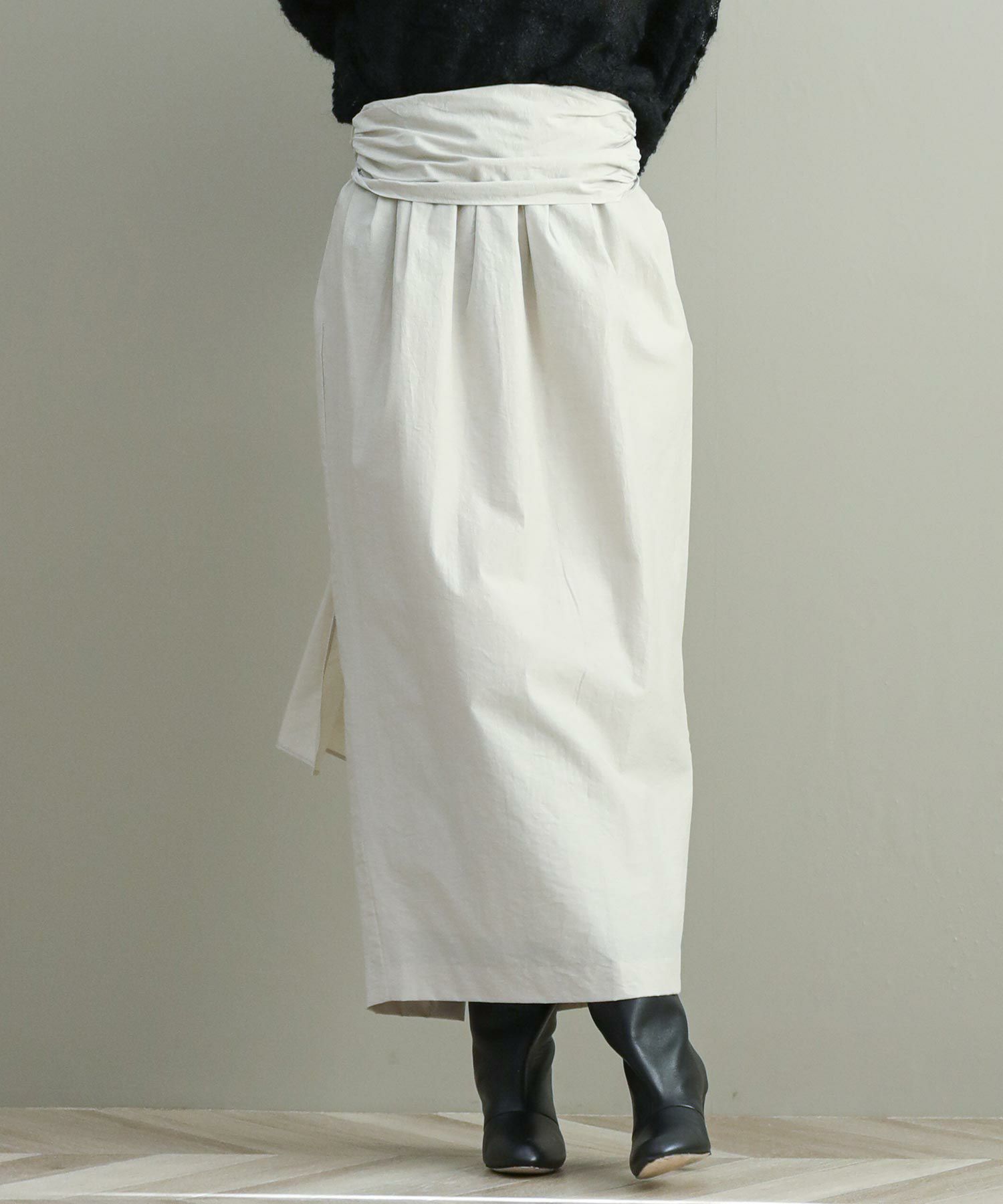 ナローシルエットのスカートは、ウエスト部分のタックが立体感をプラス。ウエストまわりもカバーしつつゴム仕様なので履き心地もストレスフリー。