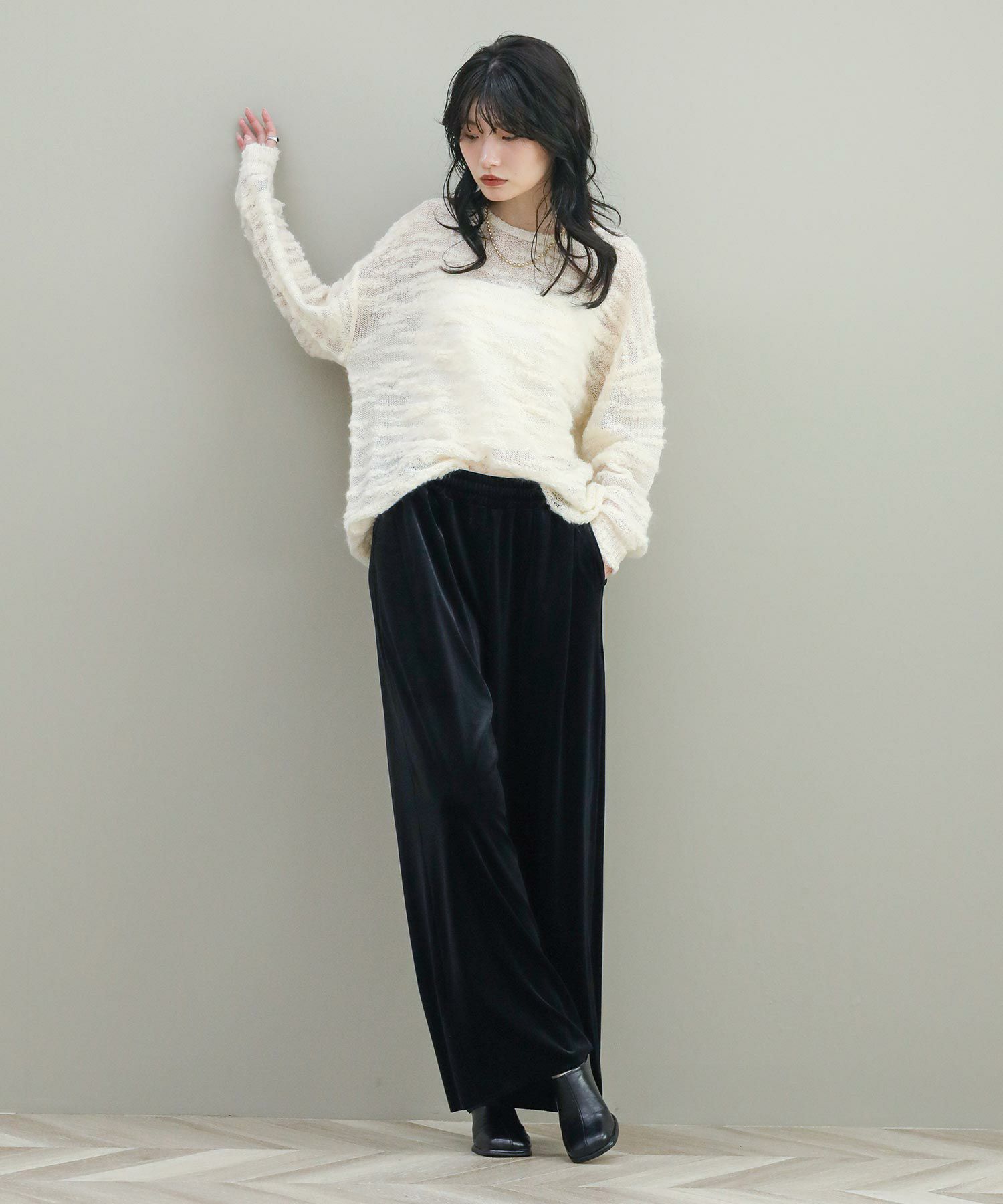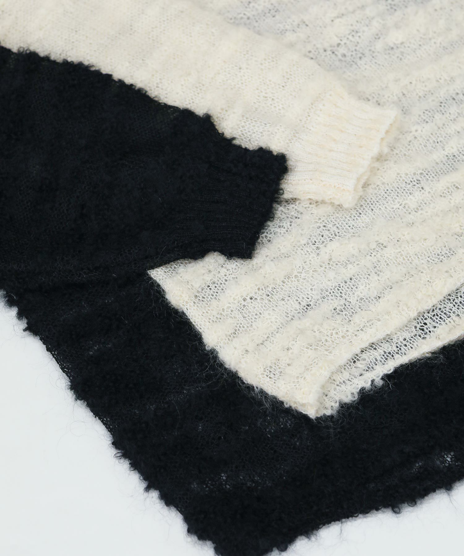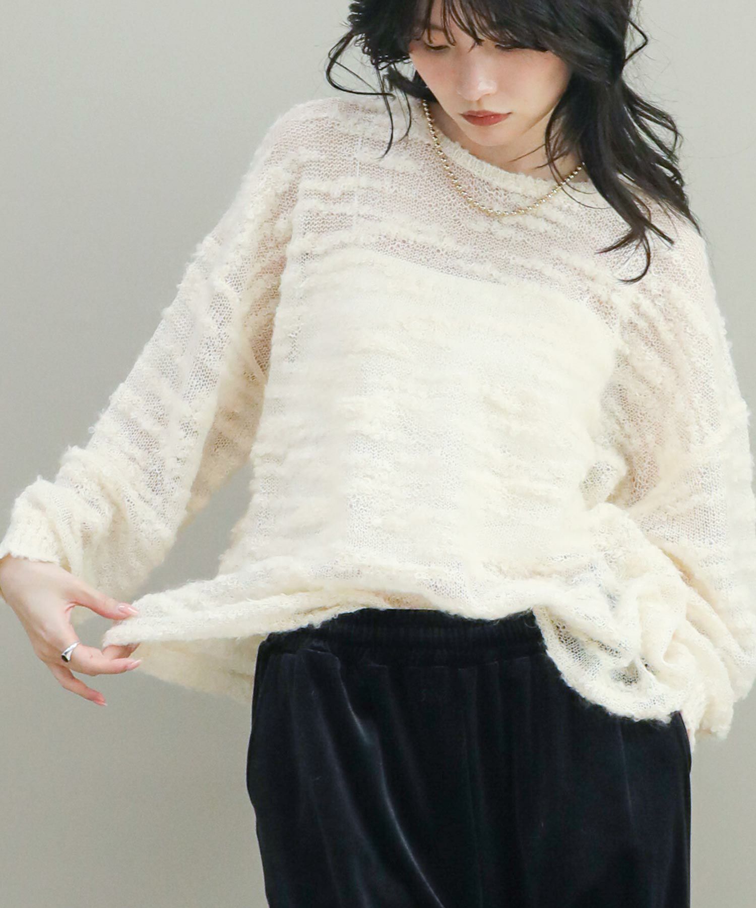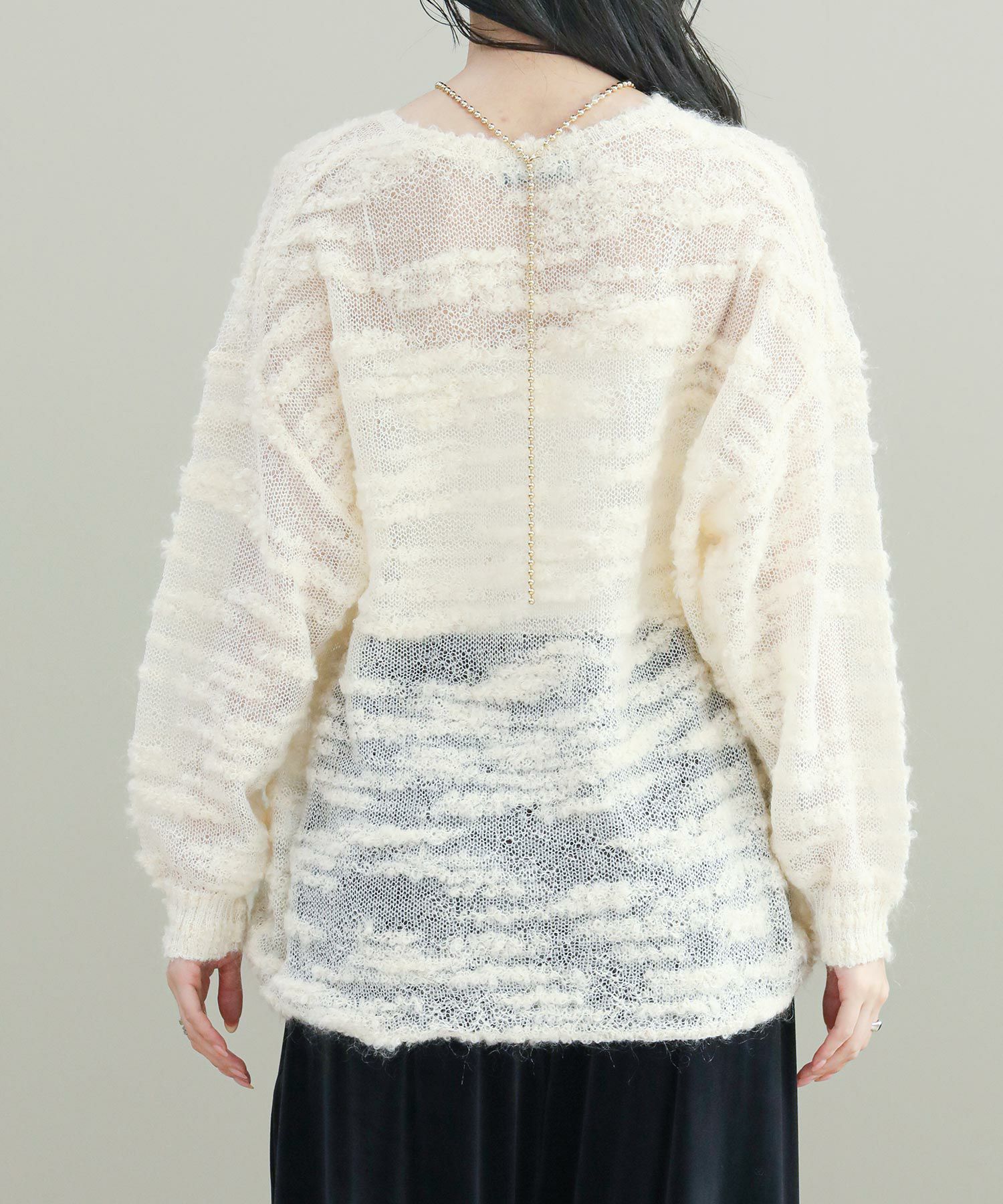 糸の繊細さやループ感を引き立てるためにざっくりとシアー感のある編地に仕上げています。ゆったりとしたサイジングに仕上げているので、シアー感を活かしたレイヤードスタイルを楽しんでいただけます。