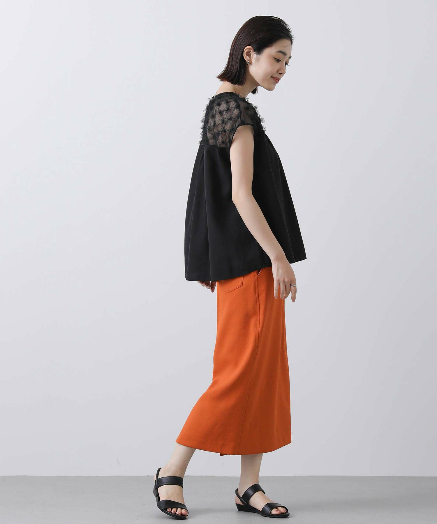 下の布帛は落ち感のある素材を選んでギャザーをたっぷり入れて動きのあるシルエットに仕上げました。