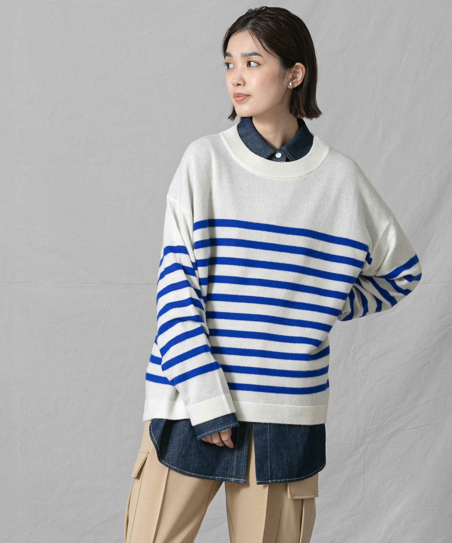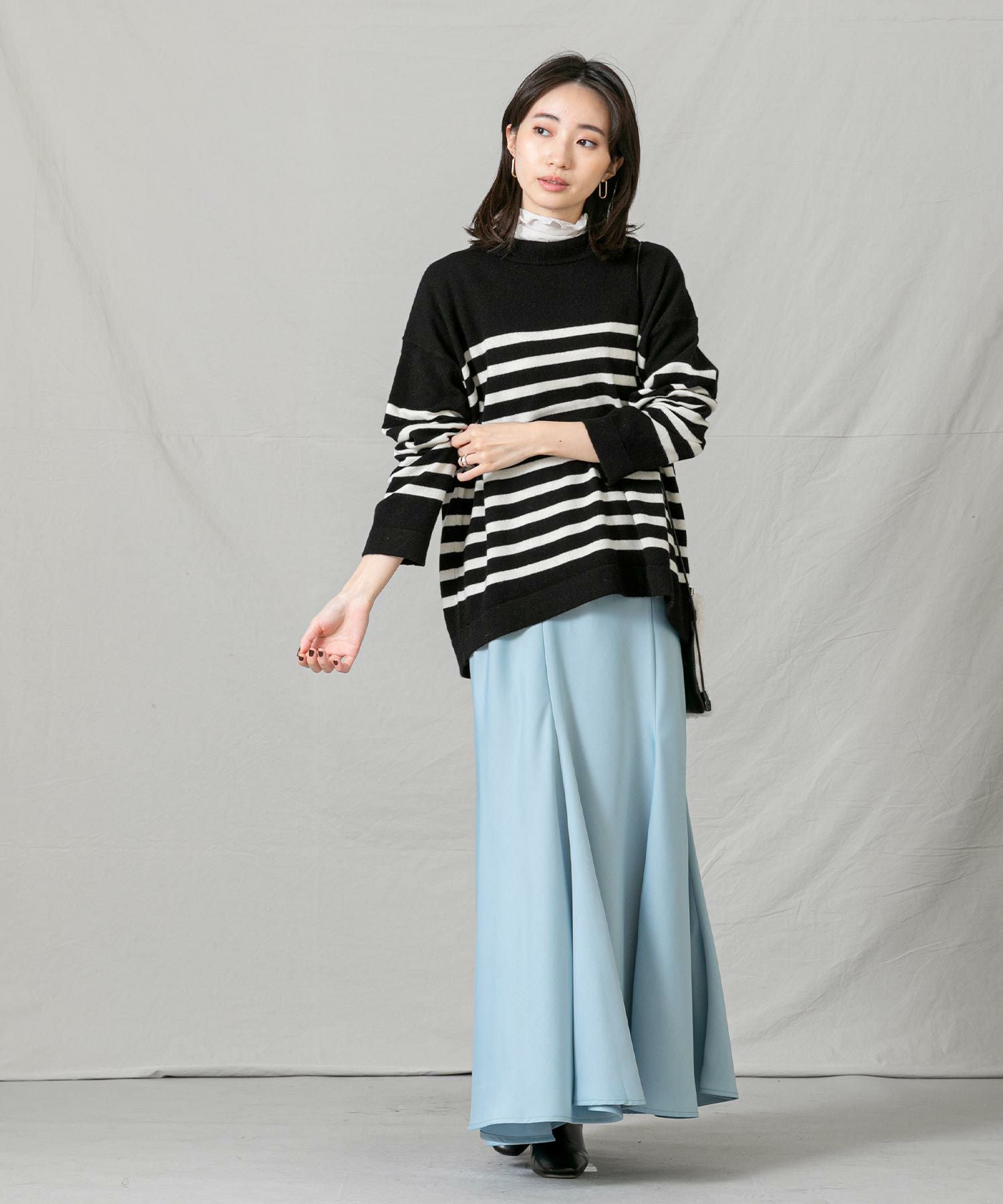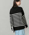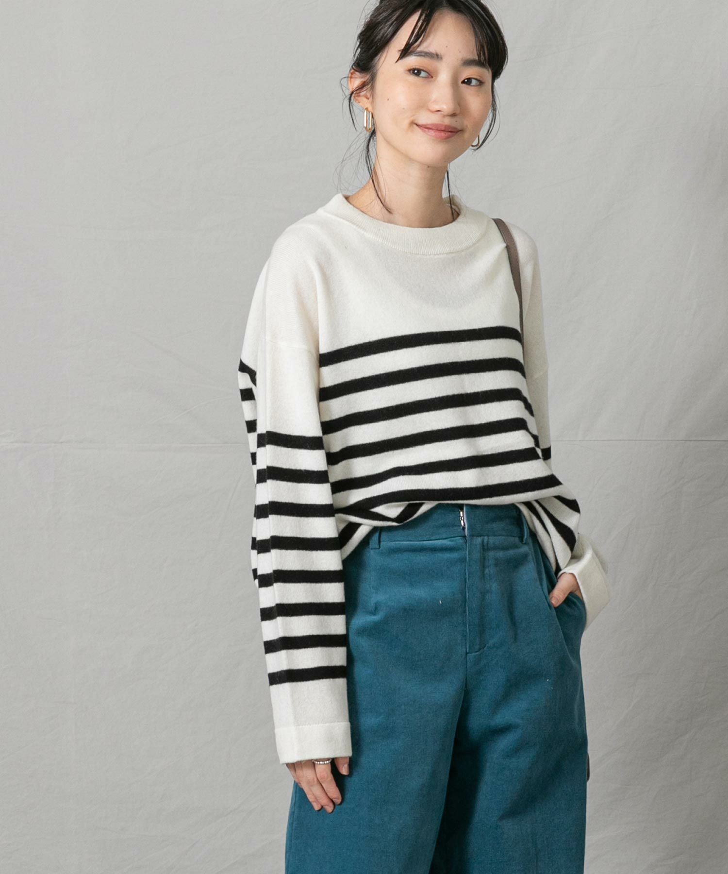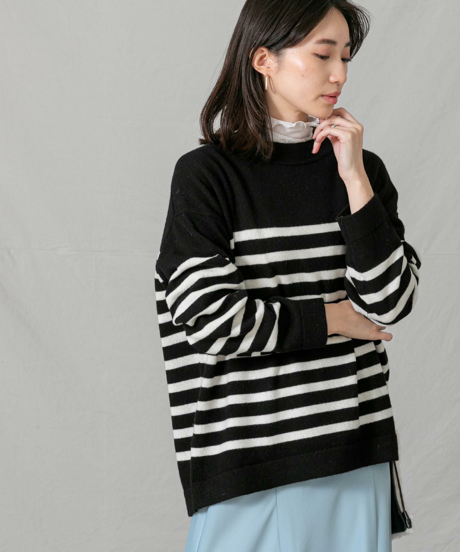上品なモックネックと、スタイリングに映えるパネルのボーダーが大人な印象です。程よくゆとりのあるサイズ感とニットの風合いがこなれ感のある1着◎