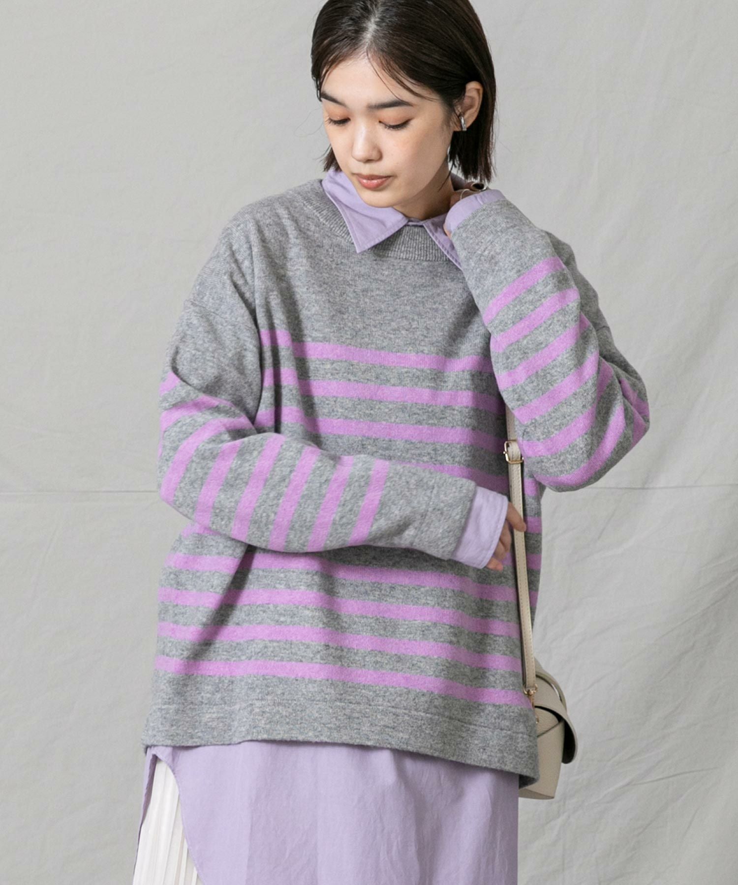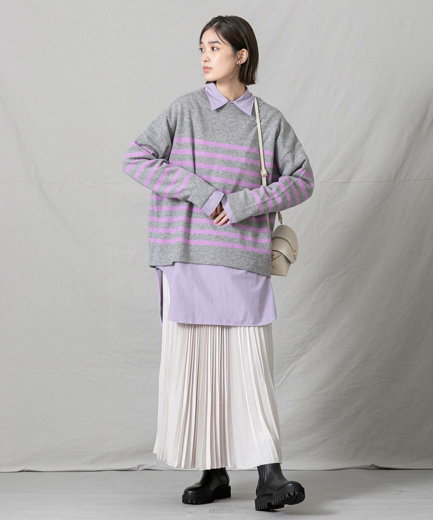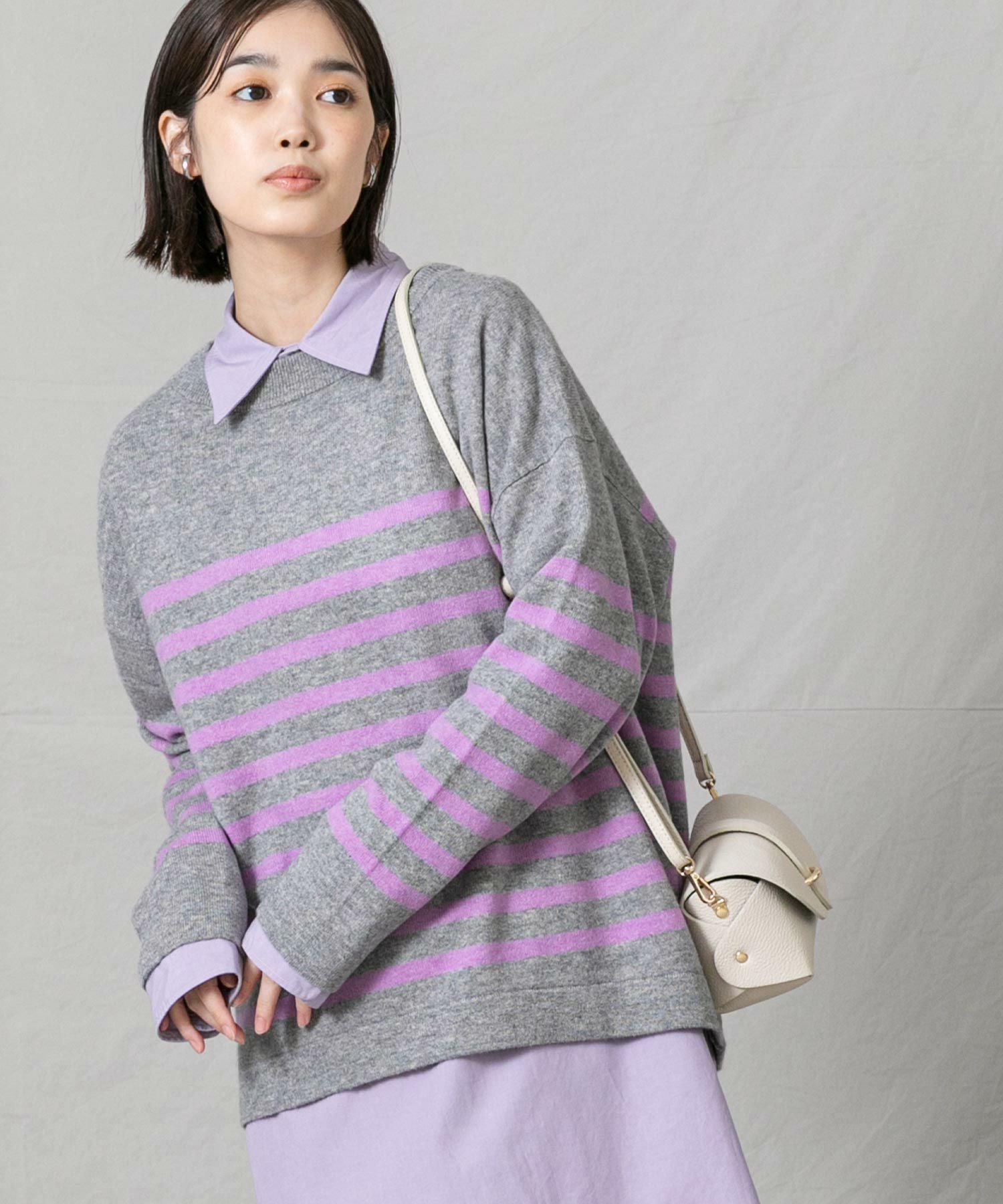 上品なモックネックと、スタイリングに映えるパネルのボーダーが大人な印象です。程よくゆとりのあるサイズ感とニットの風合いがこなれ感のある1着◎