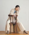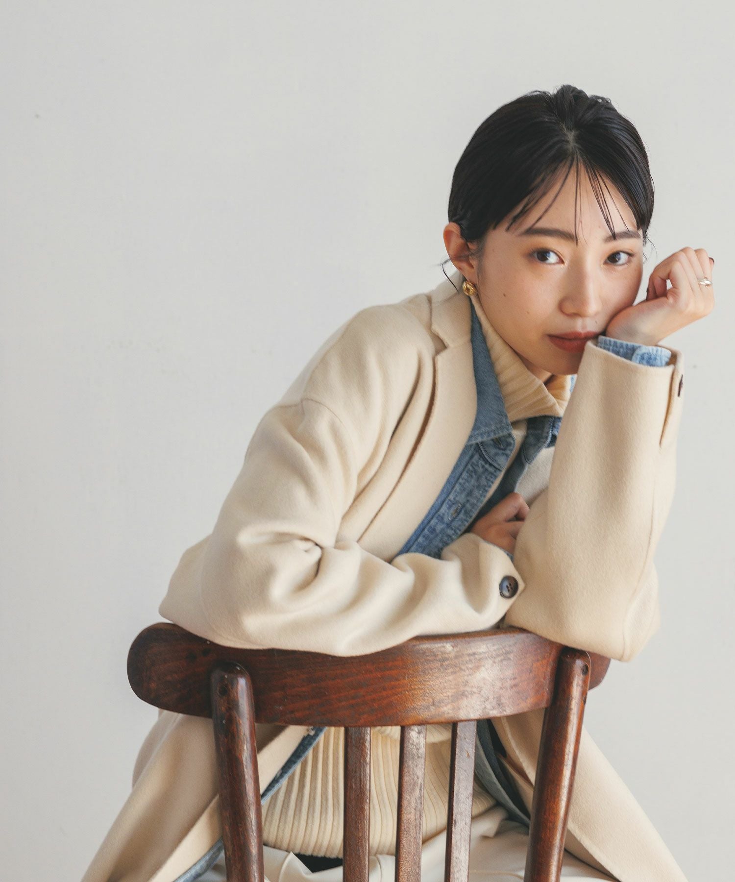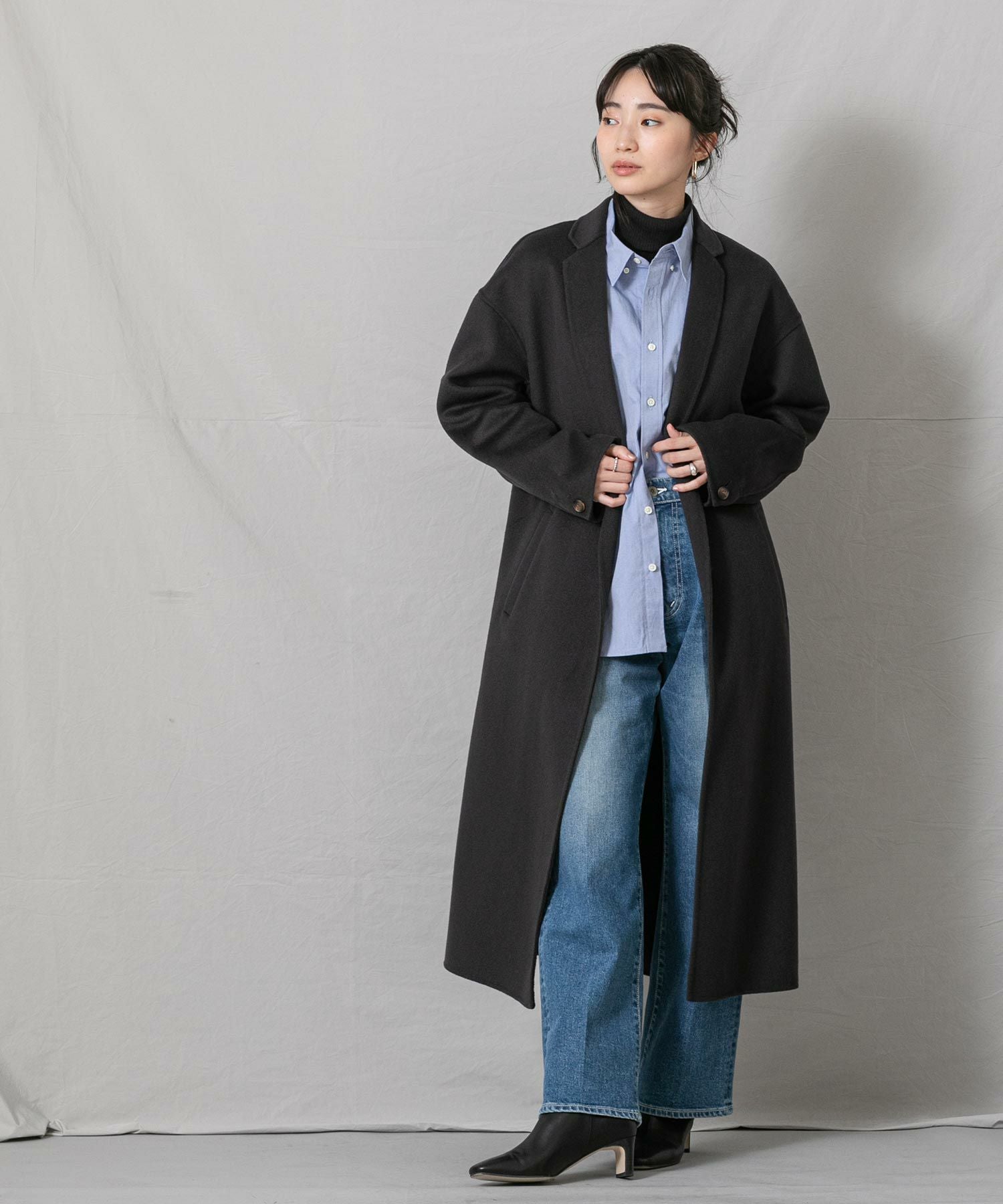 肩落ちデザインののゆるっとしたサイズ感が今っぽく、マニッシュになりすぎない細めのテーラーカラーがポイント。
