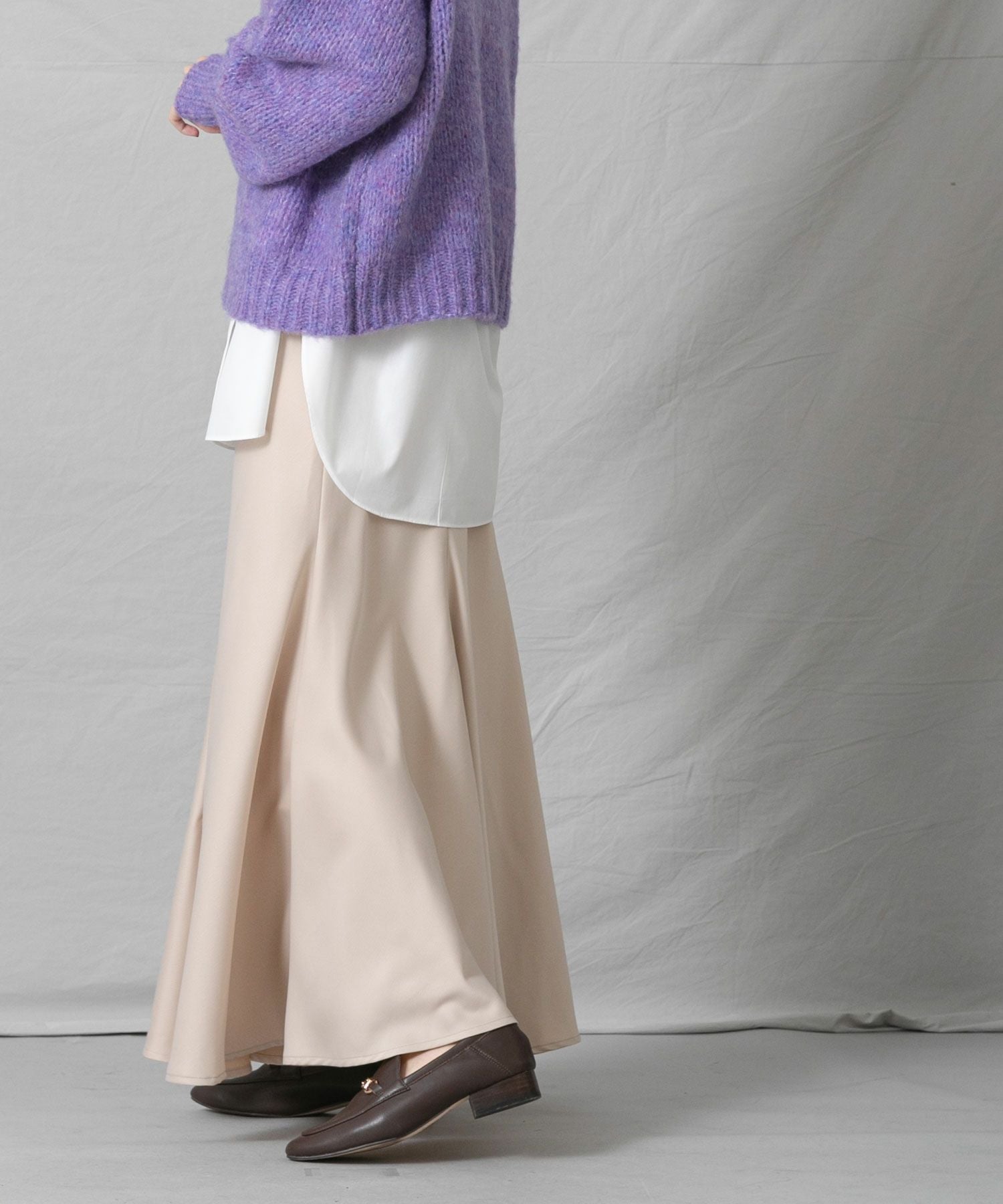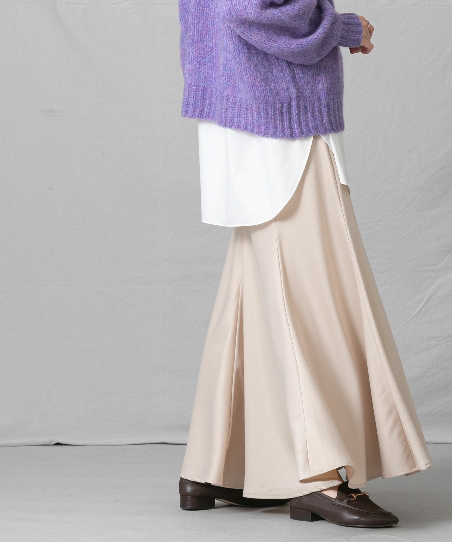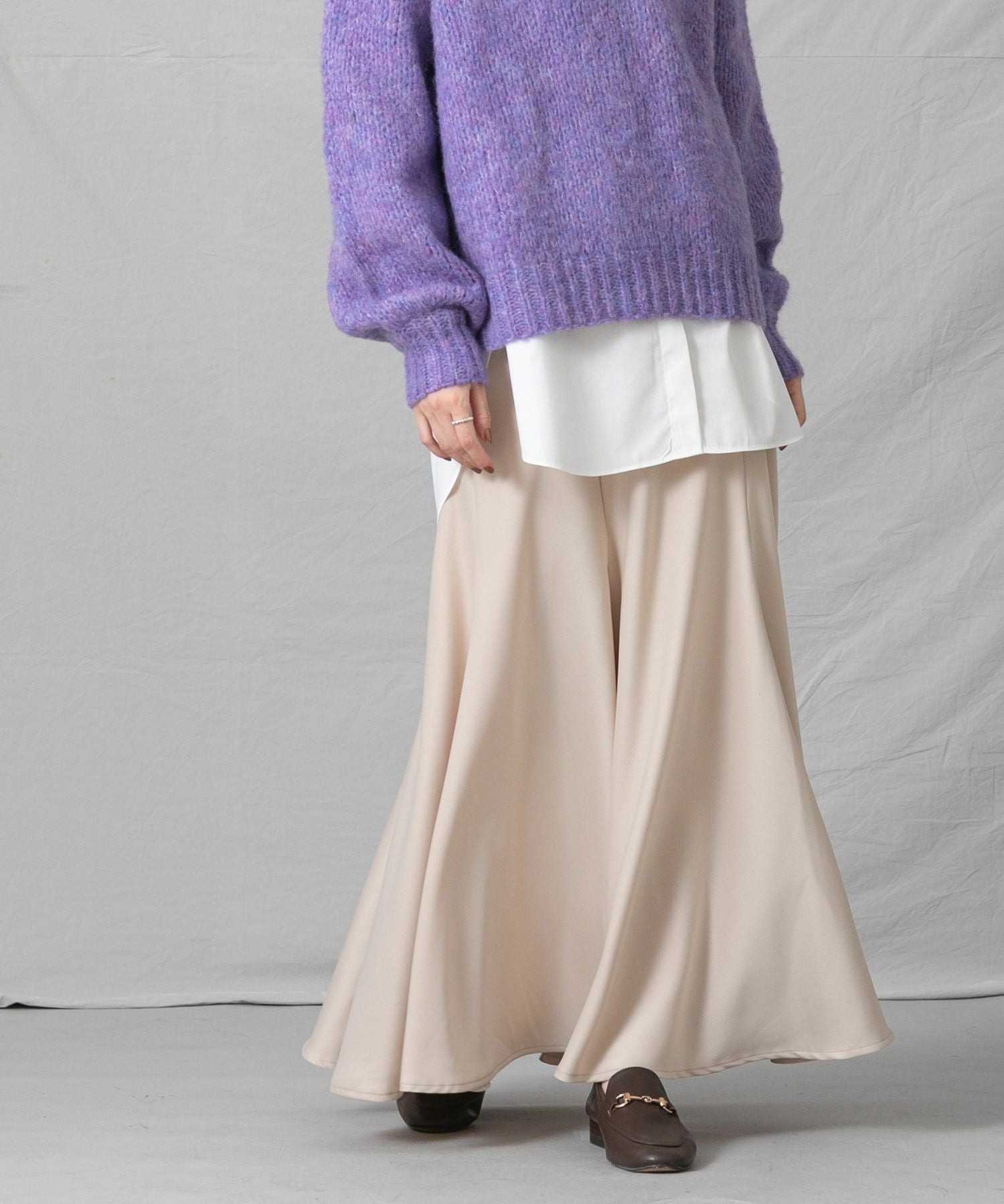 腰回りはすっきりと、裾に広がるフレアラインが歩くたびきれいなシルエットを作ります。足をきれいにスタイルよく見せてくれるのもポイントです。冬はざっくりとしたニットと合わせるのもおすすめです。