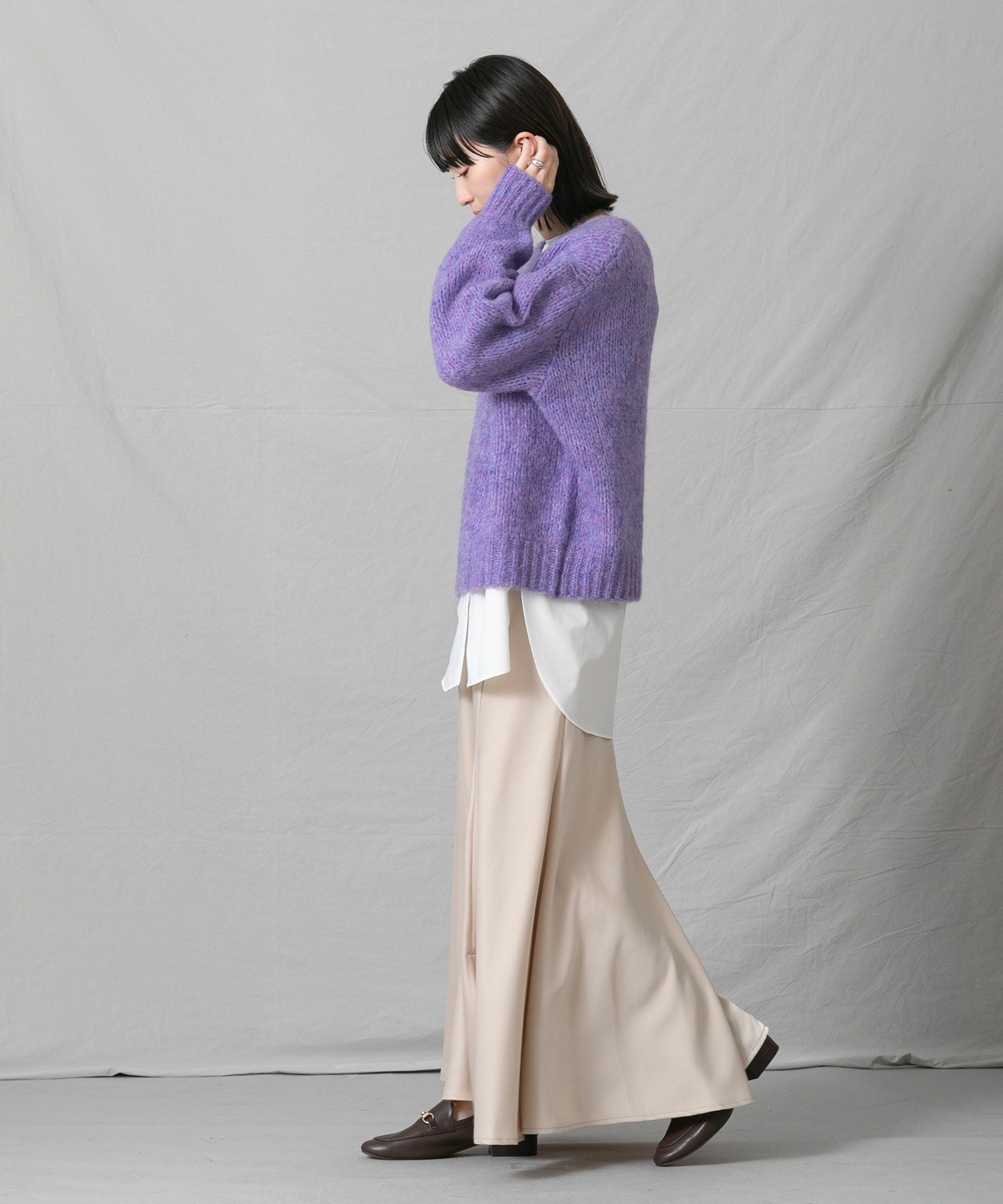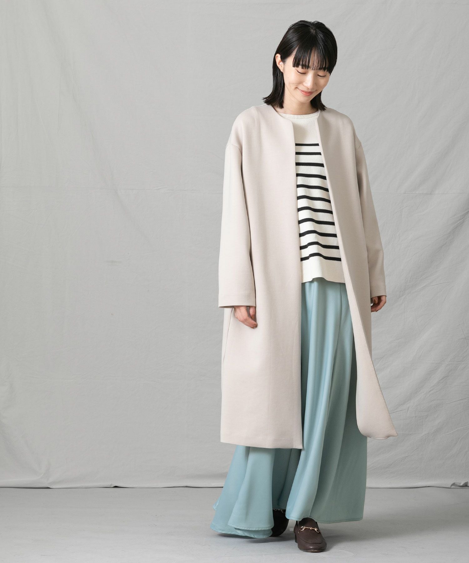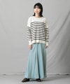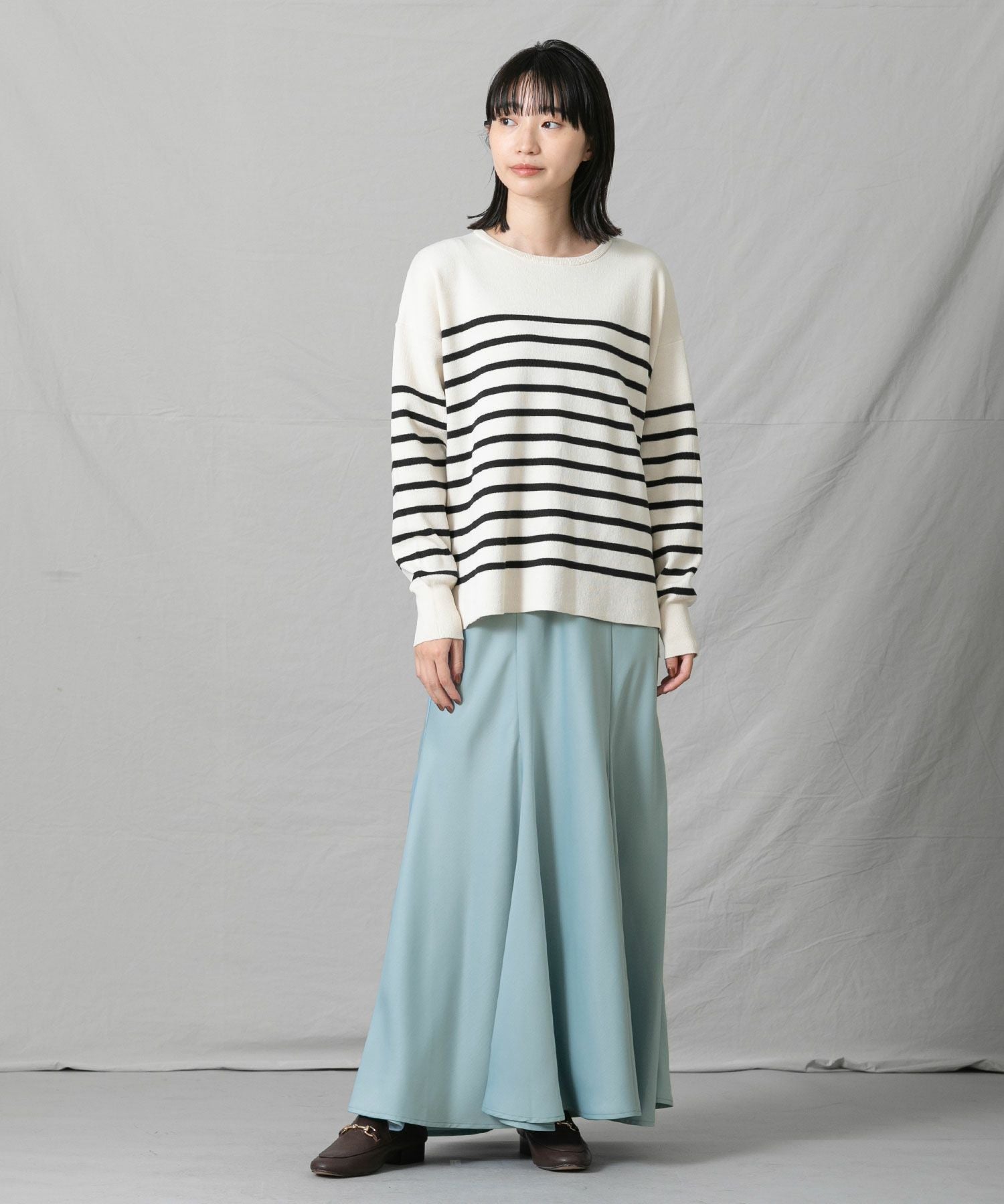 腰回りはすっきりと、裾に広がるフレアラインが歩くたびきれいなシルエットを作ります。足をきれいにスタイルよく見せてくれるのもポイントです。冬はざっくりとしたニットと合わせるのもおすすめです。