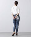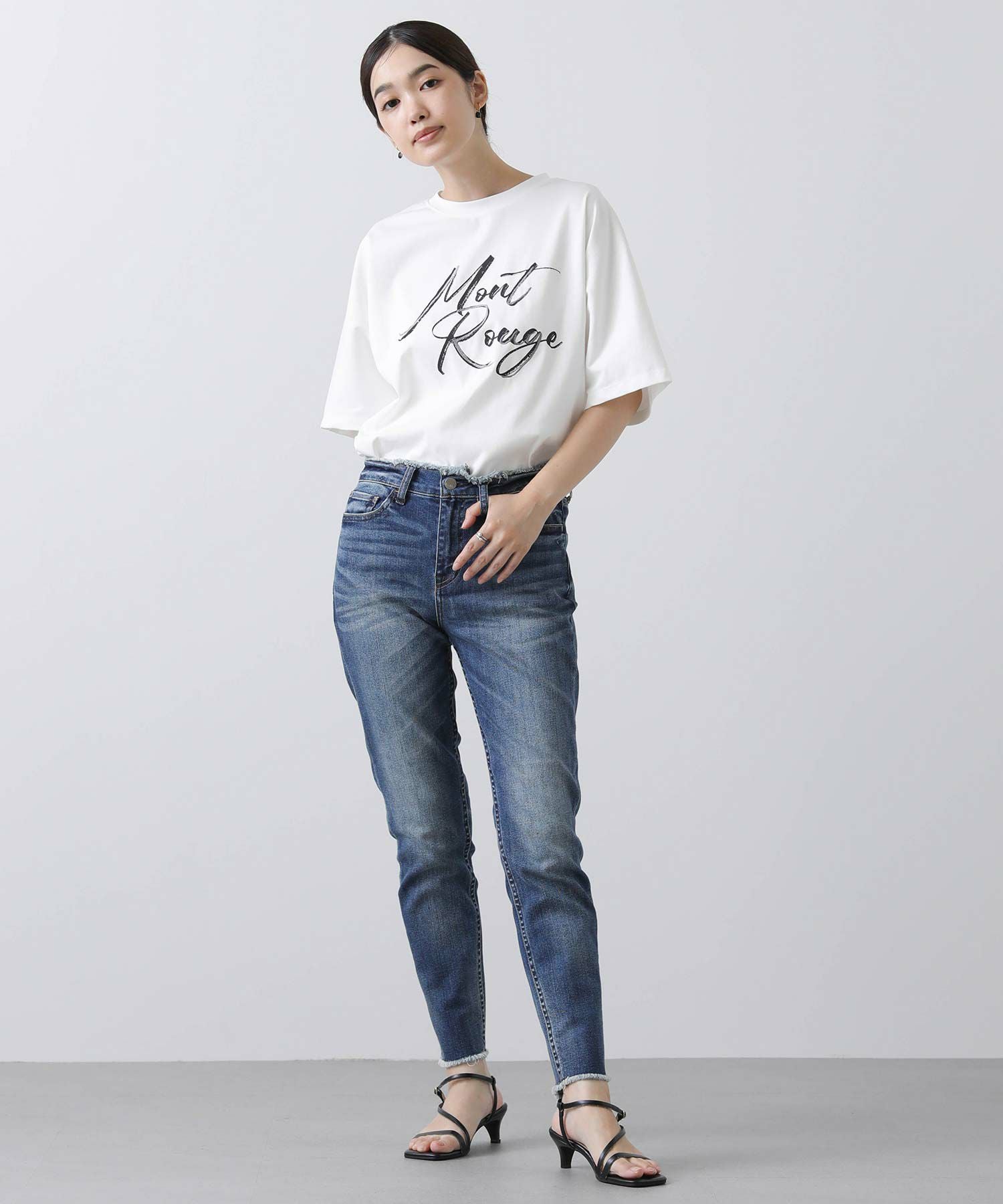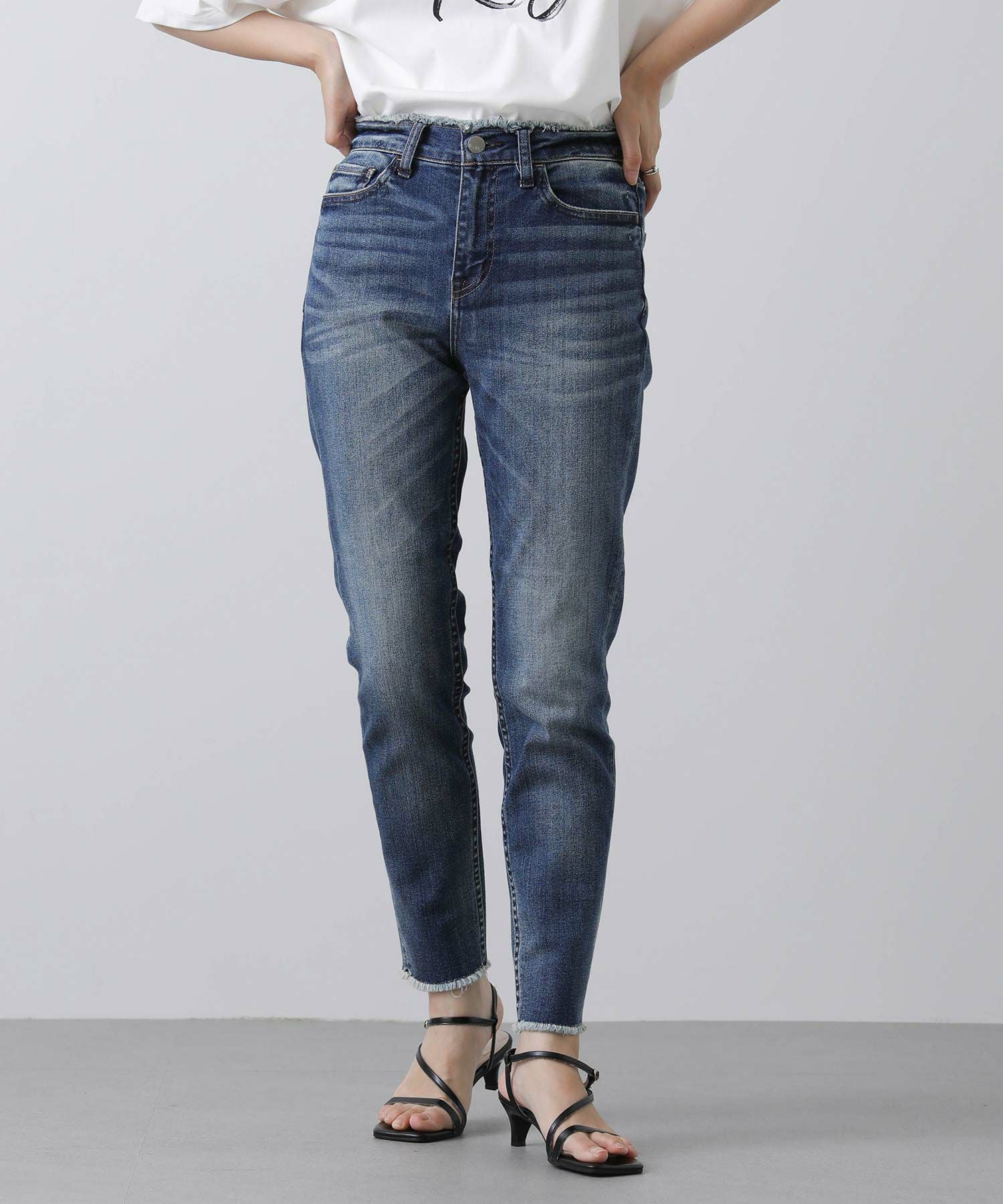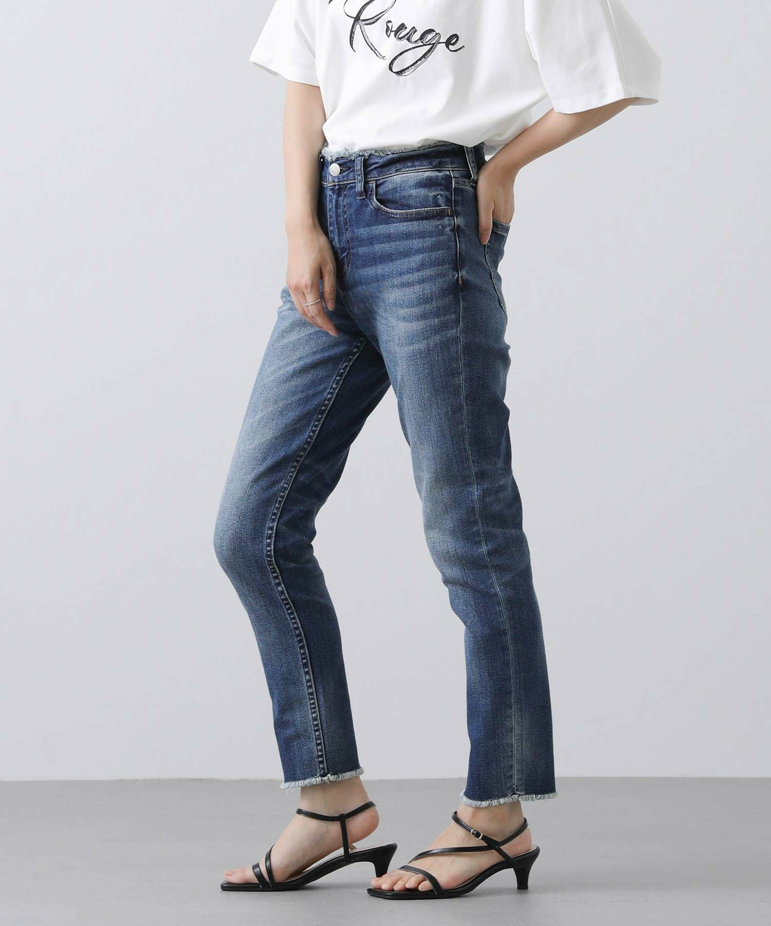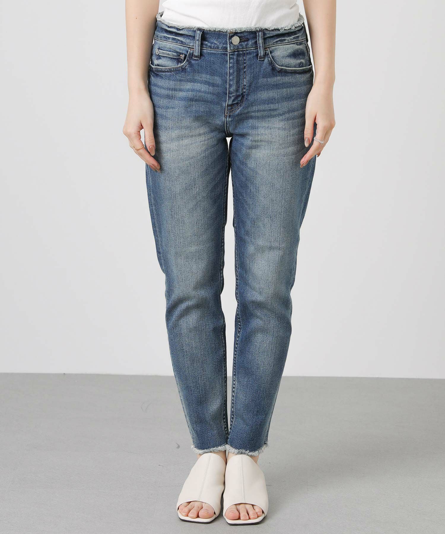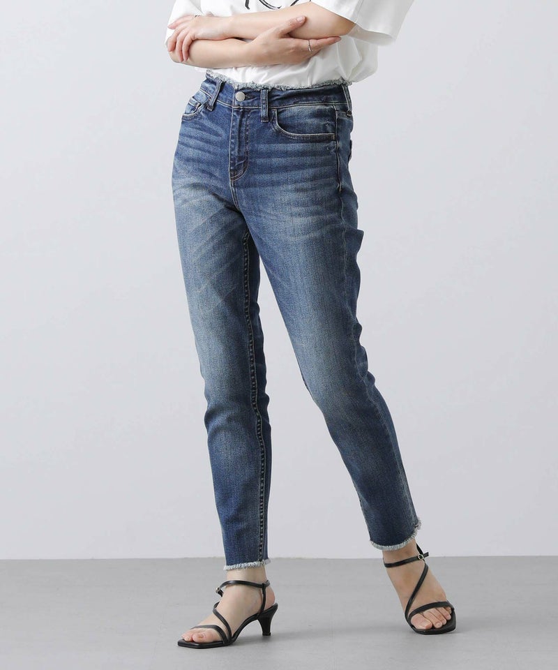 ウエストと裾はフリンジ加工を施し、アクセントに。ピッタリしすぎず、脚をすっきりと見せてくれるので、どんなトップスを合わせても様になります。