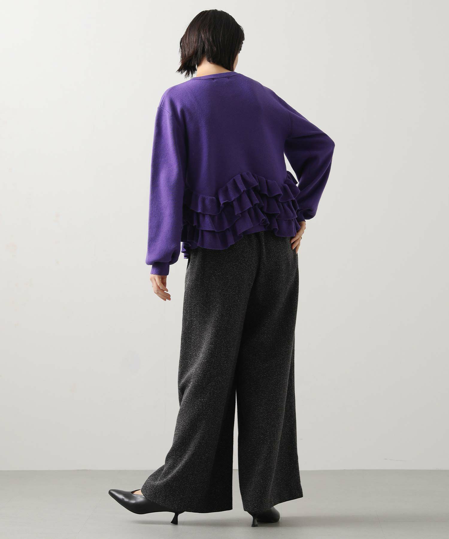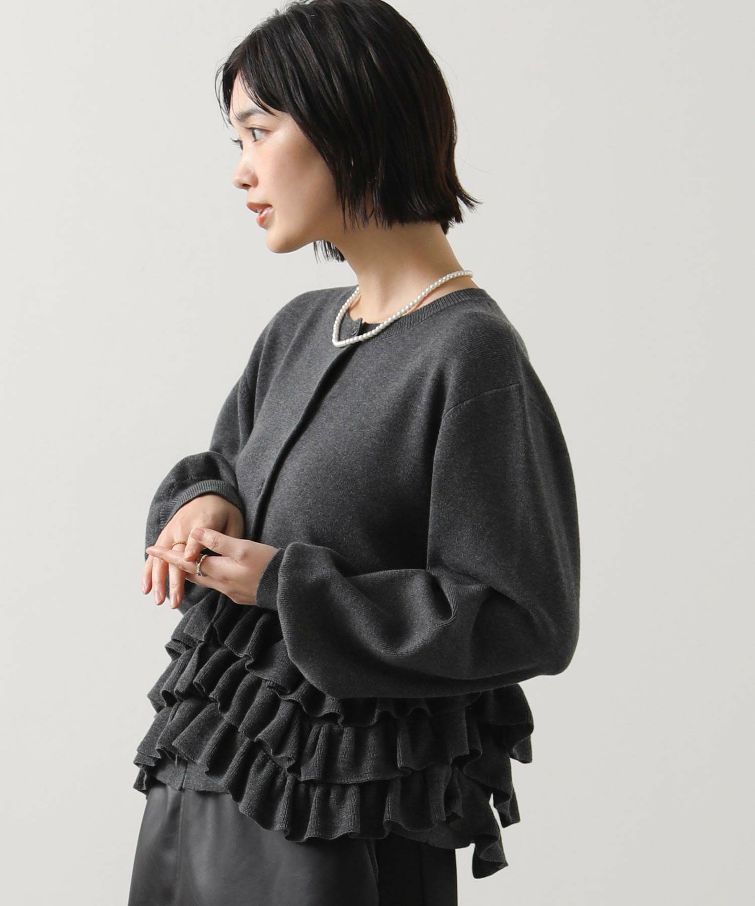 ニットの編みで作るフリルをティアードにして付けることによって、新しいフリルの見え方を表現。