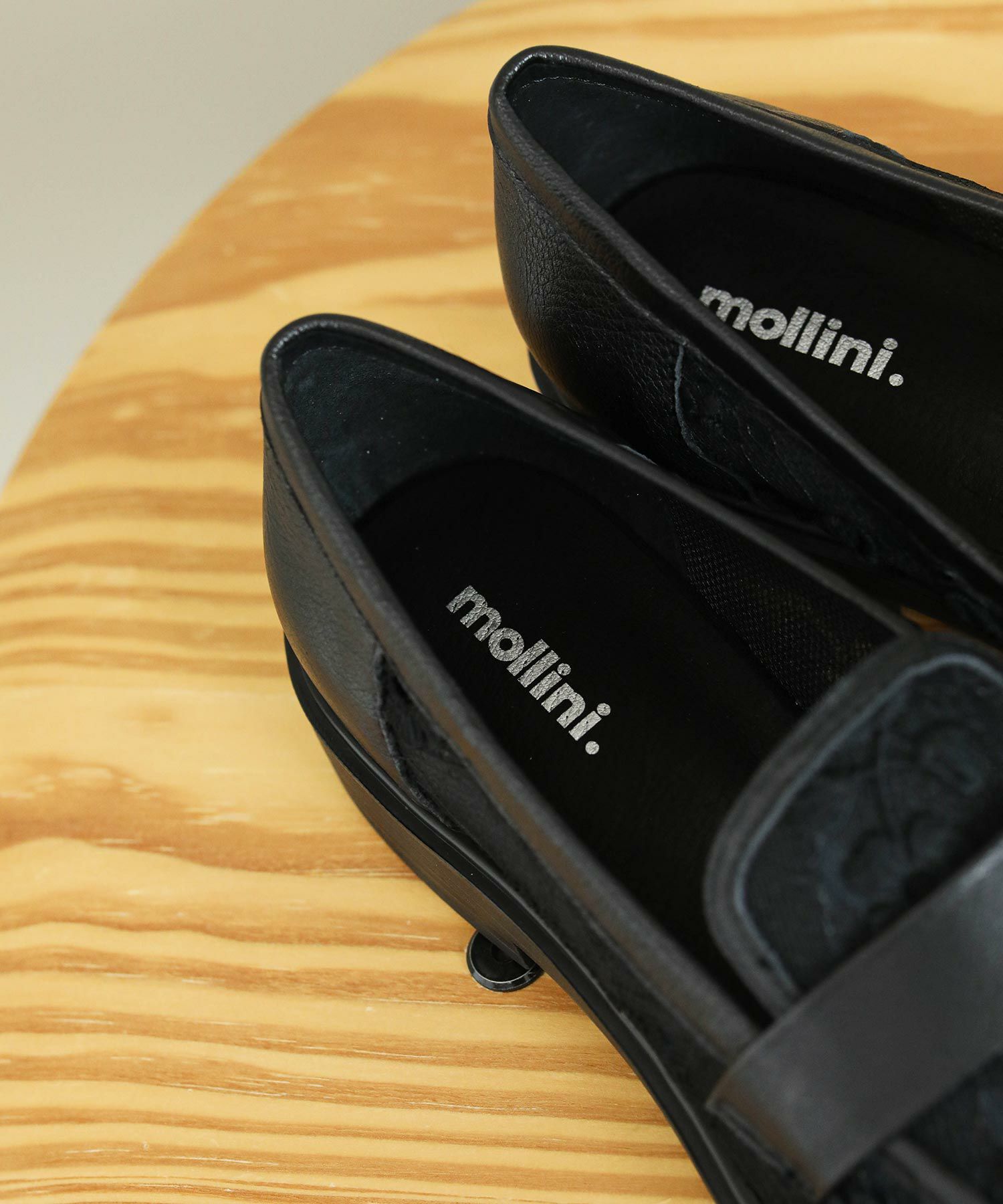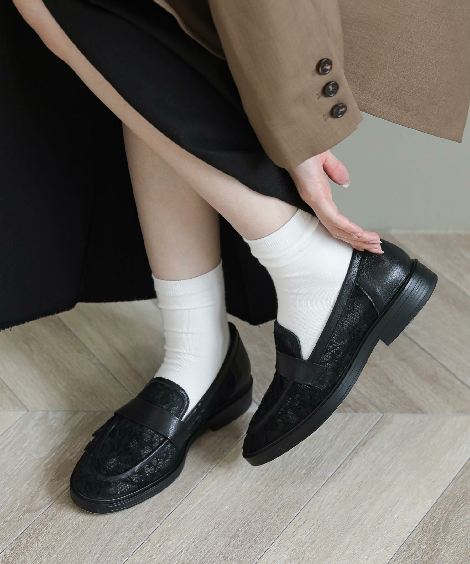 黒を基調としたメッシュ素材の透け感がレースの甘さを抑えモードな印象。甲部分にあしらわれたレザーディテールがアクセントを添えます。靴下を合わせて色の変化を楽しむのがおすすめ。いつものデイリースタイルに合わせるだけで、洗練された雰囲気に。
