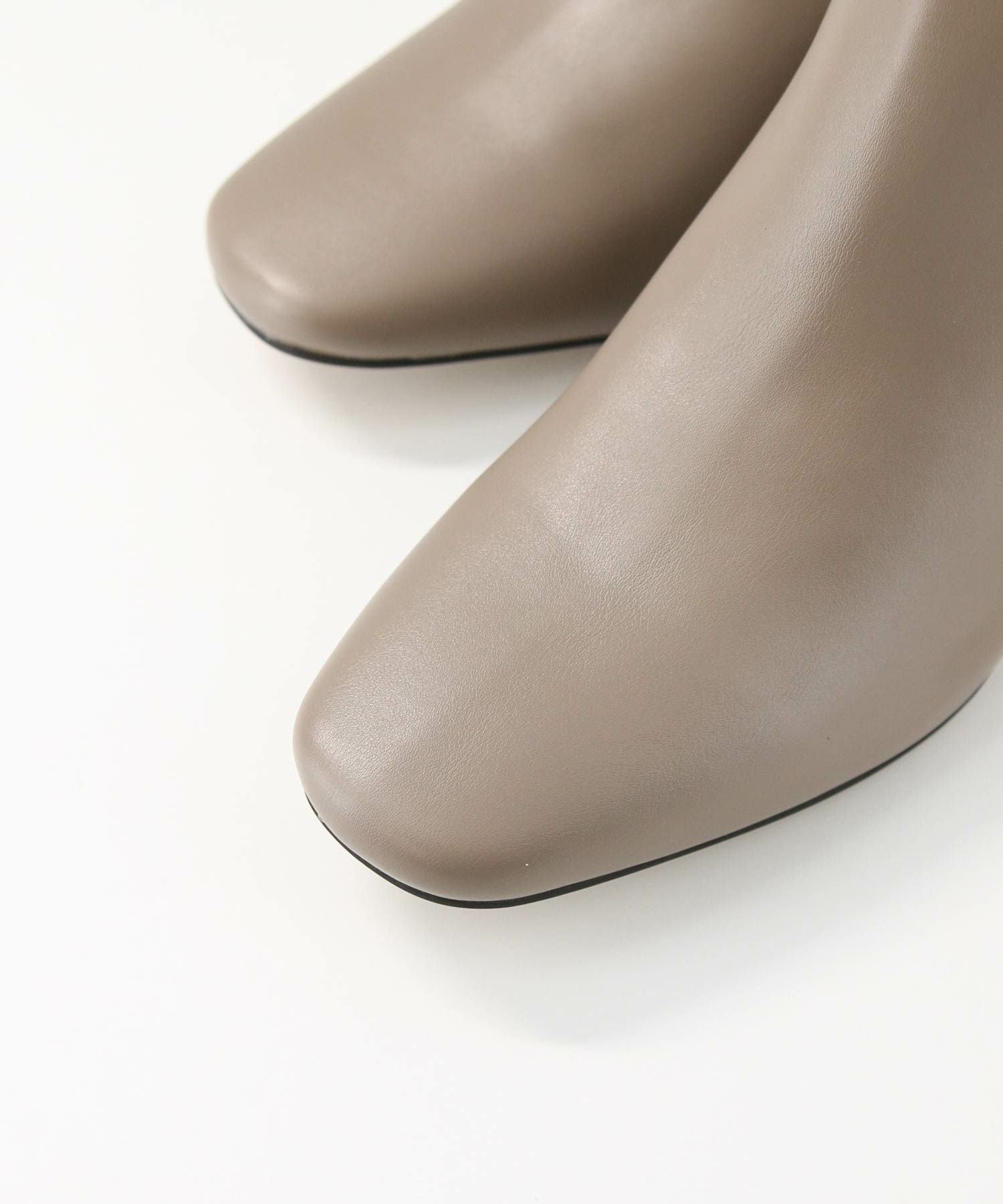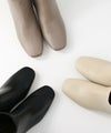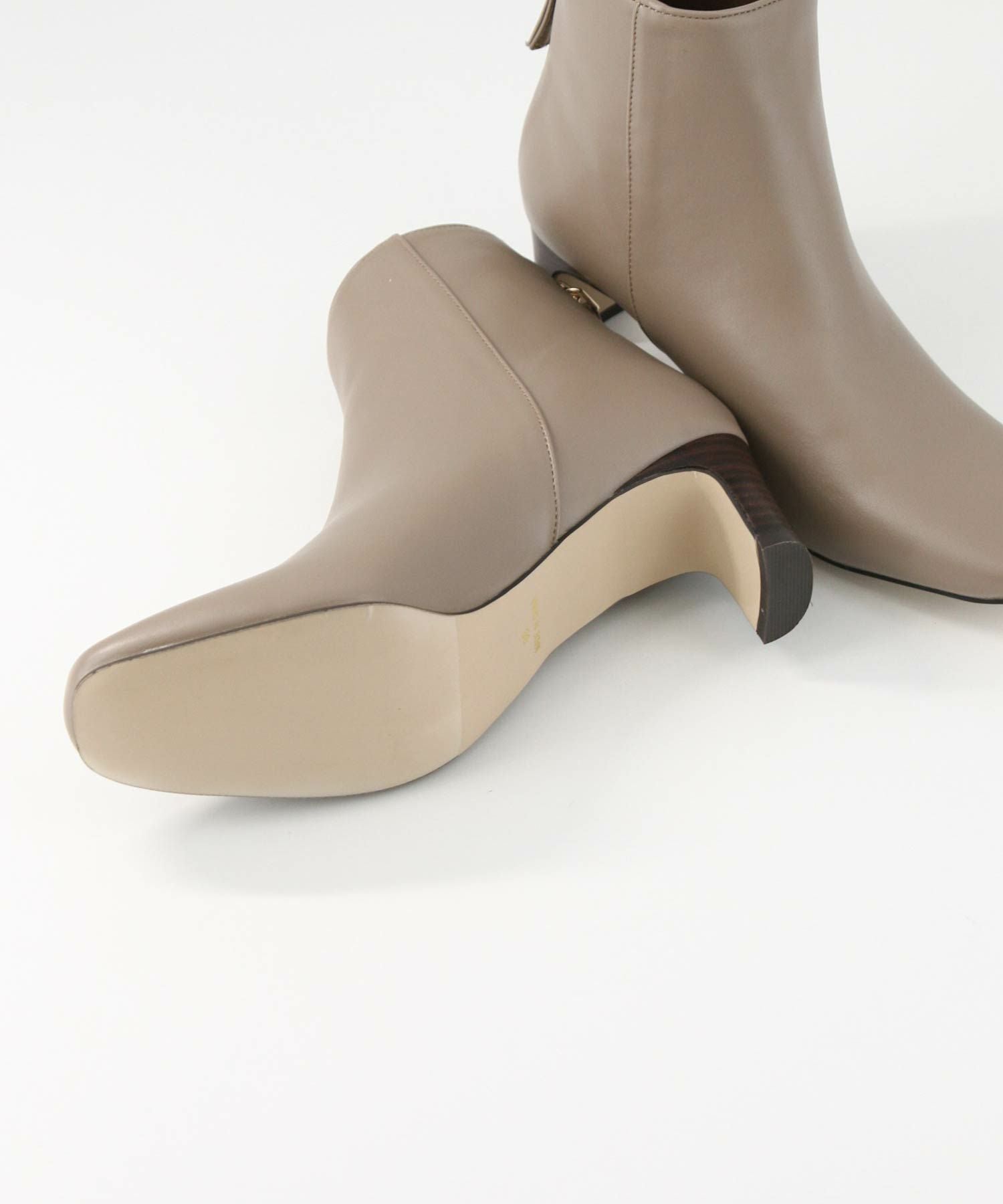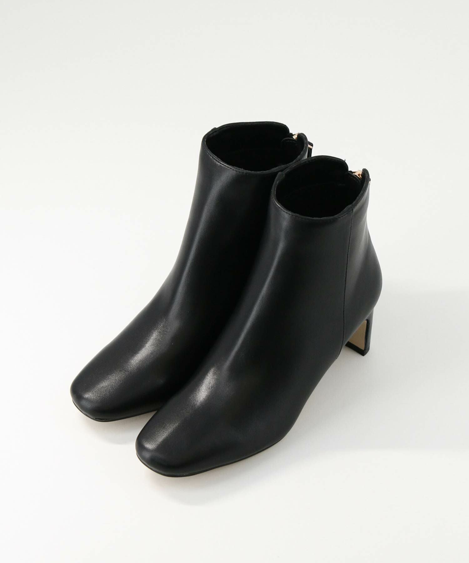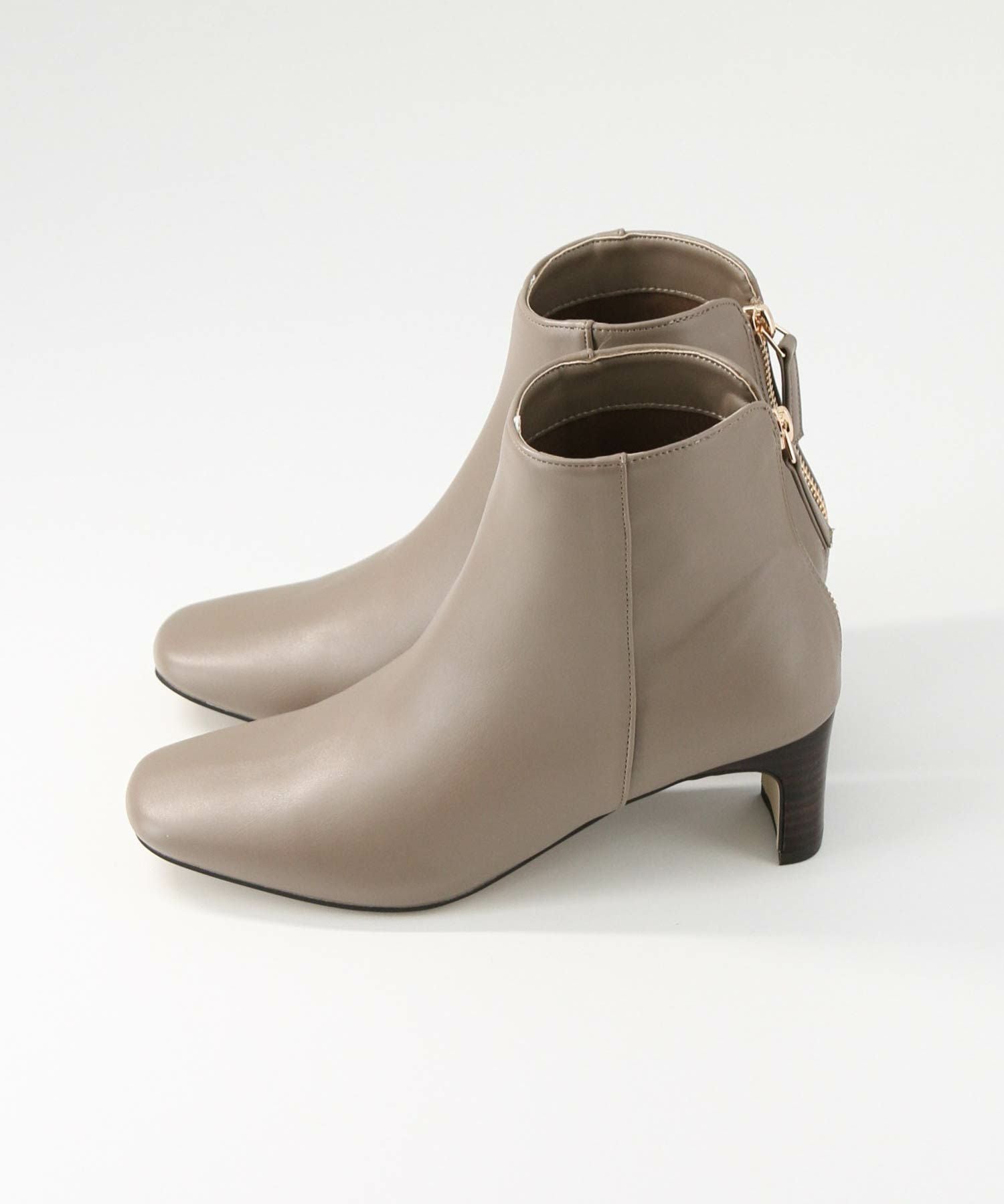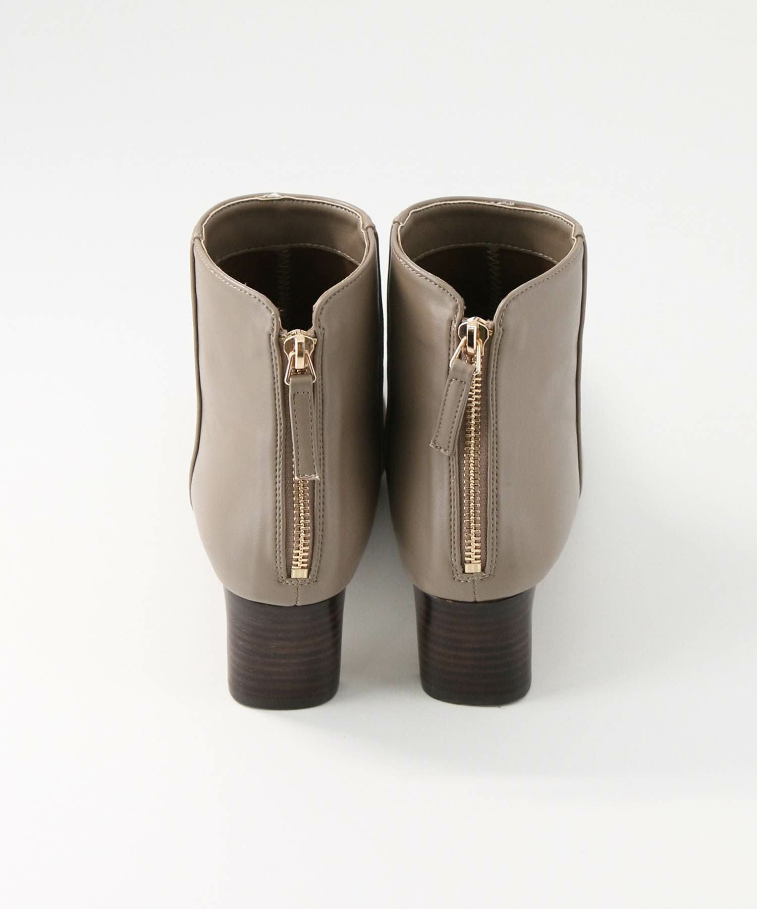 トゥの形はキープしながら後ろについたゴールドのジップがデザインアクセントになります。小柄な方でもバランスが取りやすいように長すぎず、すっきりと履けるバランスにしています。