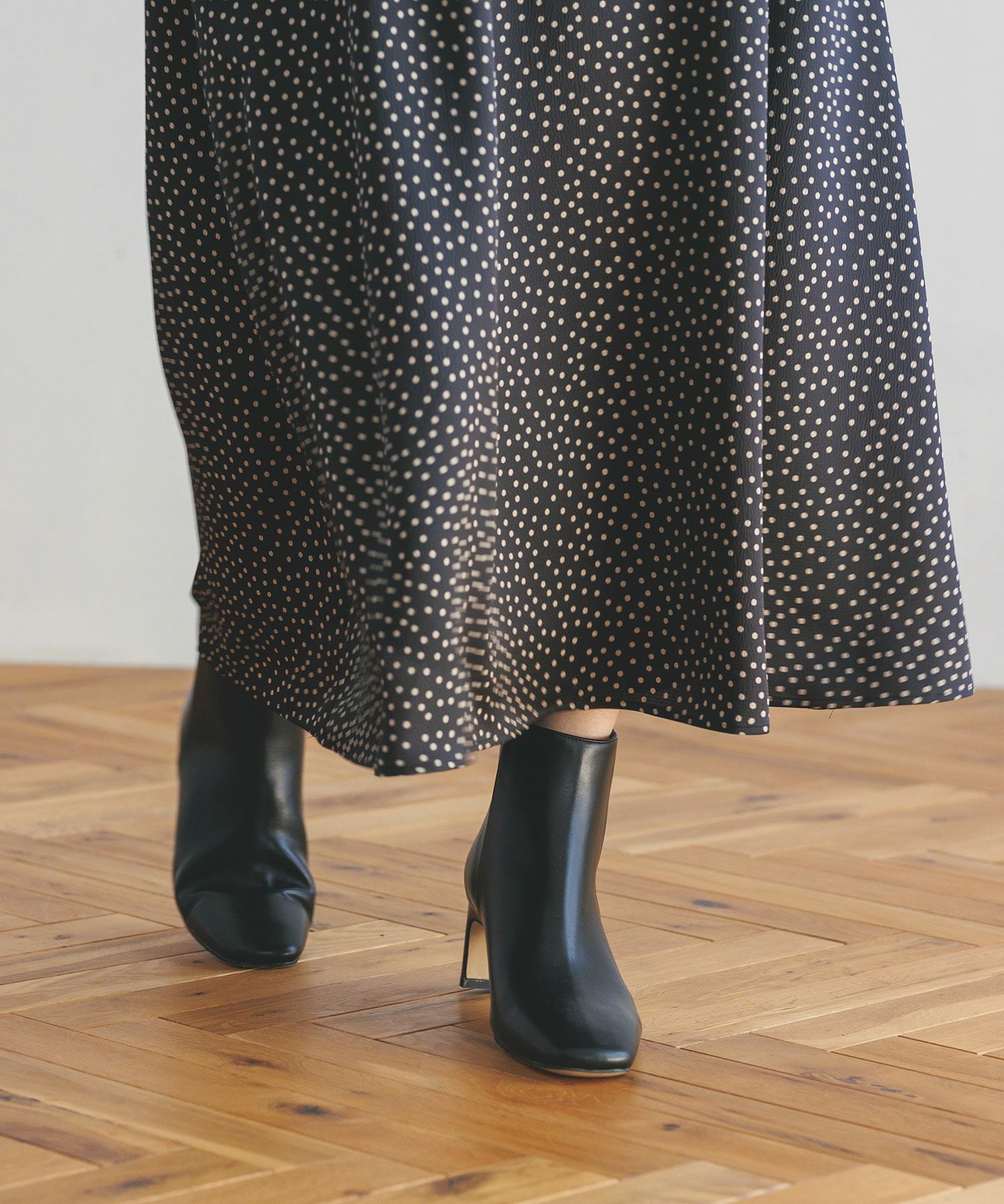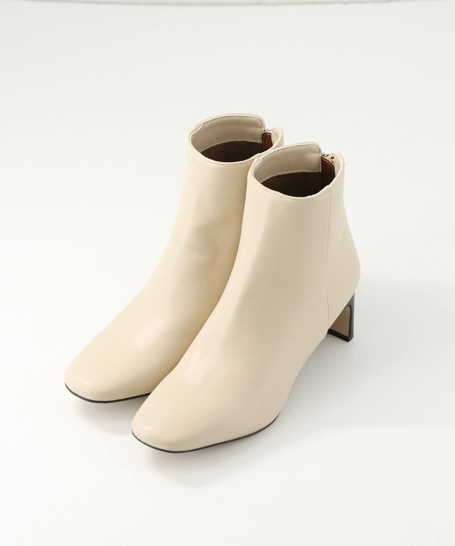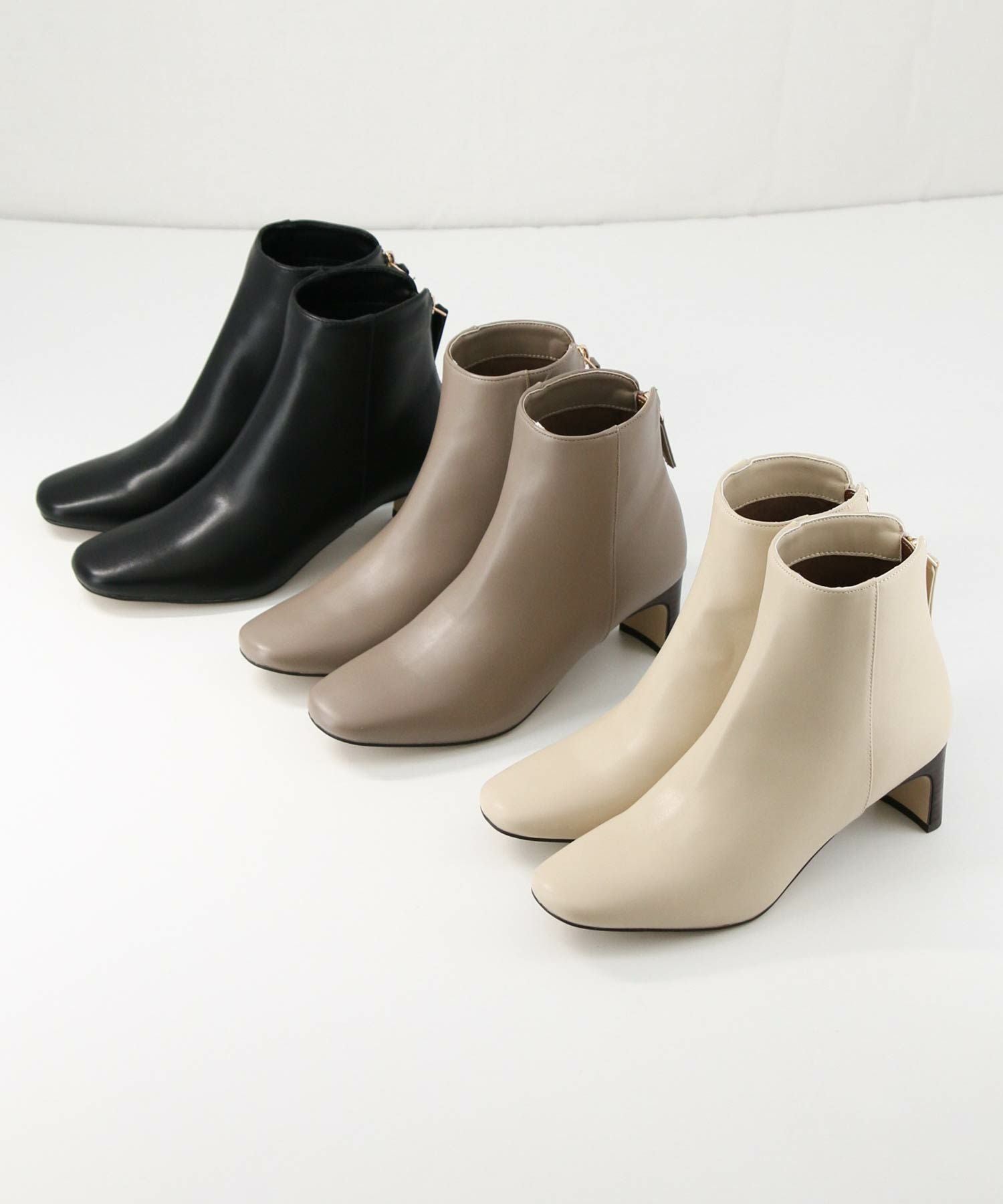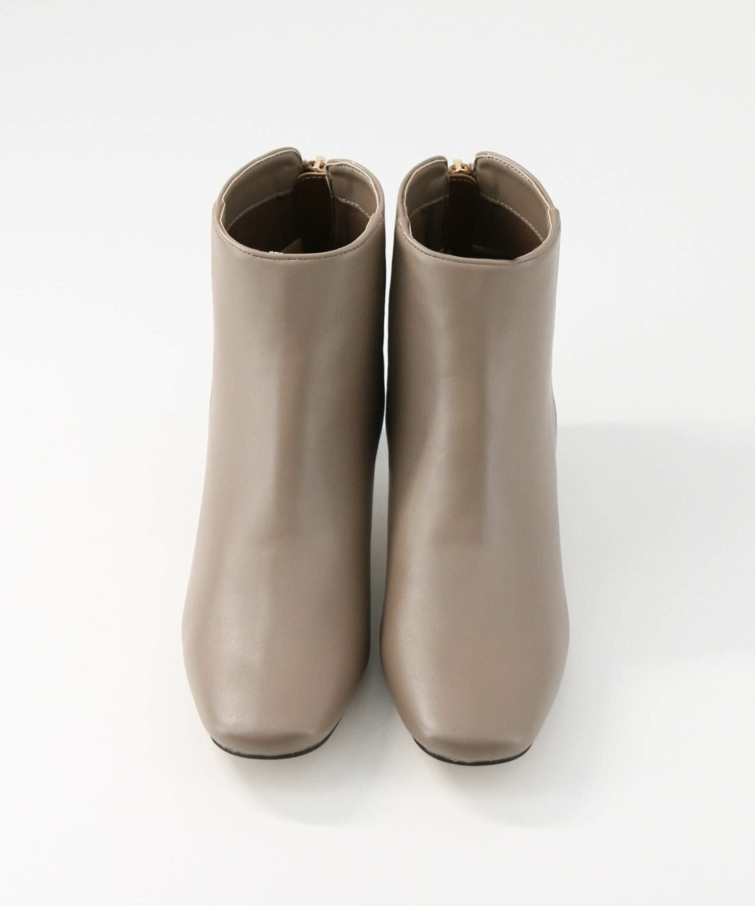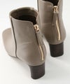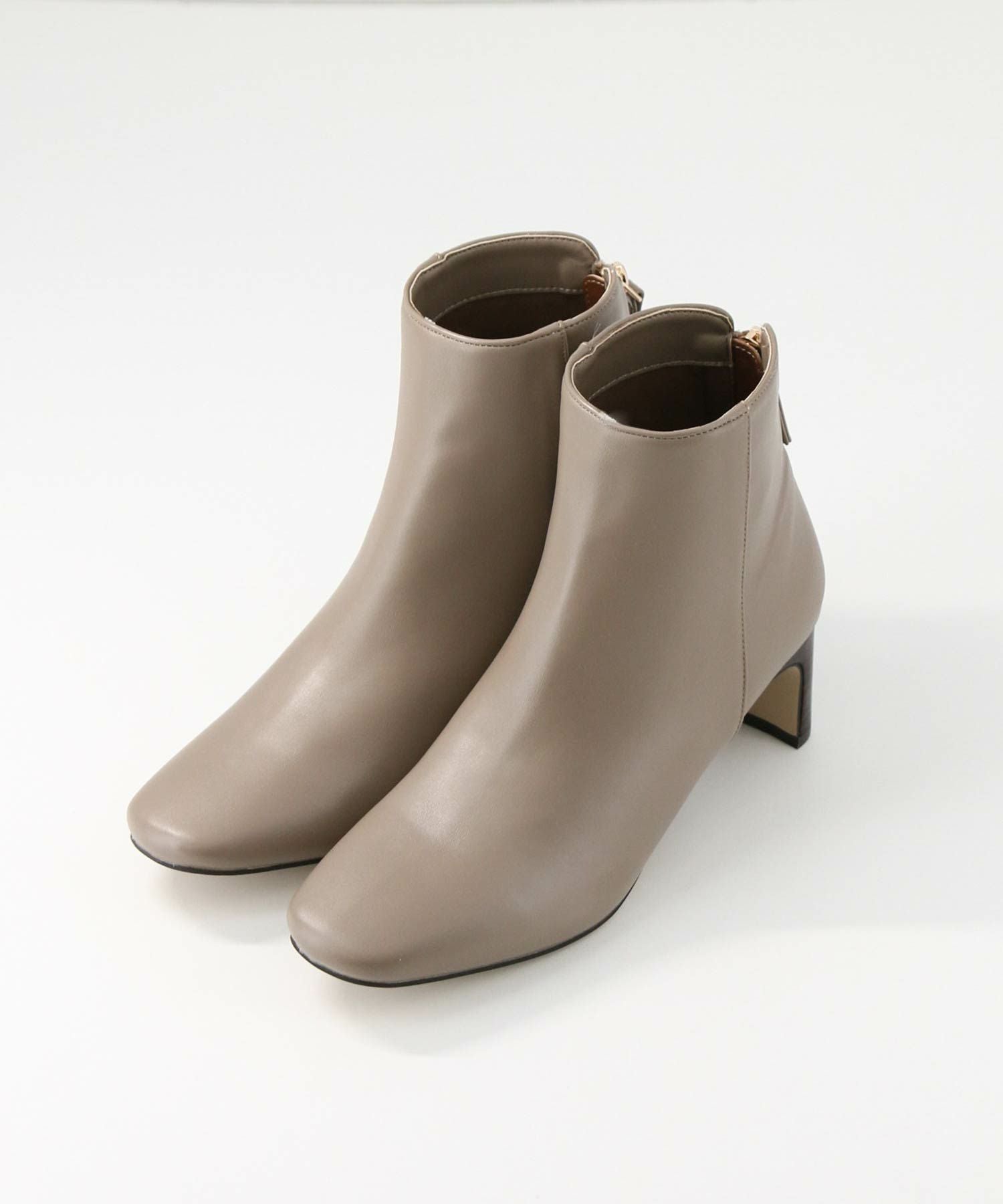 トゥの形はキープしながら後ろについたゴールドのジップがデザインアクセントになります。小柄な方でもバランスが取りやすいように長すぎず、すっきりと履けるバランスにしています。