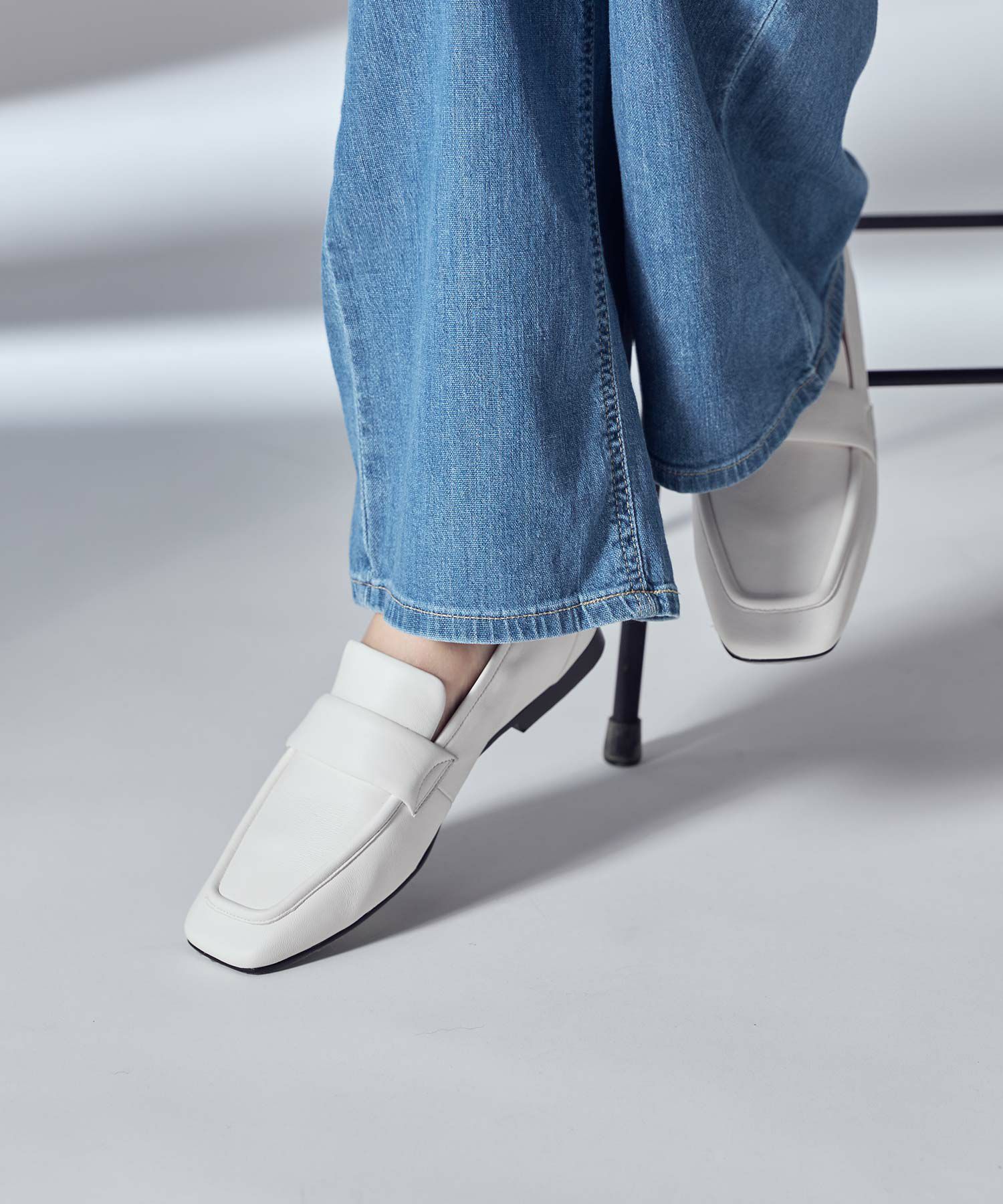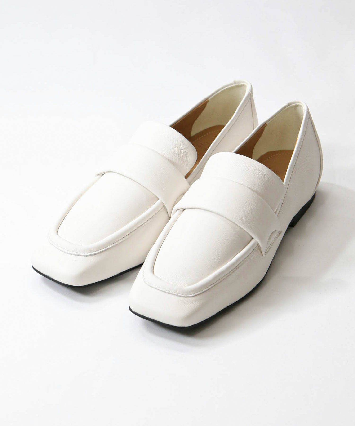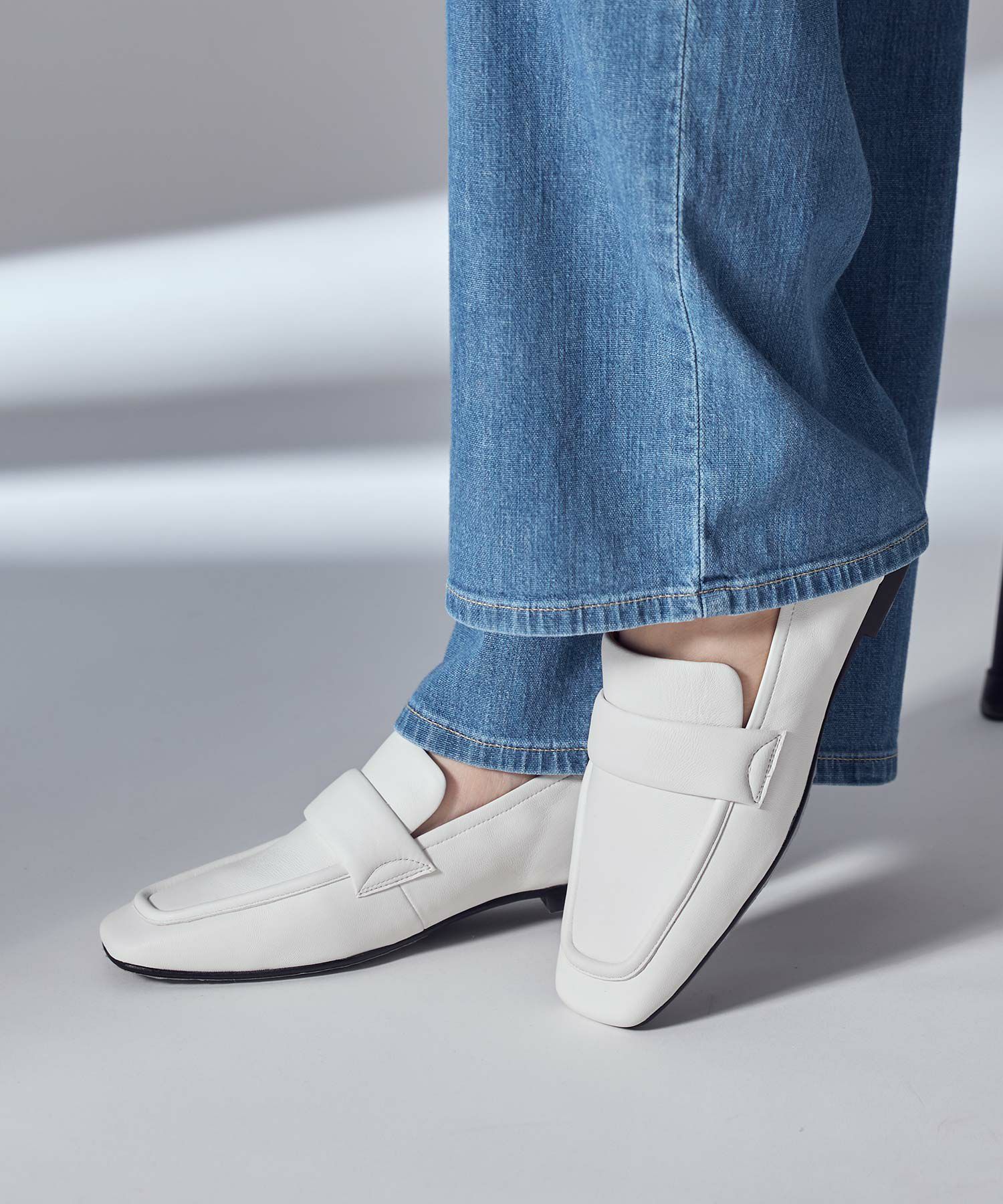 洗練されたシンプルなデザインが目を惹くフラットローファー。