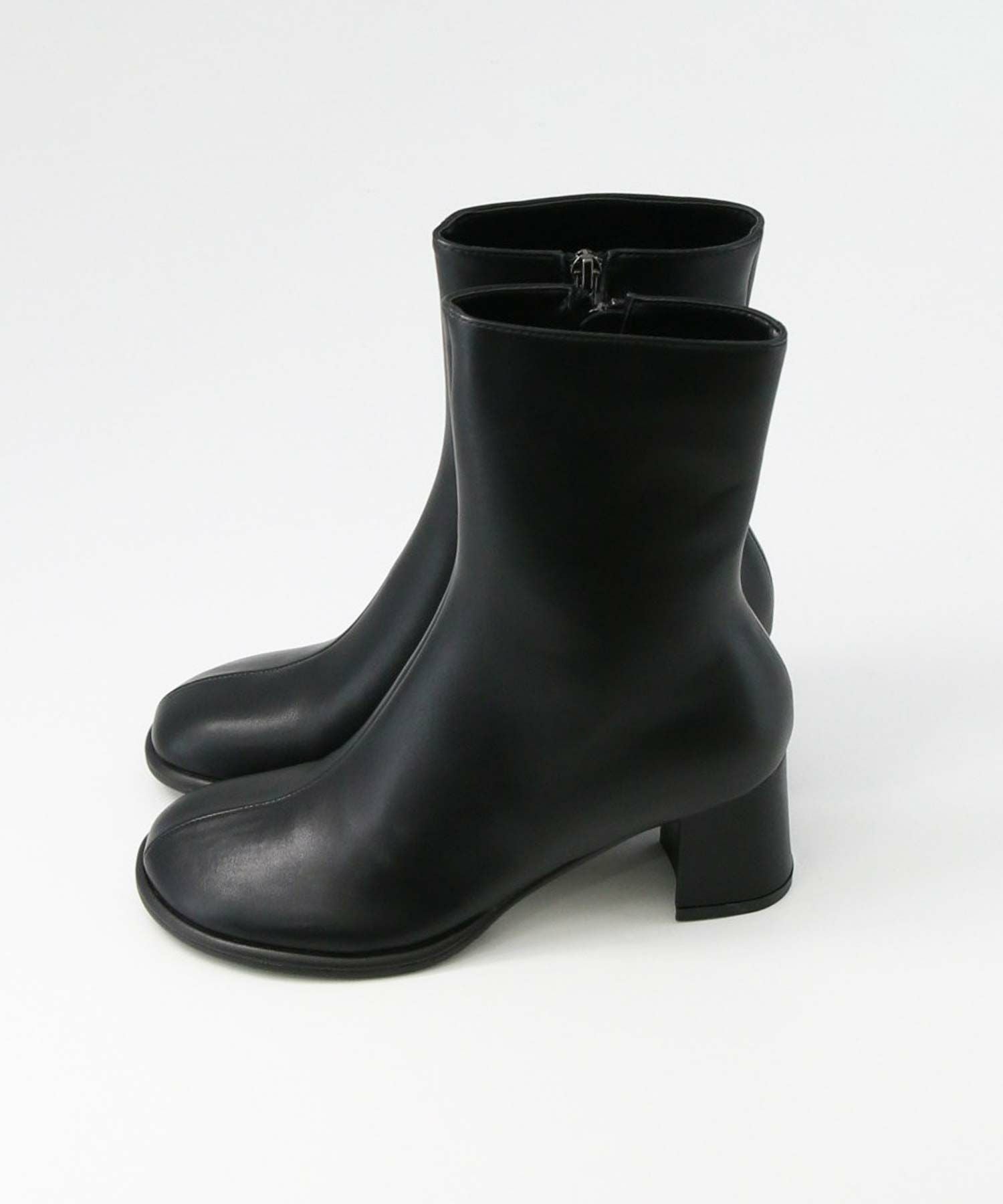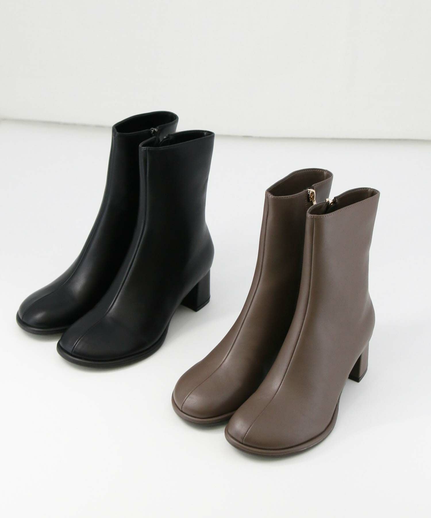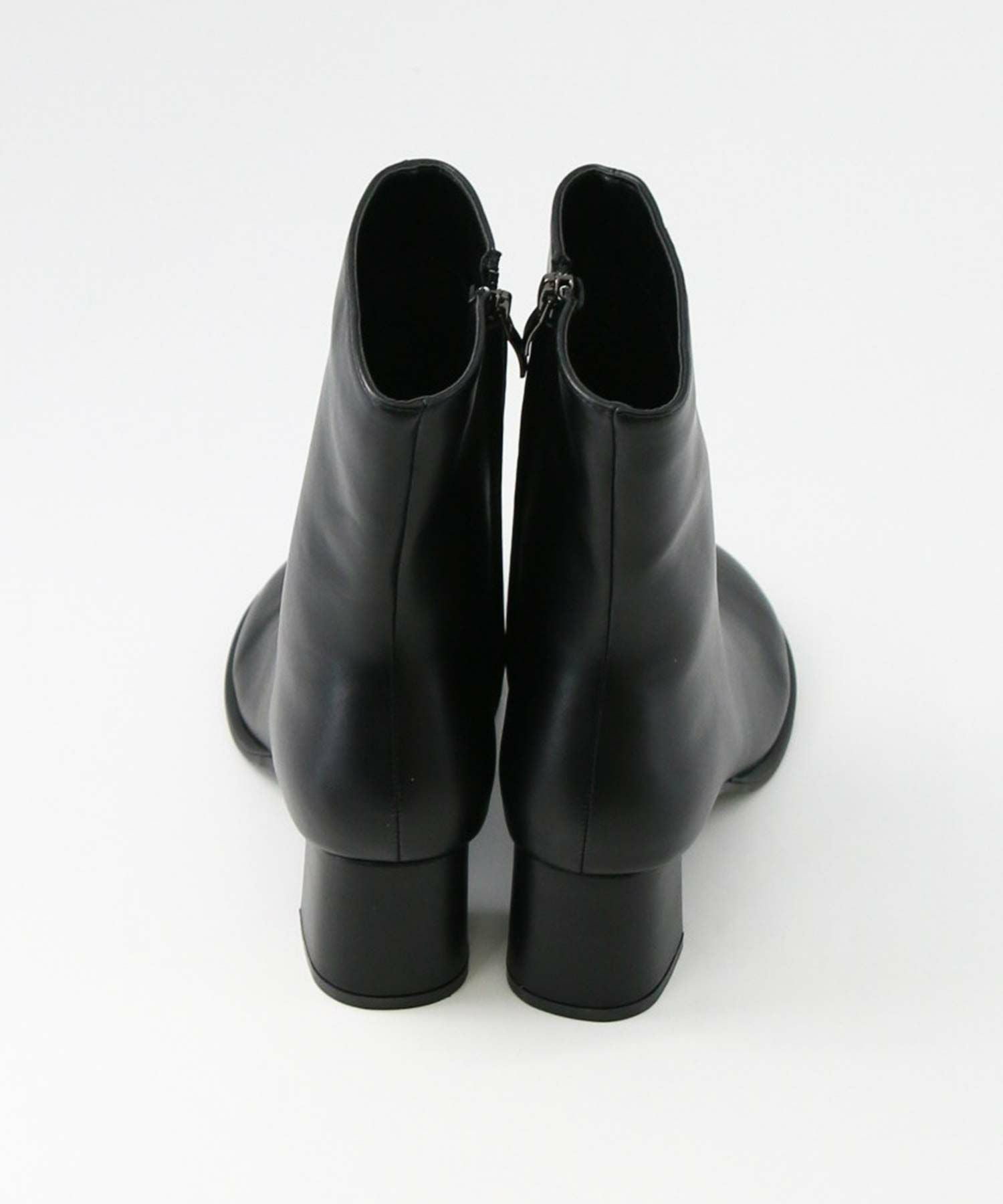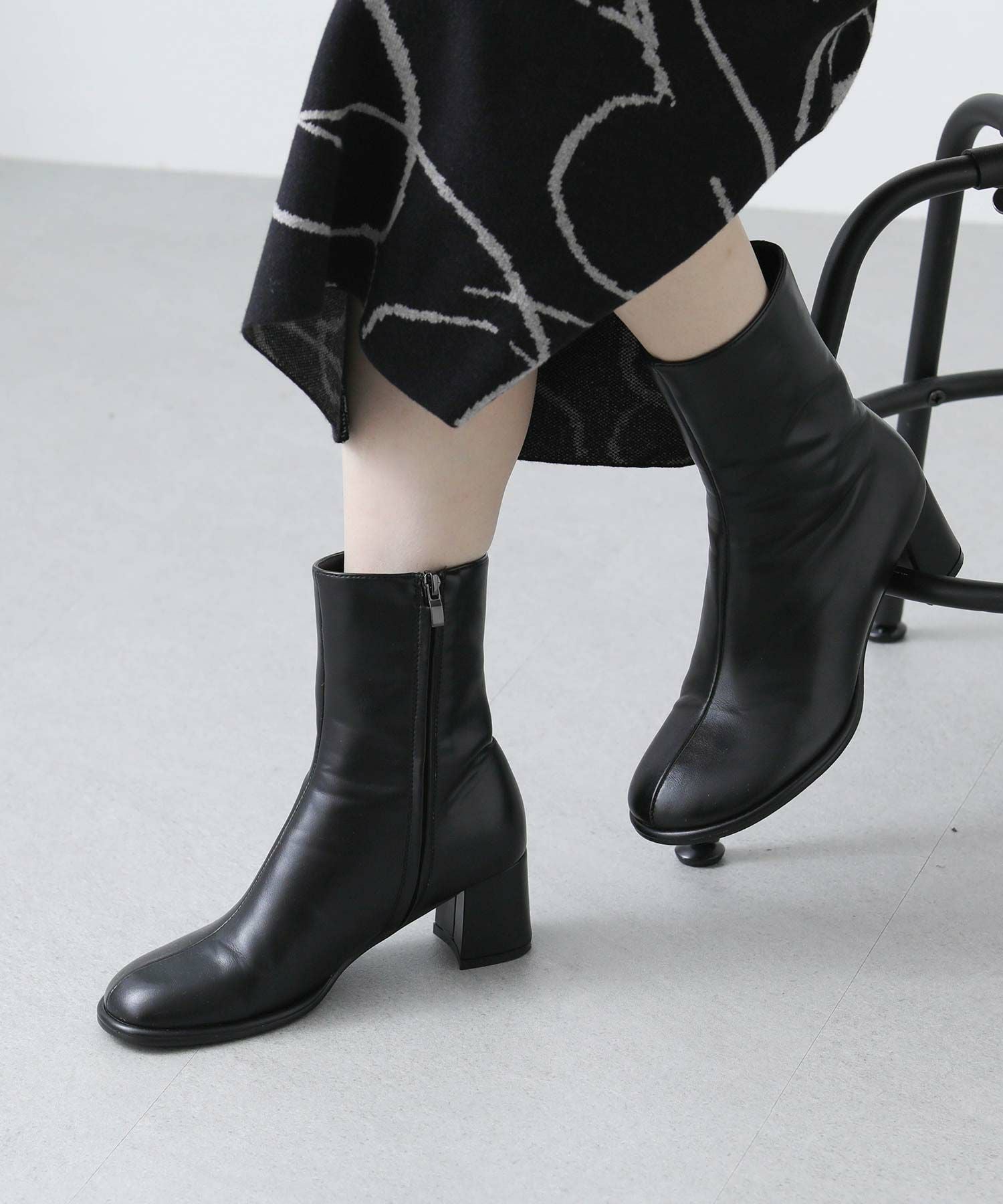 ピース付きのデザインが可愛いオブリークトゥショートブーツ。