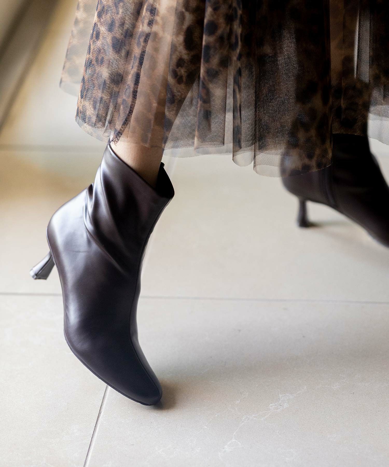すっきりとしたトゥのラインと、細身の筒がエレガントな印象のショートブーツ。