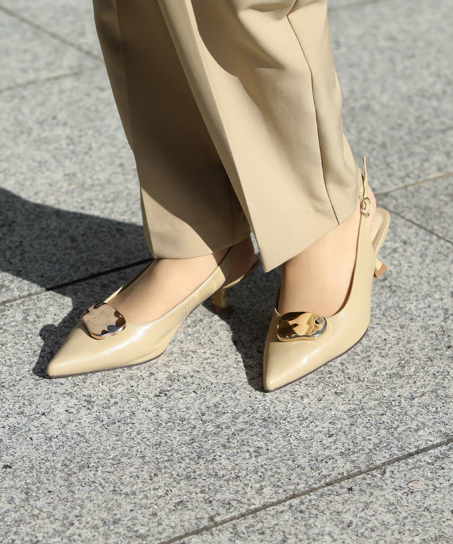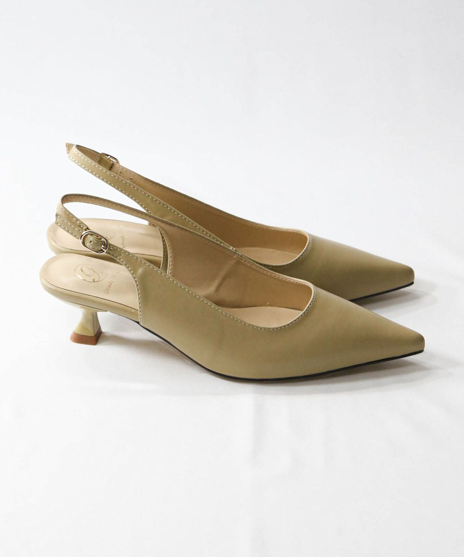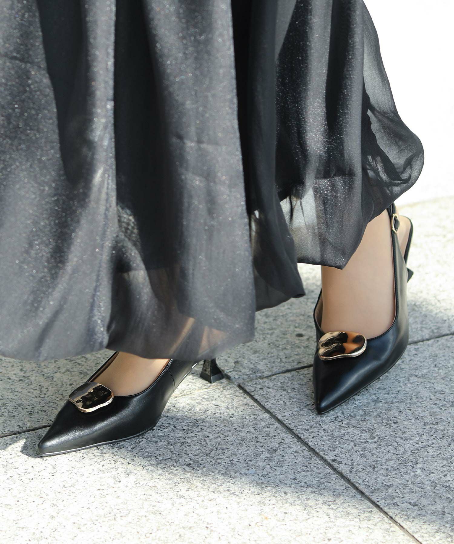 オフィスやオケージョンシーンに使いやすい、バックストラップのパンプス。
