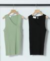斜めにカッティングされたネックラインが印象的なタンクトップ。
