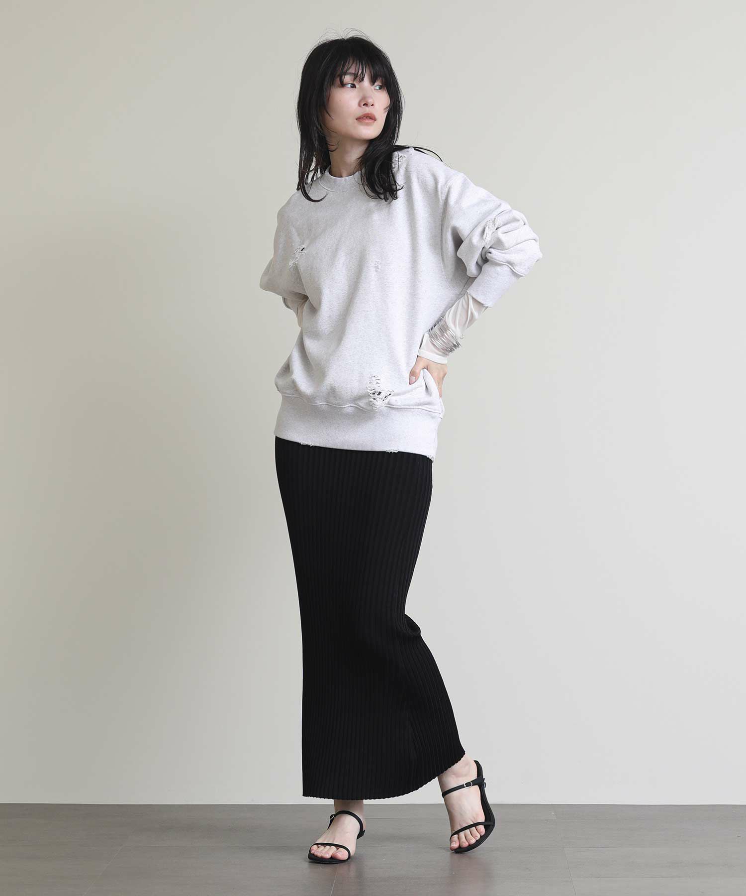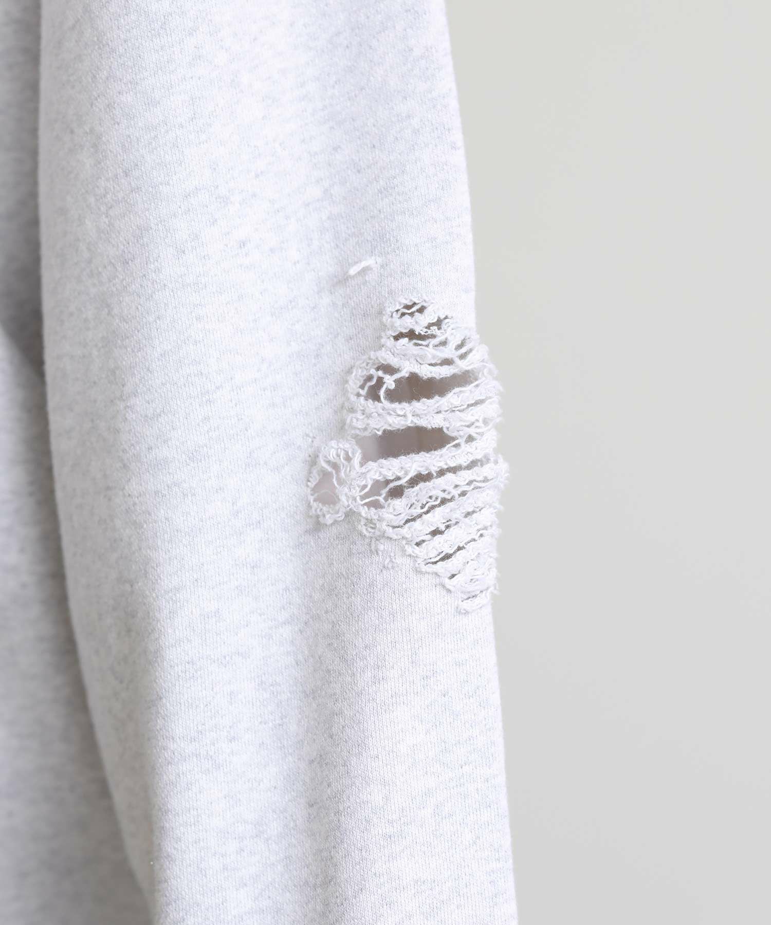 全体にハードなダメージ加工を施した遊び心溢れるスウェット。