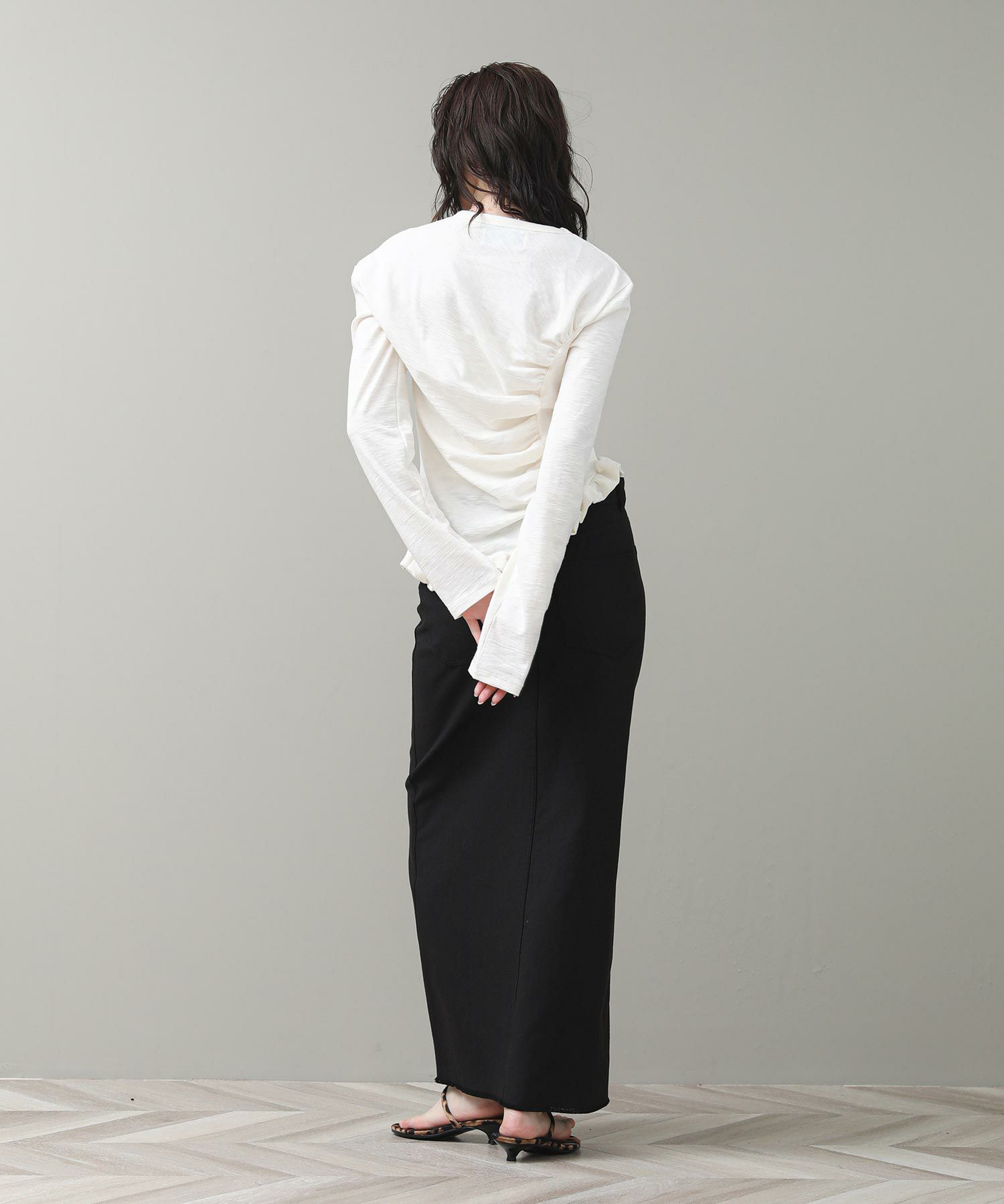 カットソーやスウェットなど日常的なアイテムにエッジの効いたデザインを加え、着心地の良さとデザイン性を両立させたアイテムが魅力のブランド。1枚で着映えるデザイントップス。デニムやスラックスなどベーシックなボトムと合わせてもモードな印象にまとまります。