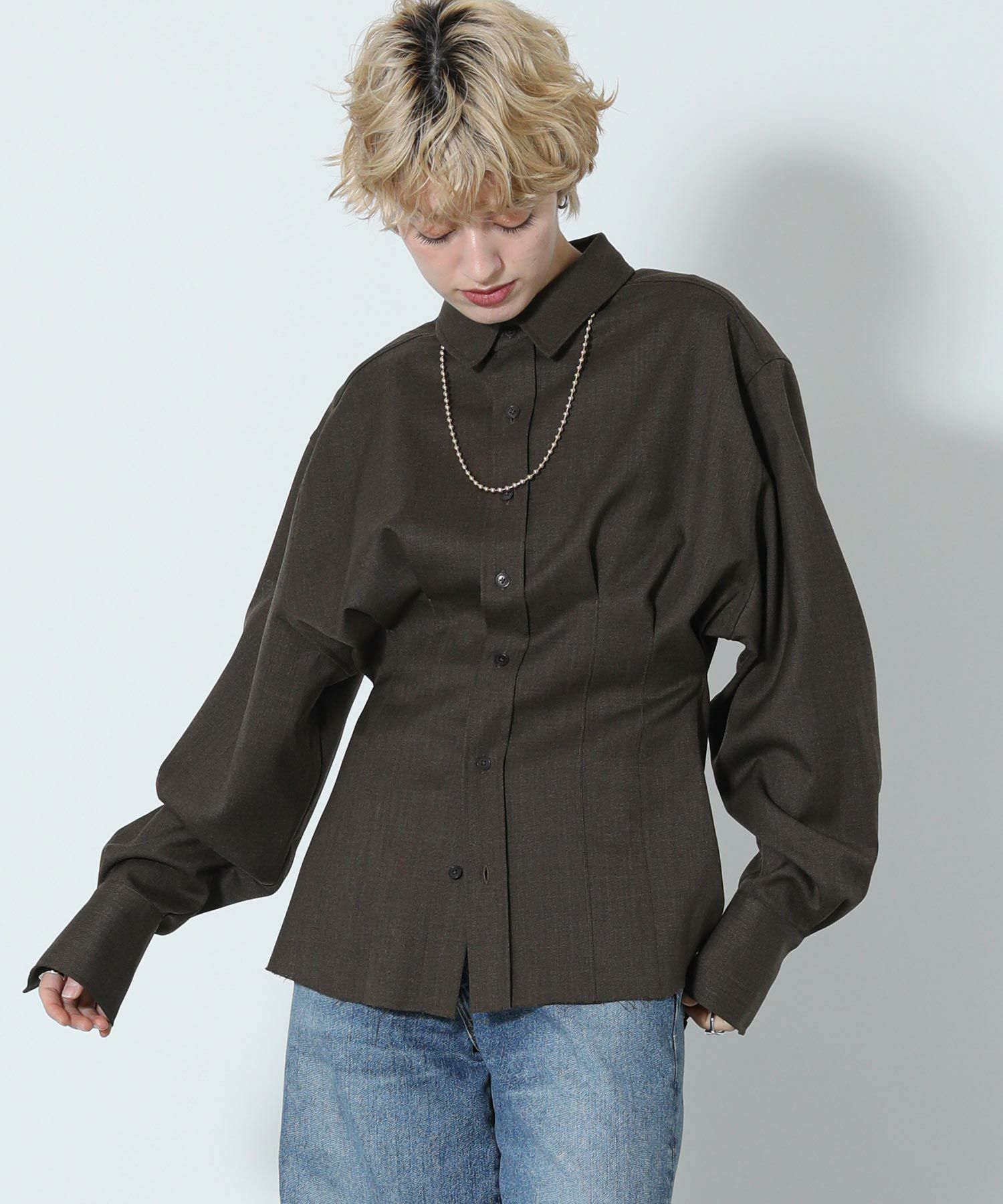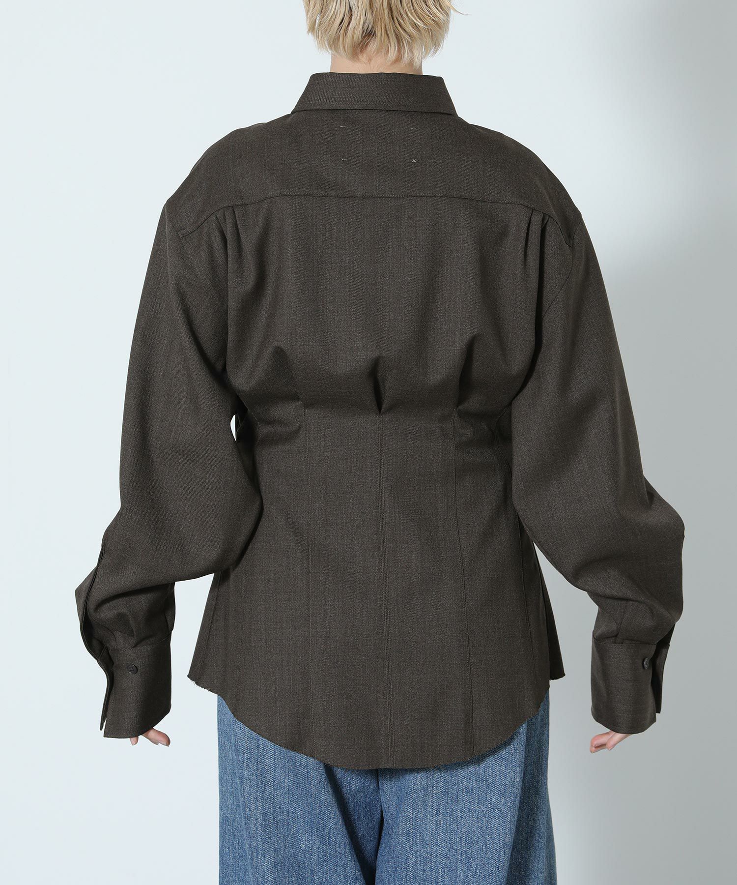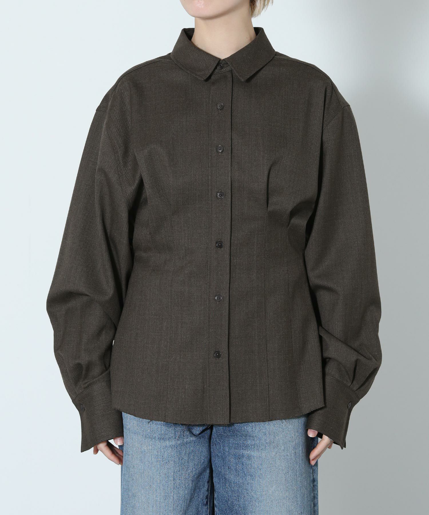 ウエスト部分がくびれたシルエットのウール混シャツ。前後にほどこしたタックや、さり気ないカフスのディテール、裾のカットオフ仕様がポイント。メンズライクな生地と、女性らしいシルエットとのバランスが絶妙な一着。ボトムのシルエットを選ばず、さまざまなスタイリングに馴染みます。上質なウール混のツイル生地を使用。