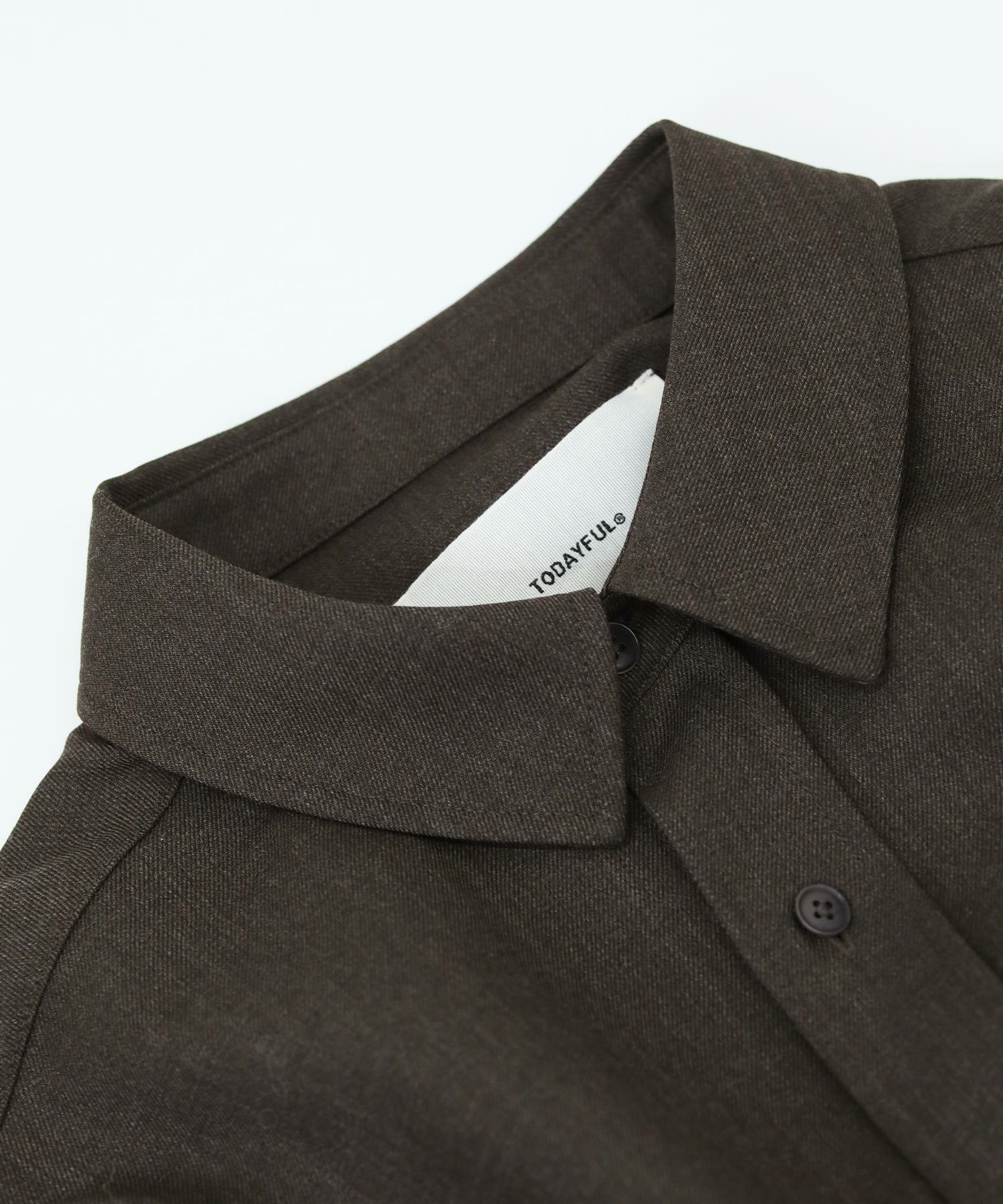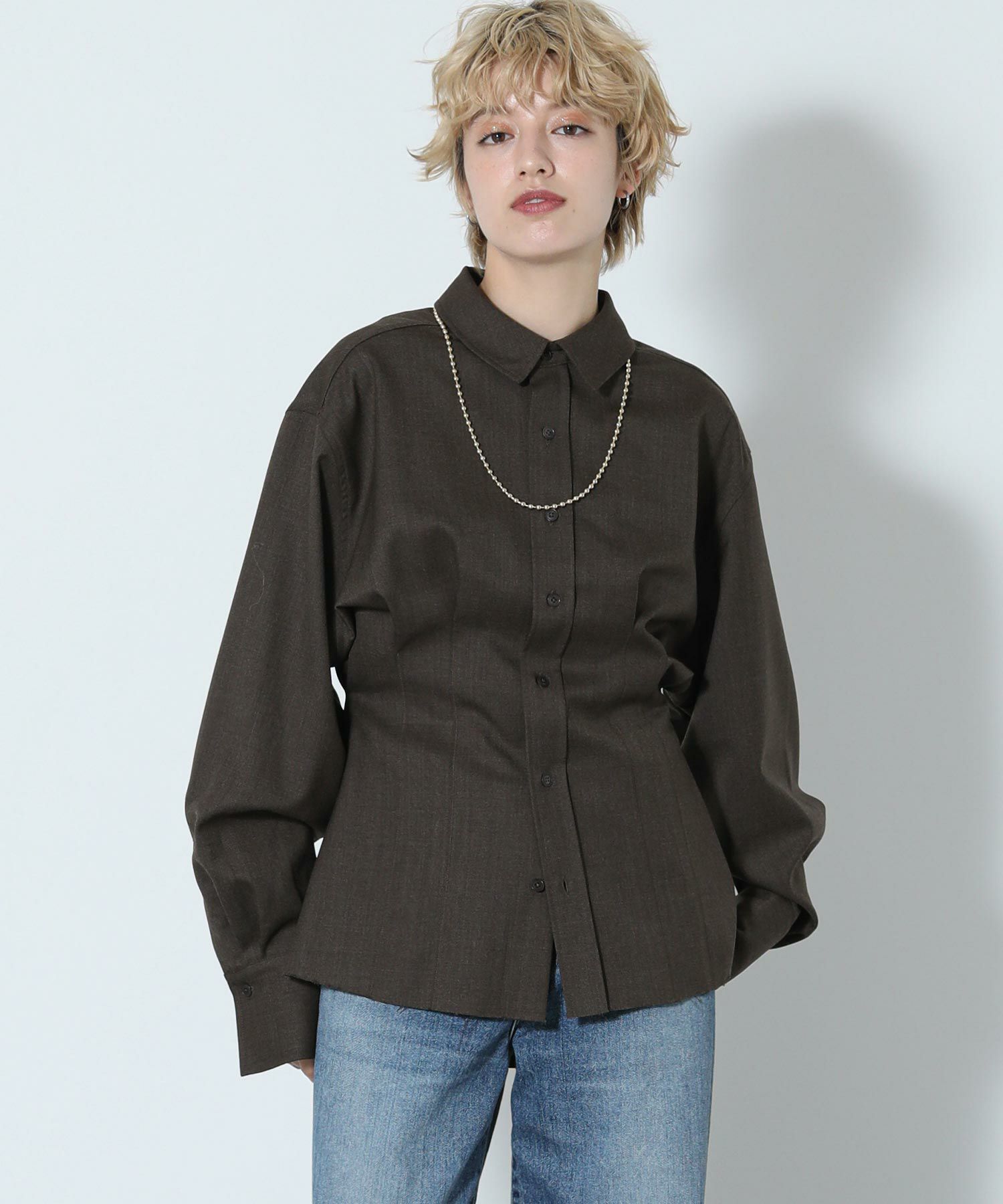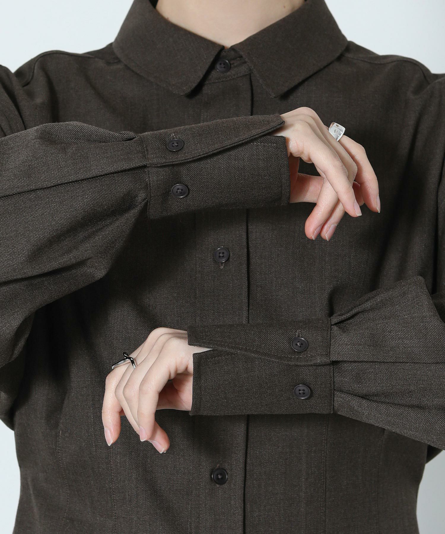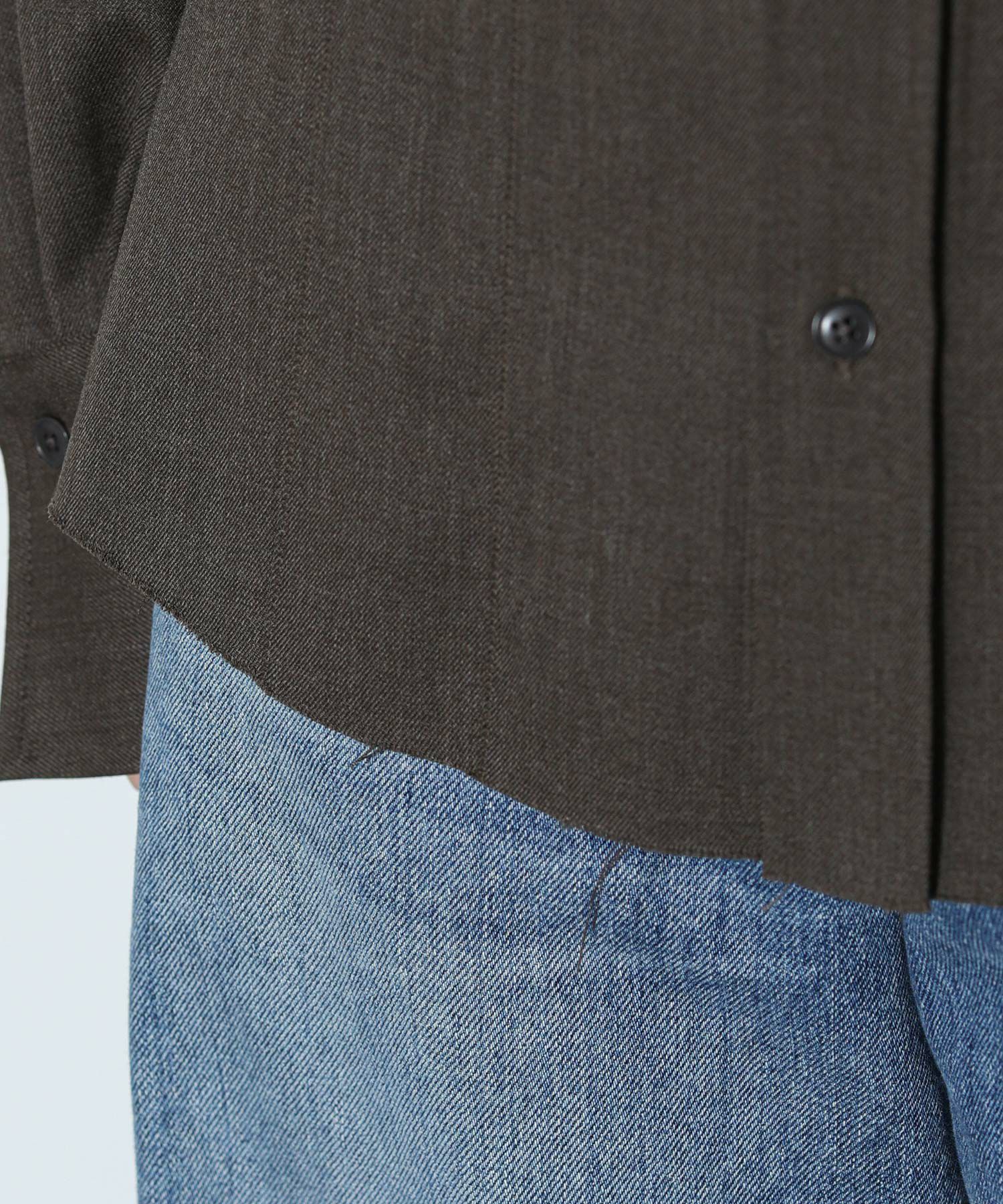 ウエスト部分がくびれたシルエットのウール混シャツ。前後にほどこしたタックや、さり気ないカフスのディテール、裾のカットオフ仕様がポイント。メンズライクな生地と、女性らしいシルエットとのバランスが絶妙な一着。ボトムのシルエットを選ばず、さまざまなスタイリングに馴染みます。上質なウール混のツイル生地を使用。