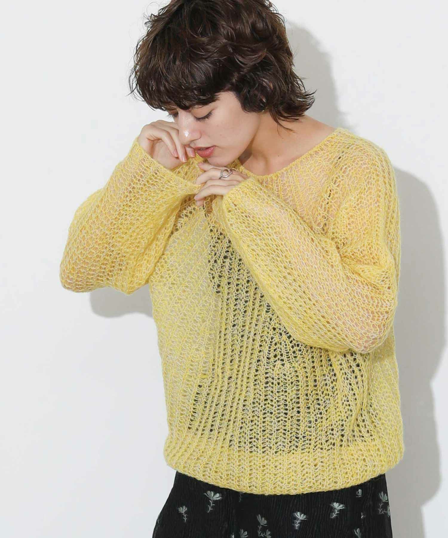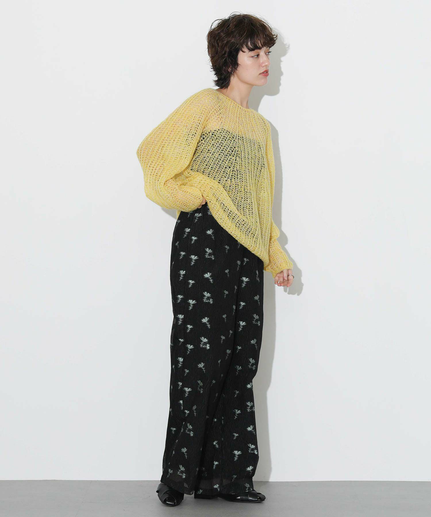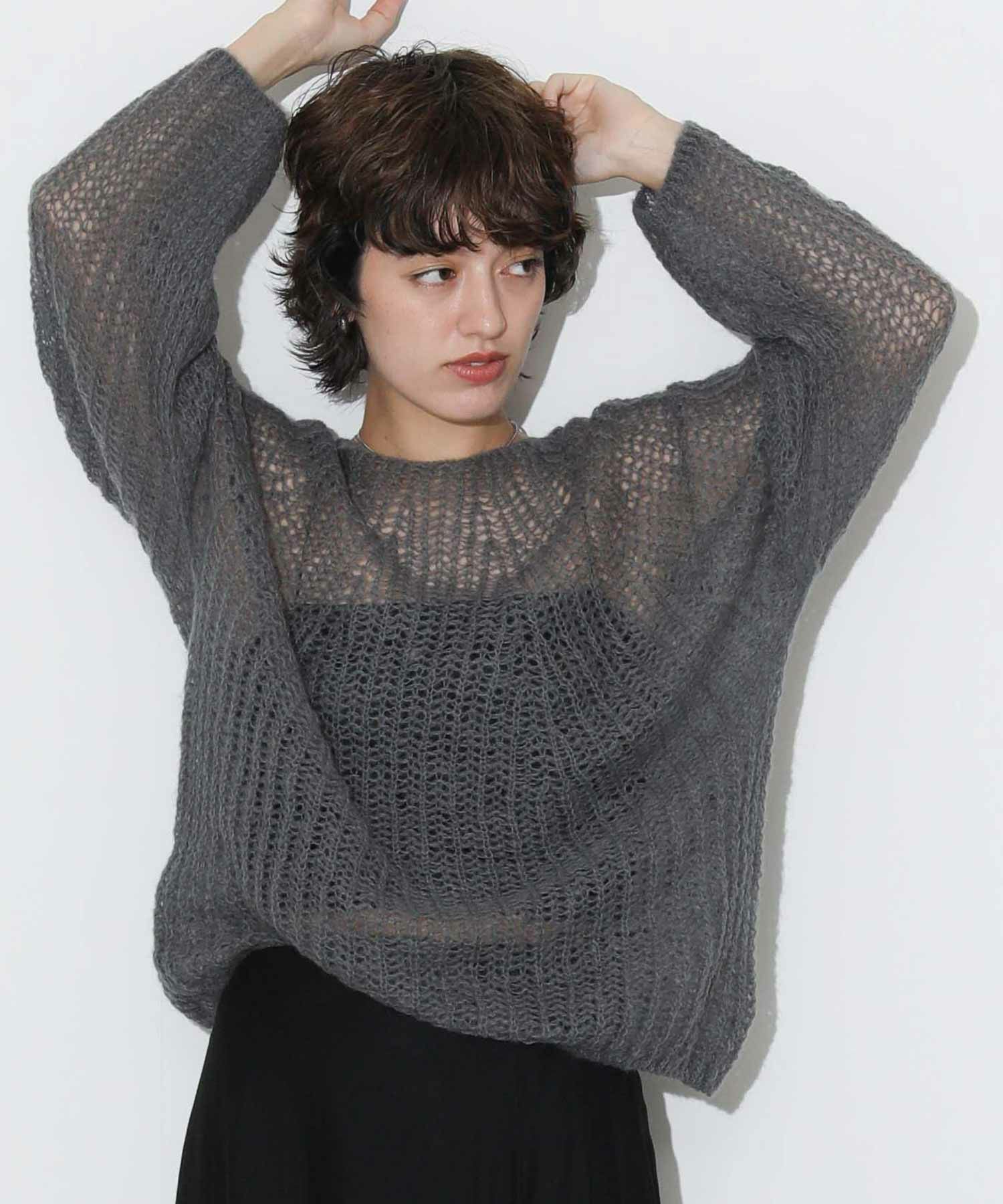 スカシ編のローゲージニットは柔らかい落ち感があり、女性らしい雰囲気に。程よくルーズなサイズ感で、レイヤードスタイルにもおすすめ。合わせるインナー次第で自分だけの着こなしが楽しめます。やや長めの丈は、ボトムスにタックインしてバランスを変化させるのもおすすめです。