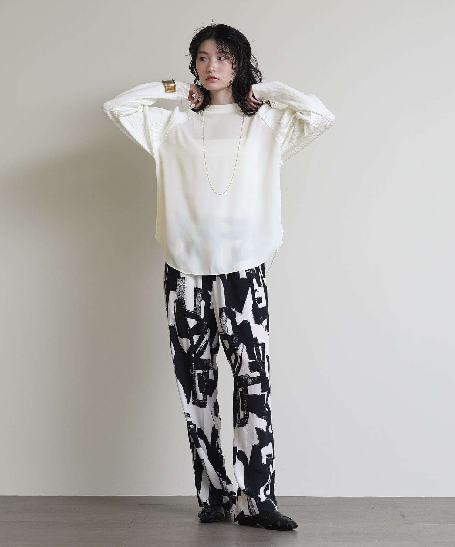 フロントはシンプルなラグランの切替えで、カジュアルな印象に。バックスタイルは、ブラウスにニットをレイヤードさせたようなデザインに仕上げました。一枚でこなれ感のある大人スタイルが完成します。