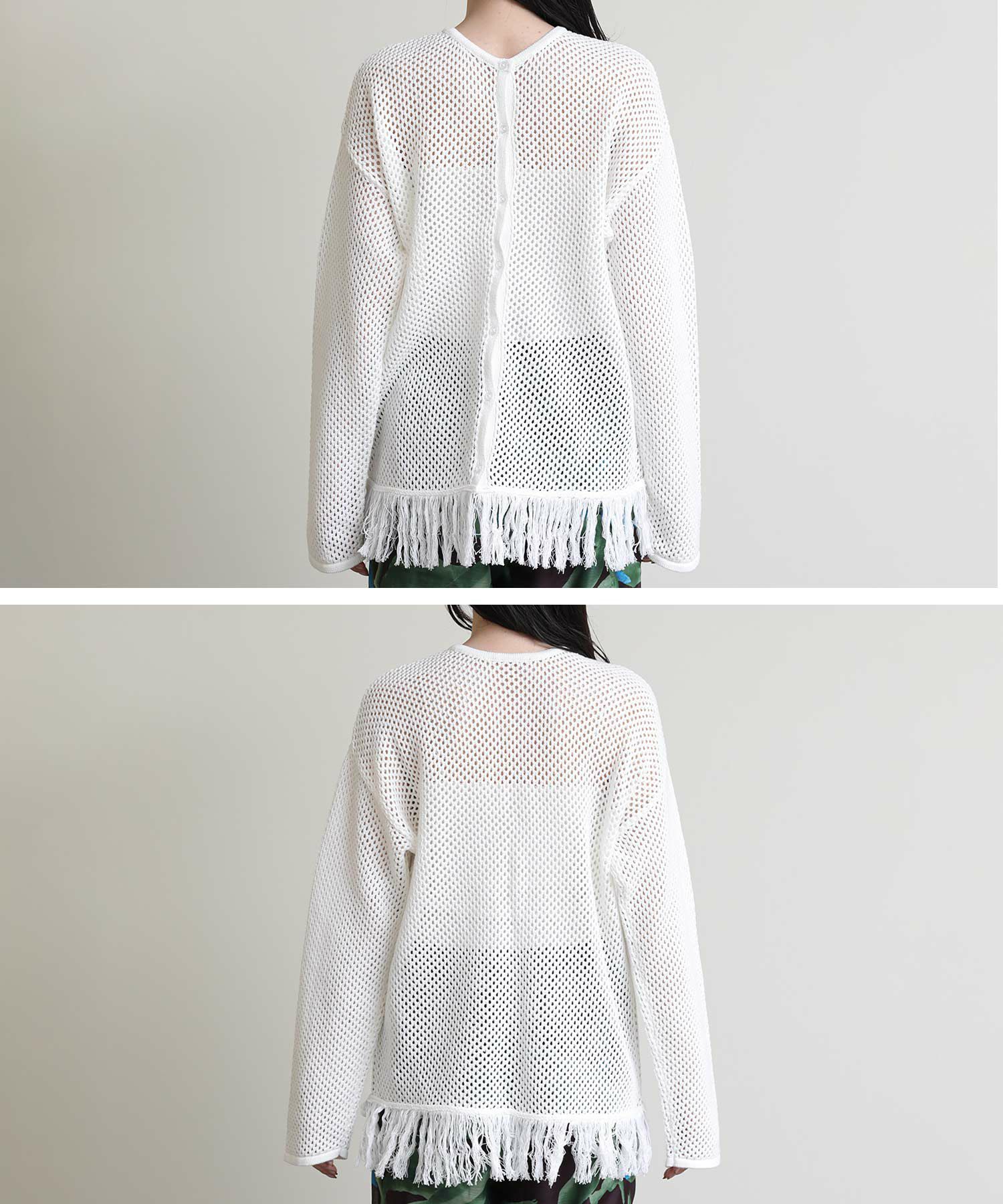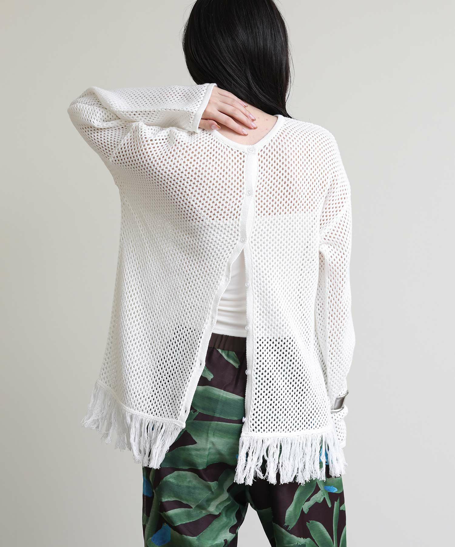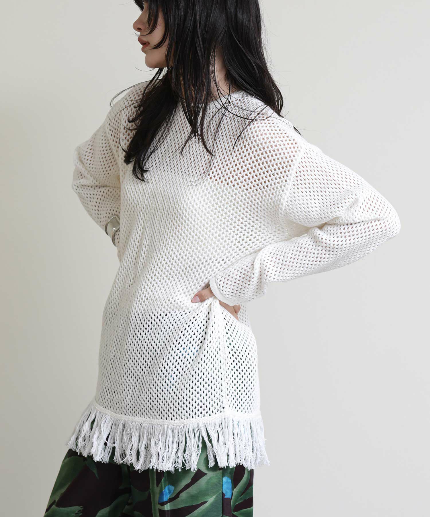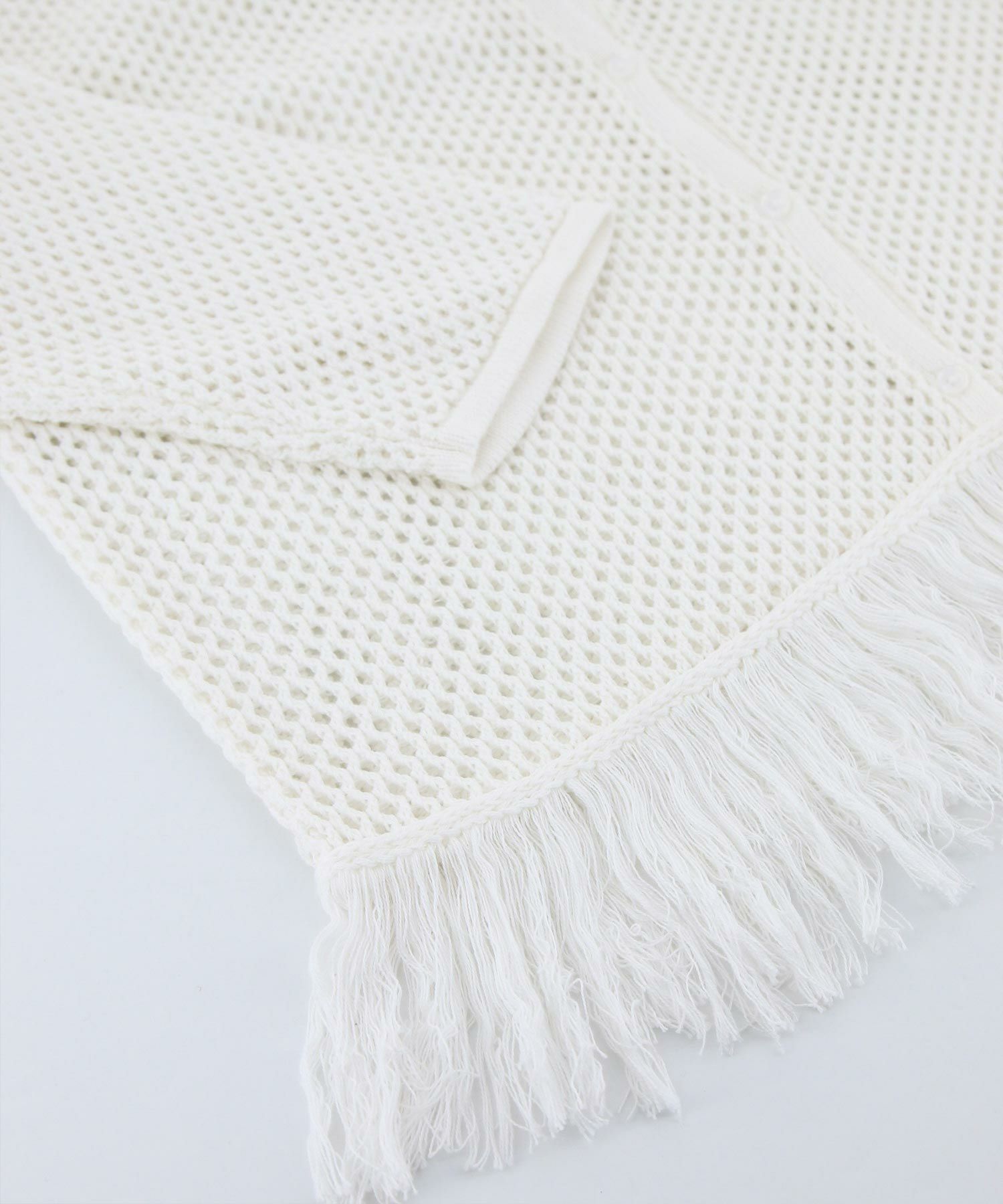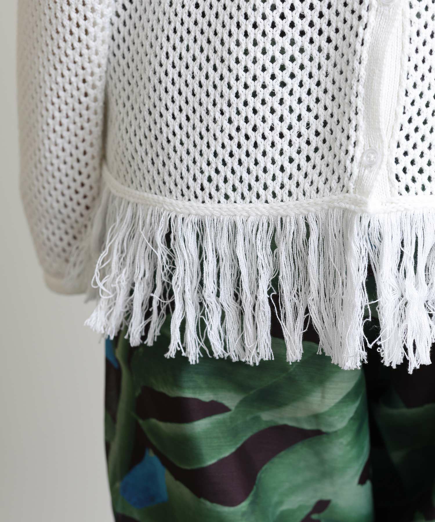 裾にフリンジがあしらわれたメッシュ編みのカーディガン。